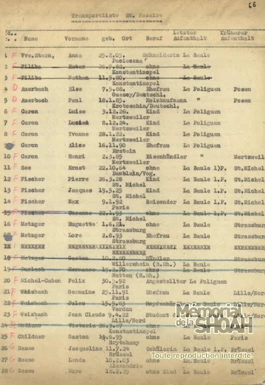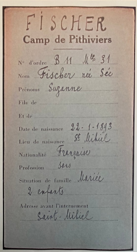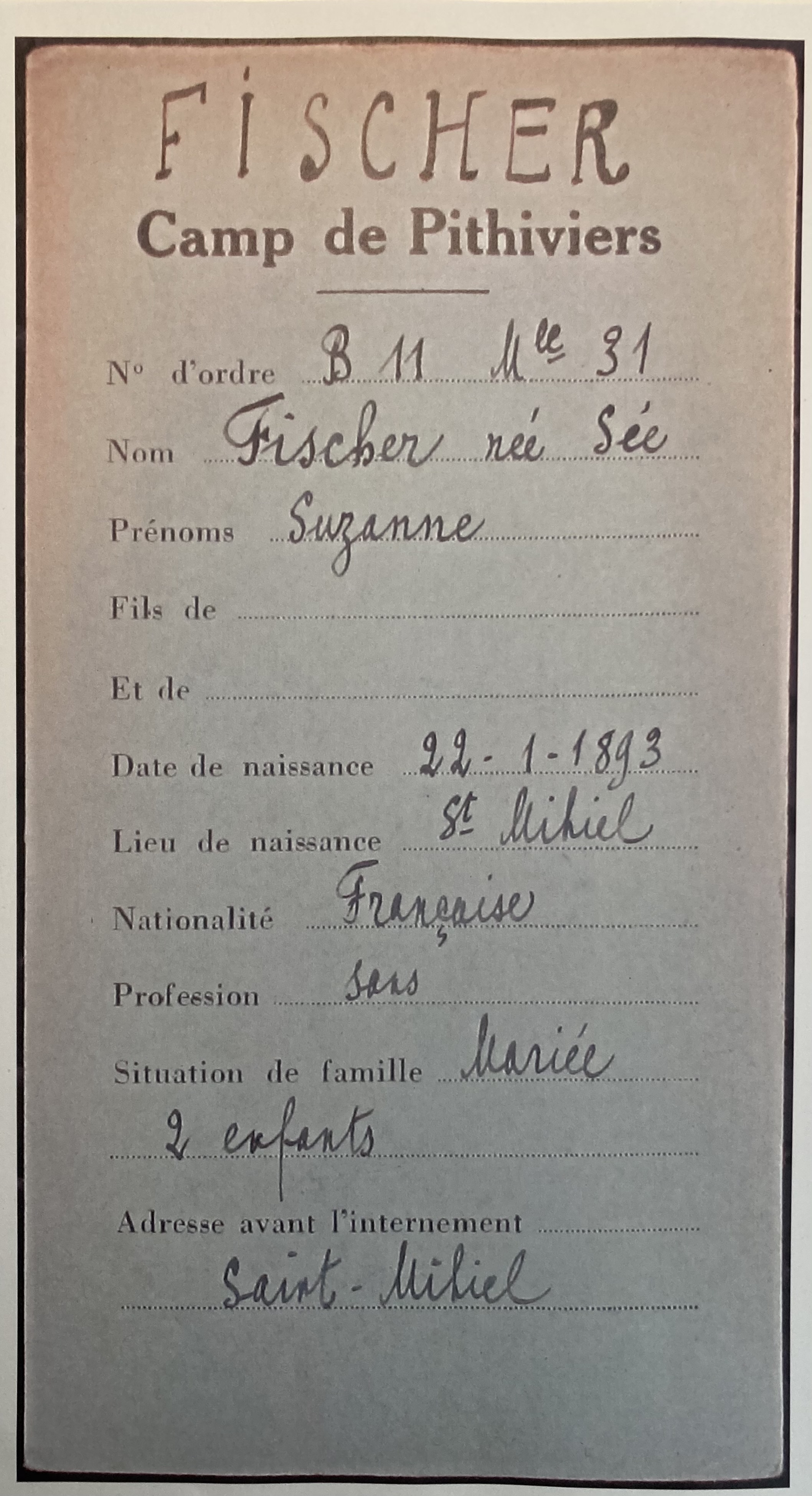 Suzanne FISCHER (49 ans) et son père Ernest SEE (77 ans) sont débarqués à Drancy. Ils seront dirigés vers le camp de Pithiviers le 01 septembre 1942 puis déportés par le convoi numéro 35 de Pithiviers vers Auschwitz le 21 septembre 1942. Ils ont été déclarés décédés 5 jours après l’arrivée du convoi soit le 26 septembre 1942 au Journal Officiel de la République Française.