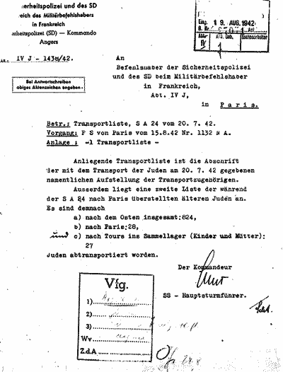A Angers, le départ du convoi est prévu pour le 20 juillet 1942. Une liste de 827 personnes est établie (hommes, femmes, enfants, nourrissons, vieillards, français et étrangers). Les enfants de moins de 16 ans (ou 14 ans) et les personnes de plus de 55 ans (ou 60 ans) ne sont pas déportables à ce moment-là. 28 personnes sont rayées de la liste du convoi (enfants avec une personne adulte qui les accompagne, souvent la mère) dirigées vers le camp de la Lande à Monts près de Tours) tandis que 29 autres sont débarquées à Drancy.