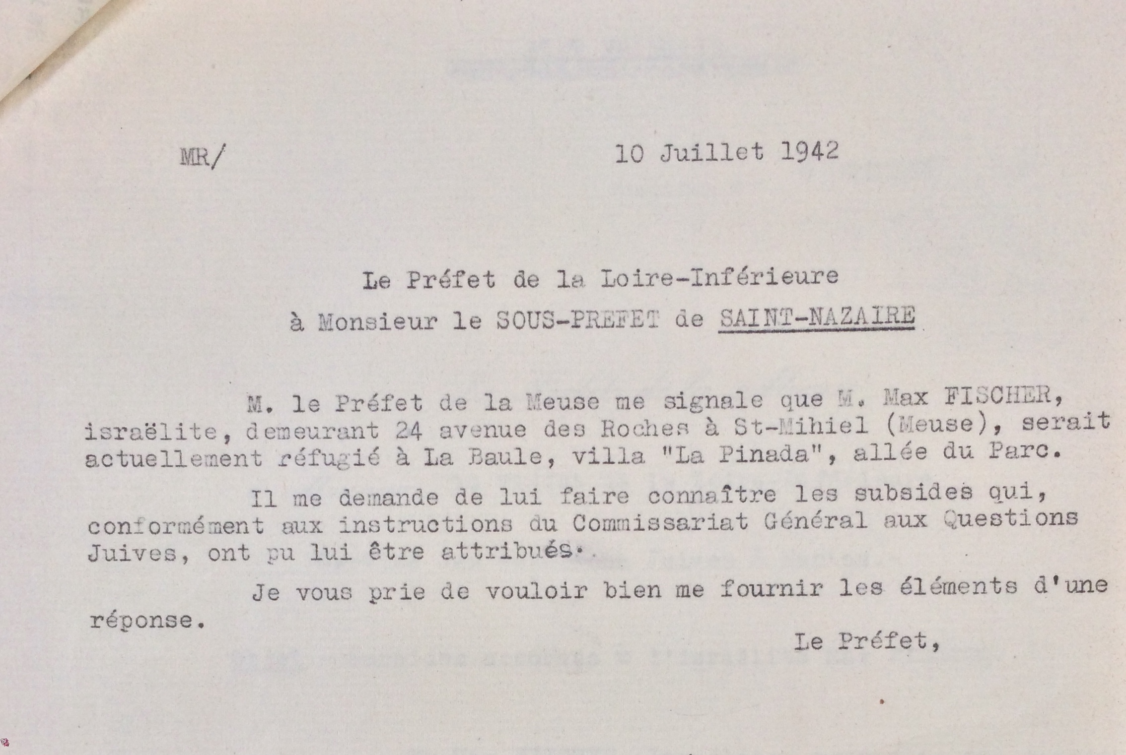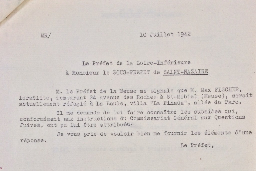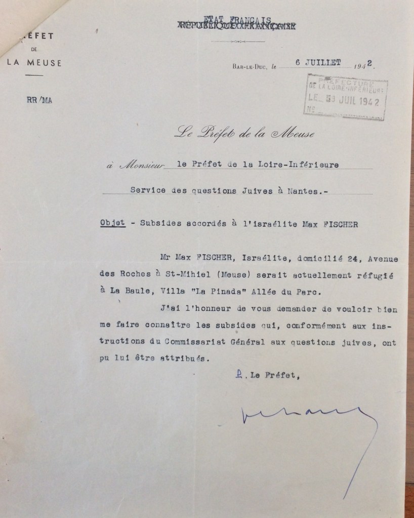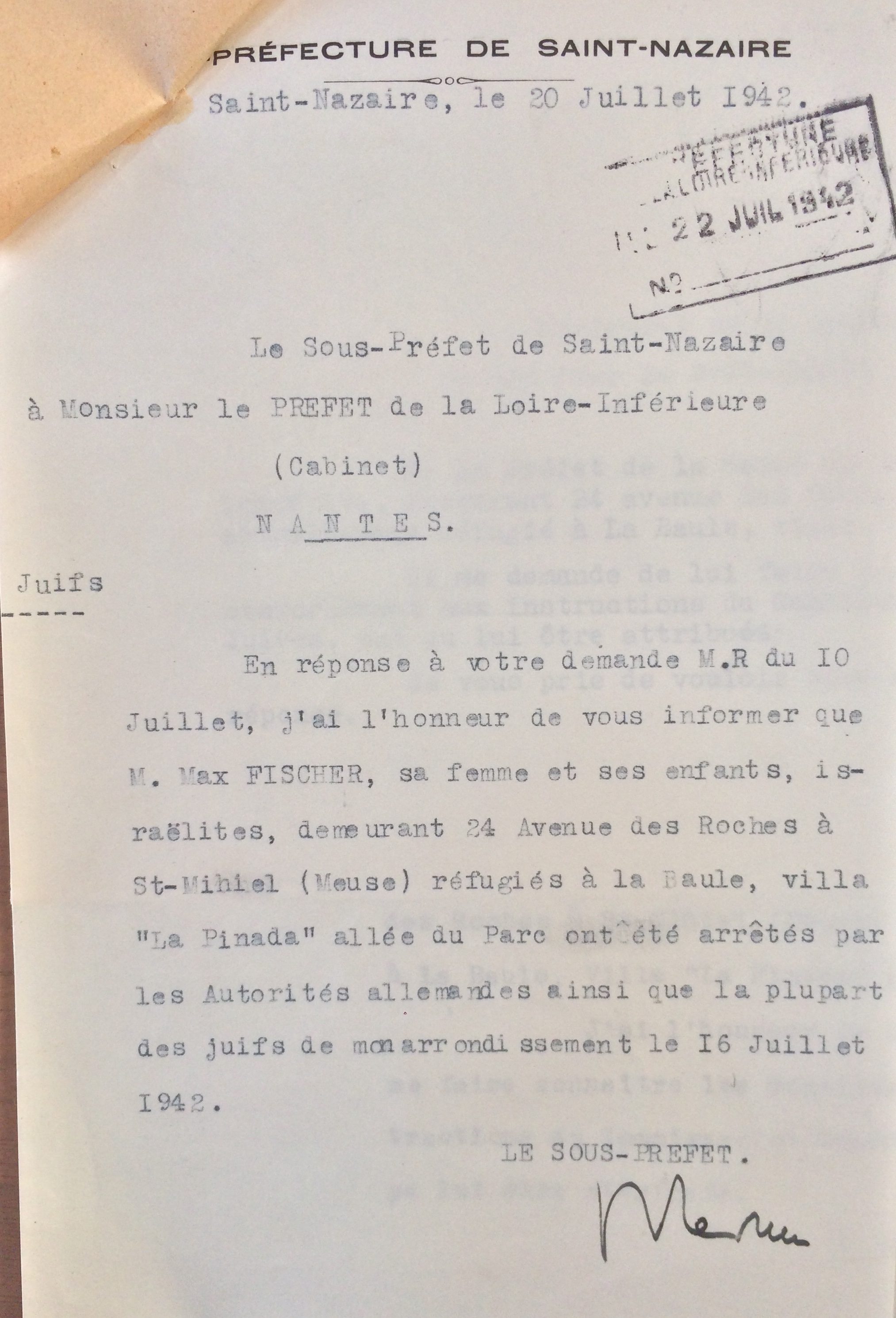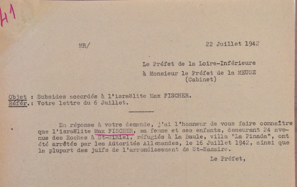 Dans le même temps, le préfet de la Meuse demande des renseignements auprès de la Préfecture de Loire-Inférieure au sujet de la famille FISCHER où il est précisé que celle-ci a été arrêtée le 16 juillet 1942.