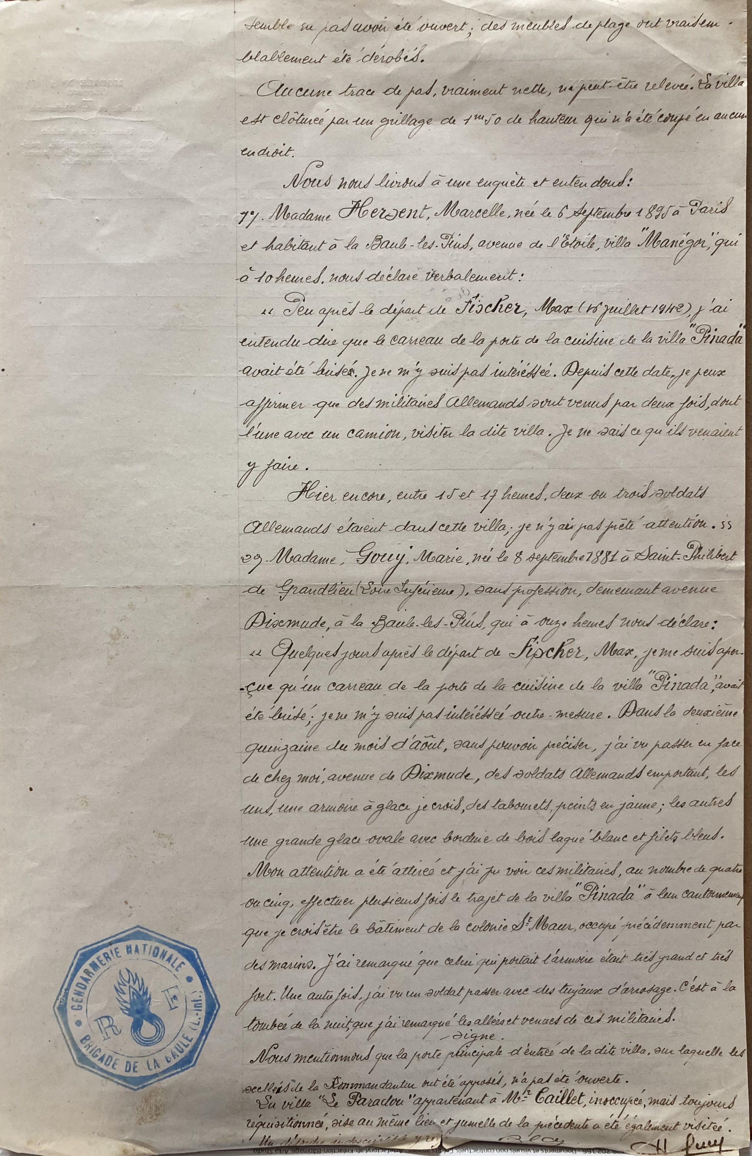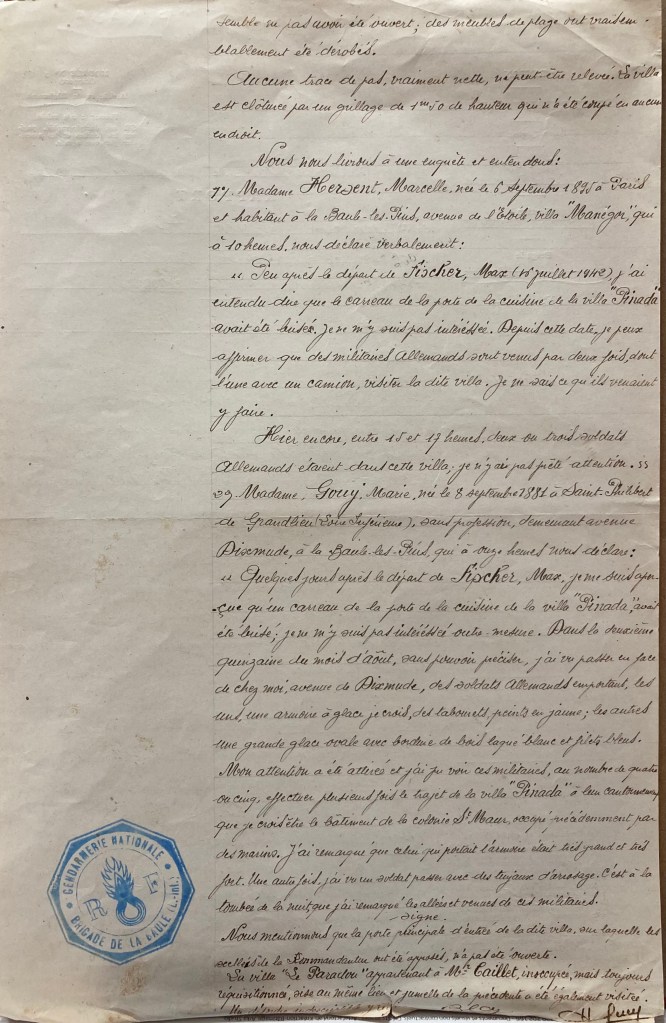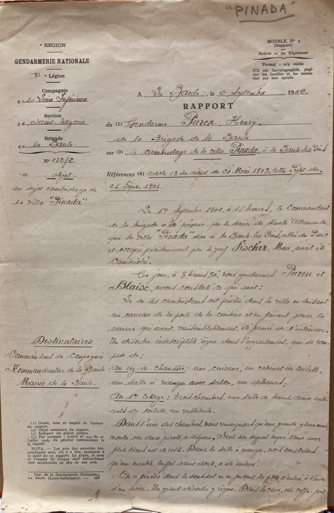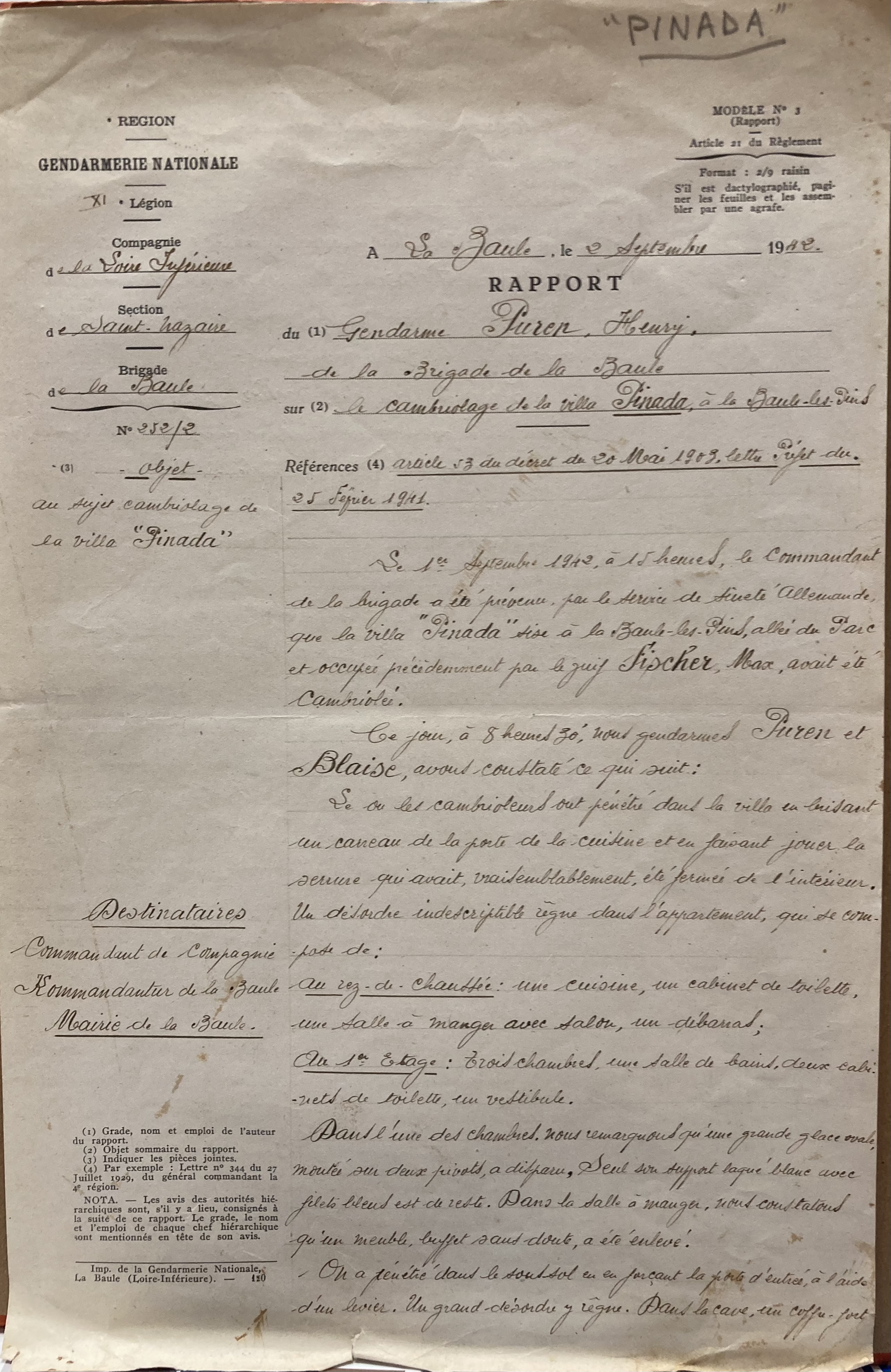 La villa La Pinada est pillée intégralement peu après le départ de la famille Fischer. Prévenu par la police allemande, le gendarme Henry Puren de la brigade de La Baule constate à la fois le cambriolage et le pillage de la villa. Les deux témoins interrogés affirment qu’à plusieurs reprises les soldats allemands ont visité la villa et que par ailleurs, la villa jumelle, Le Paradou appartenant à Monsieur CAILLET a également été cambriolée.