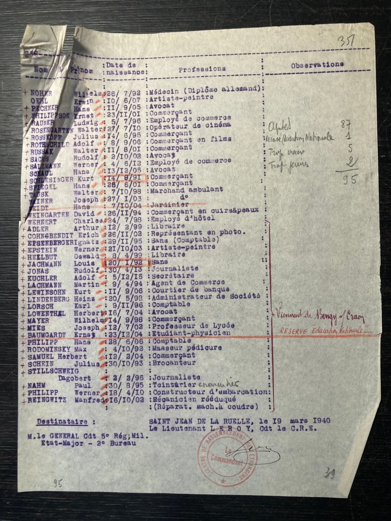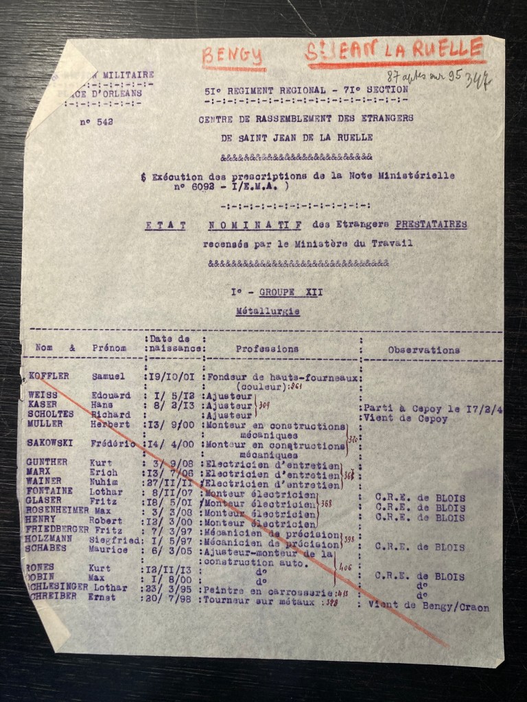 En décembre 1939, Hans SCHAUL est interné en tant que ressortissant allemand dans le Centre de Rassemblement des Etrangers, groupe 9 à Saint-Jean de la Ruelle près d’Orléans (sans doute interné dès septembre 1939). En avril 1940, les étrangers internés sont classés par groupe intéressant le Ministère de la Production Industrielle pour être affectés dans le secteur industriel (ou le secteur agricole). Hans dont la profession d’avocat est renseignée est classé dans le groupe professionnel des Manoeuvres.