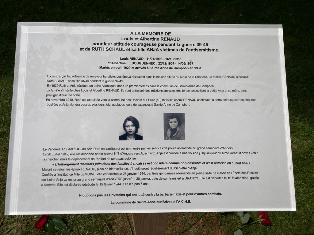 Le 08 mai 2025 a eu lieu la pose d’une plaque à l’initiative des membres de l’association historique de Sainte-Anne sur Brivet en mémoire de la présence de Ruth et Anja présentes dans la commune pendant plus d’un an en présence du maire de Sainte-Anne, Jacques BOURDIN.