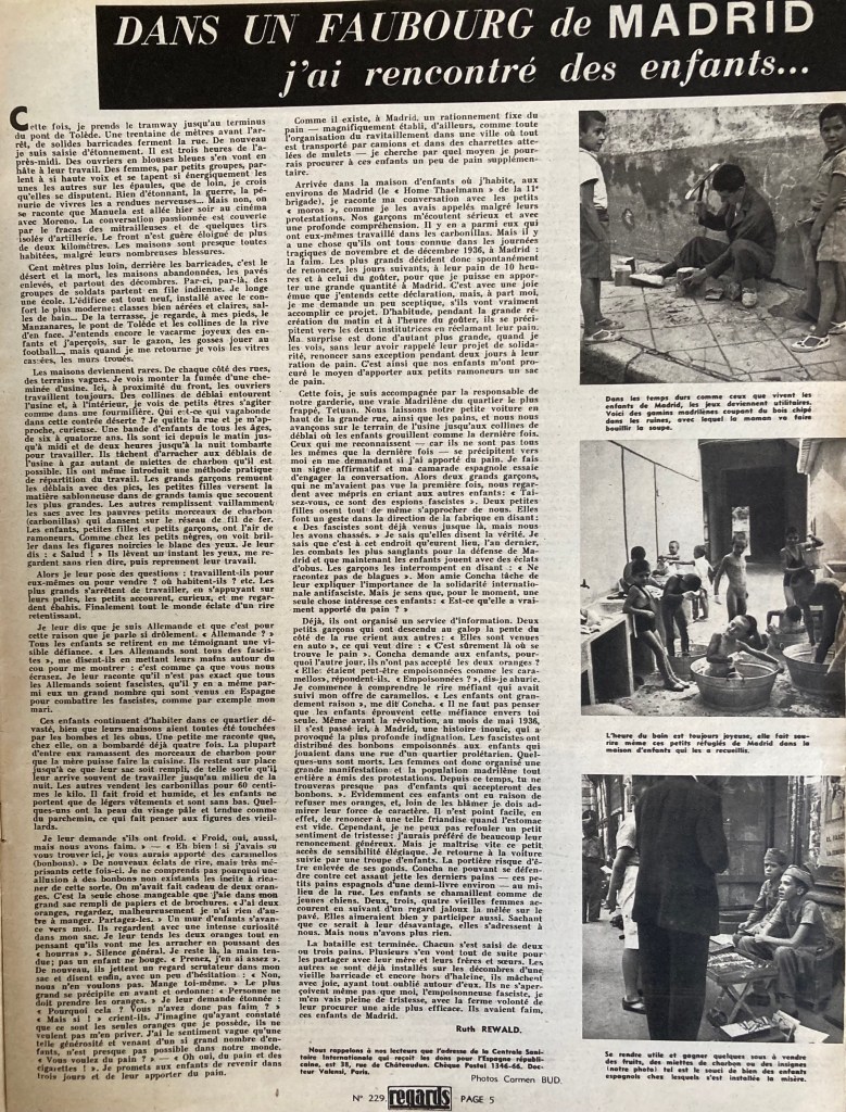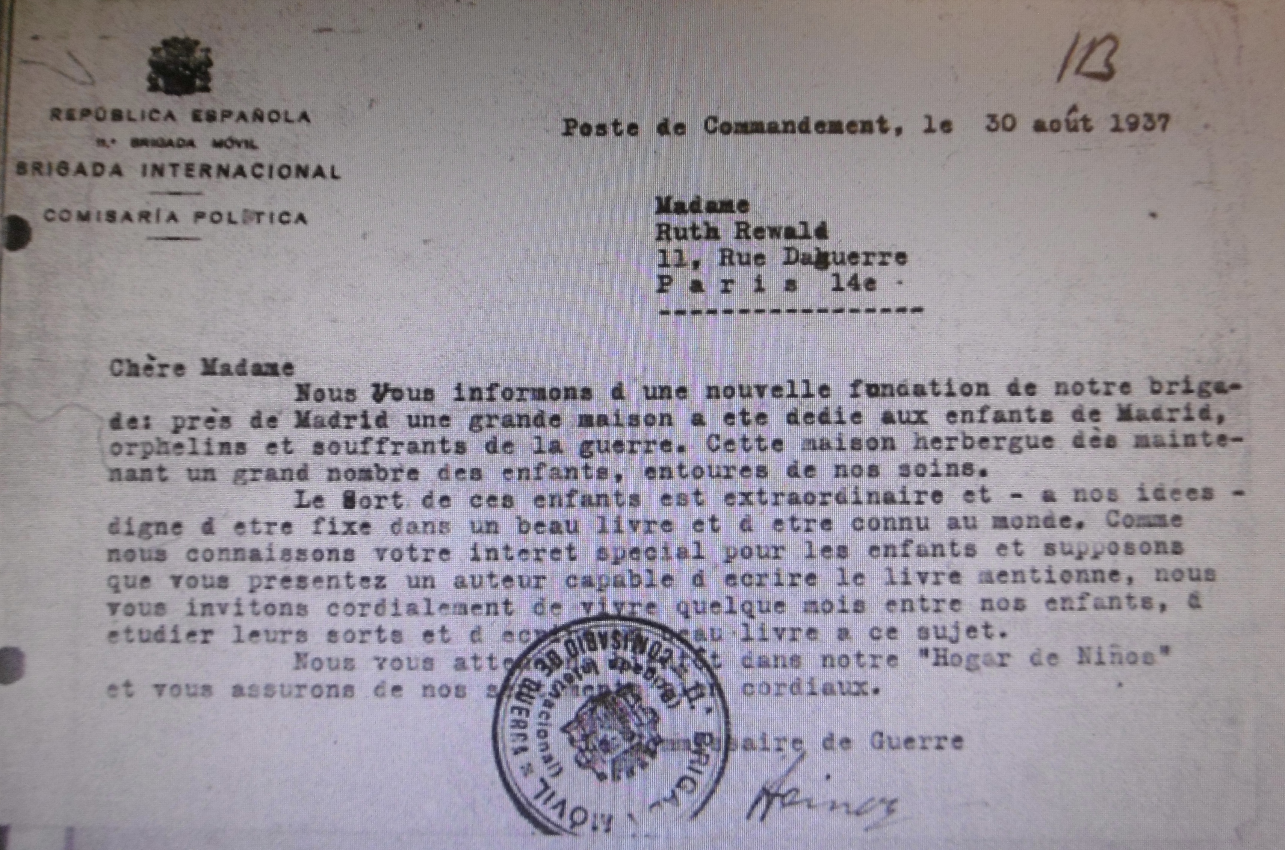 En août 1937, Ruth Rewald reçoit une invitation officielle du commissaire de guerre Heiner Rau, lui proposant de visiter le foyer pour enfants créé par les communistes à Madrid : « Le sort de ces enfants est extraordinaire et – à nos idées – digne d’être fixé dans un beau livre et d’être connu au monde. Comme nous connaissons votre intérêt spécial pour les enfants et supposons que vous présentez un auteur capable d’écrire le livre mentionne, nous vous invitons cordialement de vivre quelques mois entre nos enfants, d’étudier leurs sorts et d’écrire un beau livre a ce sujet. »