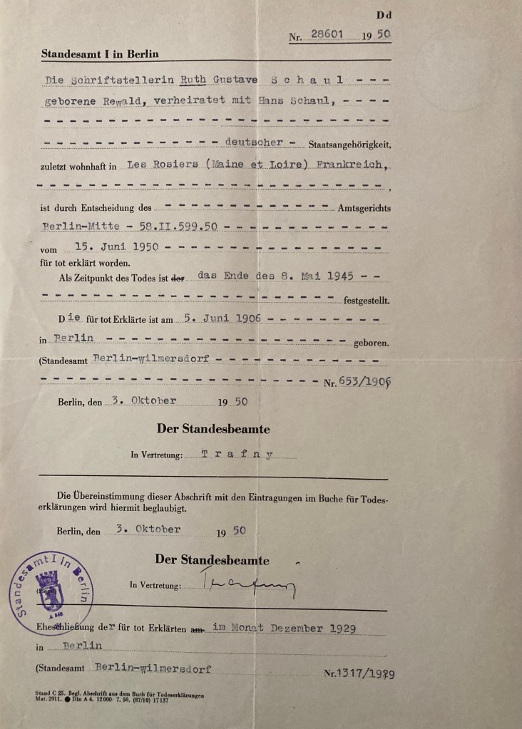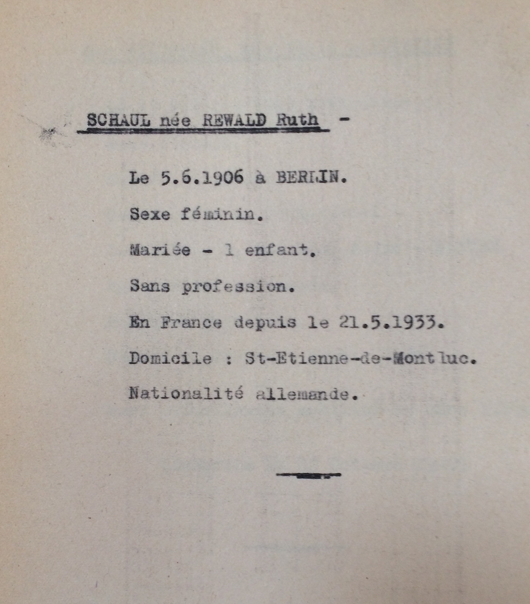 Ruth Gustava SCHAUL (prénom usuel Ruth) née REWALD est née le 05 juin 1906 à Berlin et plus précisément dans le quartier de Wilmersdorf. Elle est entrée en France le 21 mai 1933 avec un visa sans limitation de durée délivré par le Consulat de France à Berlin le 31 mars 1933 et visé le 16 mai 1933. De profession écrivain, elle est mariée depuis le 06 novembre 1929 à Berlin avec Hans SCHAUL né le 13 décembre 1905 à Hohensalza (Inowroclaw) dans l’actuelle Pologne mais à l’époque de la naissance d’Hans sous domination allemande, de profession avocat. Il arrive en France peu de temps après avec un visa valable deux mois délivré par le Consulat de France à Berlin visé le 20 juin 1933 et donc valable jusqu’au 20 août 1933. Les deux époux quittent l’Allemagne en raison de leurs opinions politiques et de leurs origines israélites.