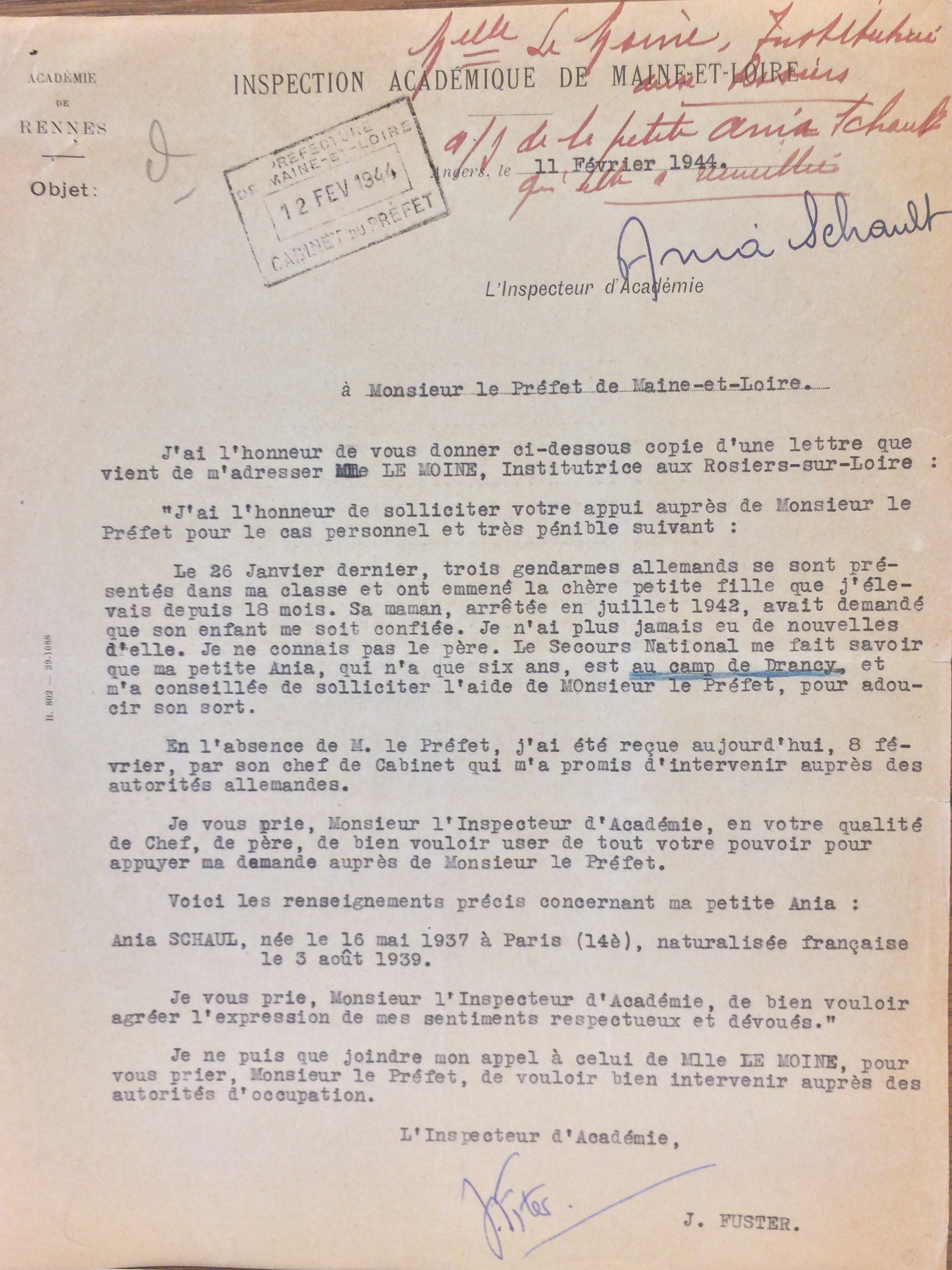 Lettre de J. Fuster, inspecteur d’académie au Préfet du Maine-et-Loire 11 février 1944 [ADML 303W294]