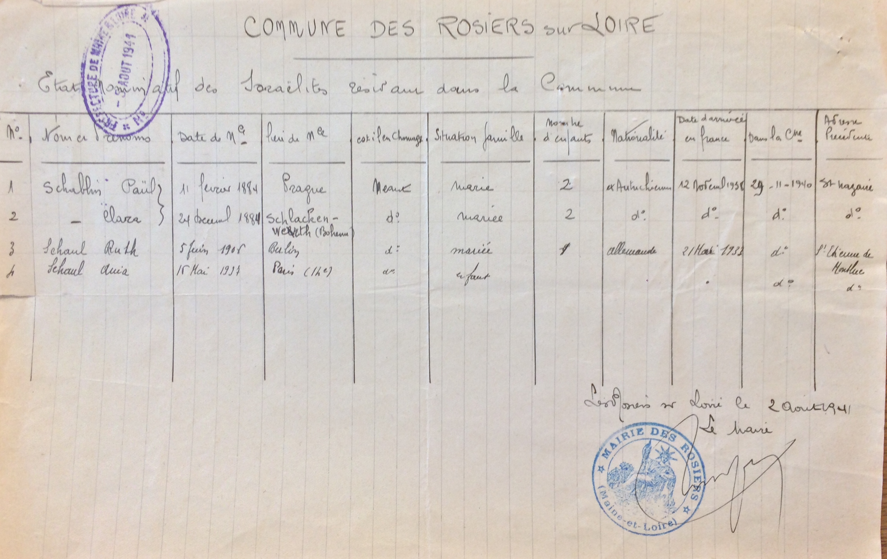 Depuis le 29 novembre 1940, Ruth SCHAUL et sa fille résident aux Rosiers-sur-Loire refoulées du département de Loire-Inférieure.