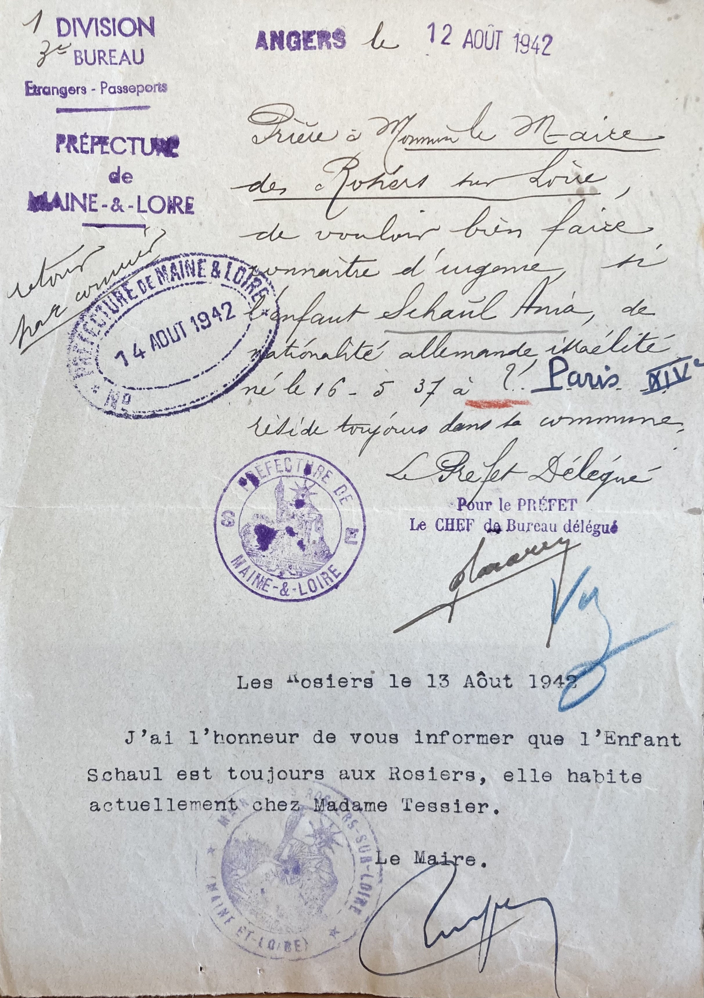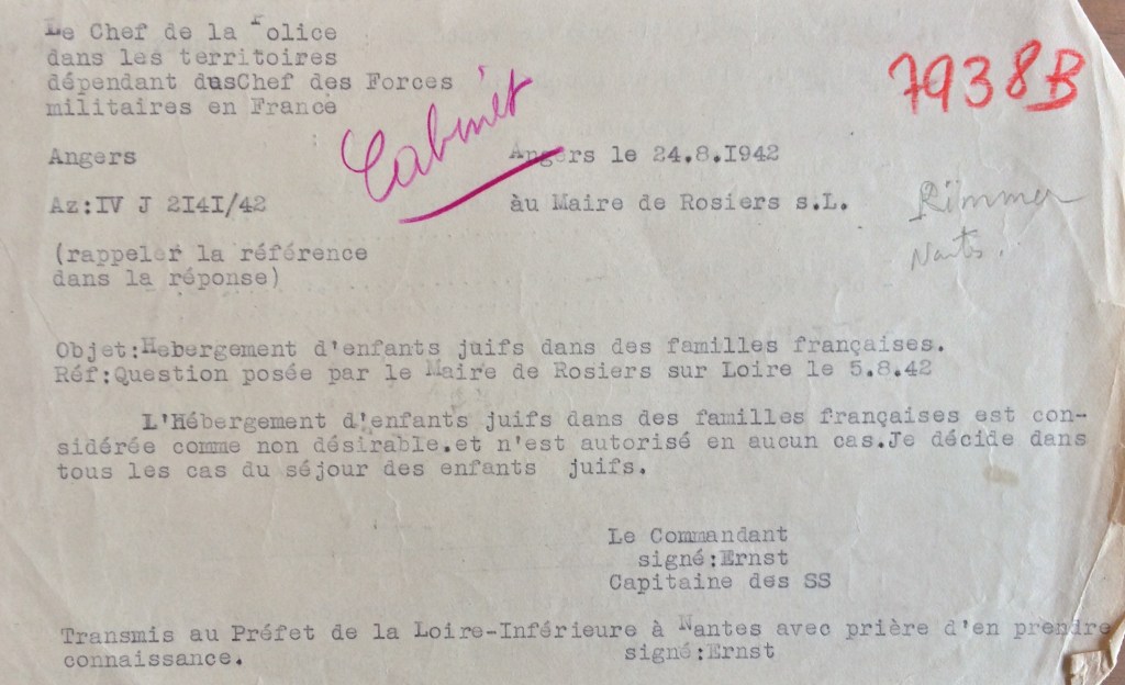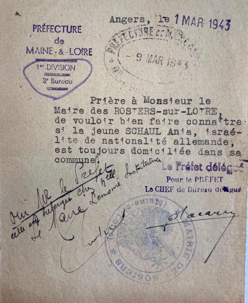 Régulièrement soumis au contrôle de leurs présences, la Préfecture en mars 1943 se renseigne auprès de à la Mairie des Rosiers pour savoir si Anja y est toujours. Le maire répond favorablement à la demande de la Préfecture. [En avril 1943, le Commissariat Général aux Questions Juives effectuera une demande auprès de toutes les Préfectures en zone occupée pour connaître les effectifs des enfants juifs scolarisés dans les écoles primaires (et des intituteurs/institutrices juifs) afin de les soustraire à l’enseignement public pour les scolariser dans des « établissements spécialement réservés aux juifs ». La mesure ne sera pas appliquée].