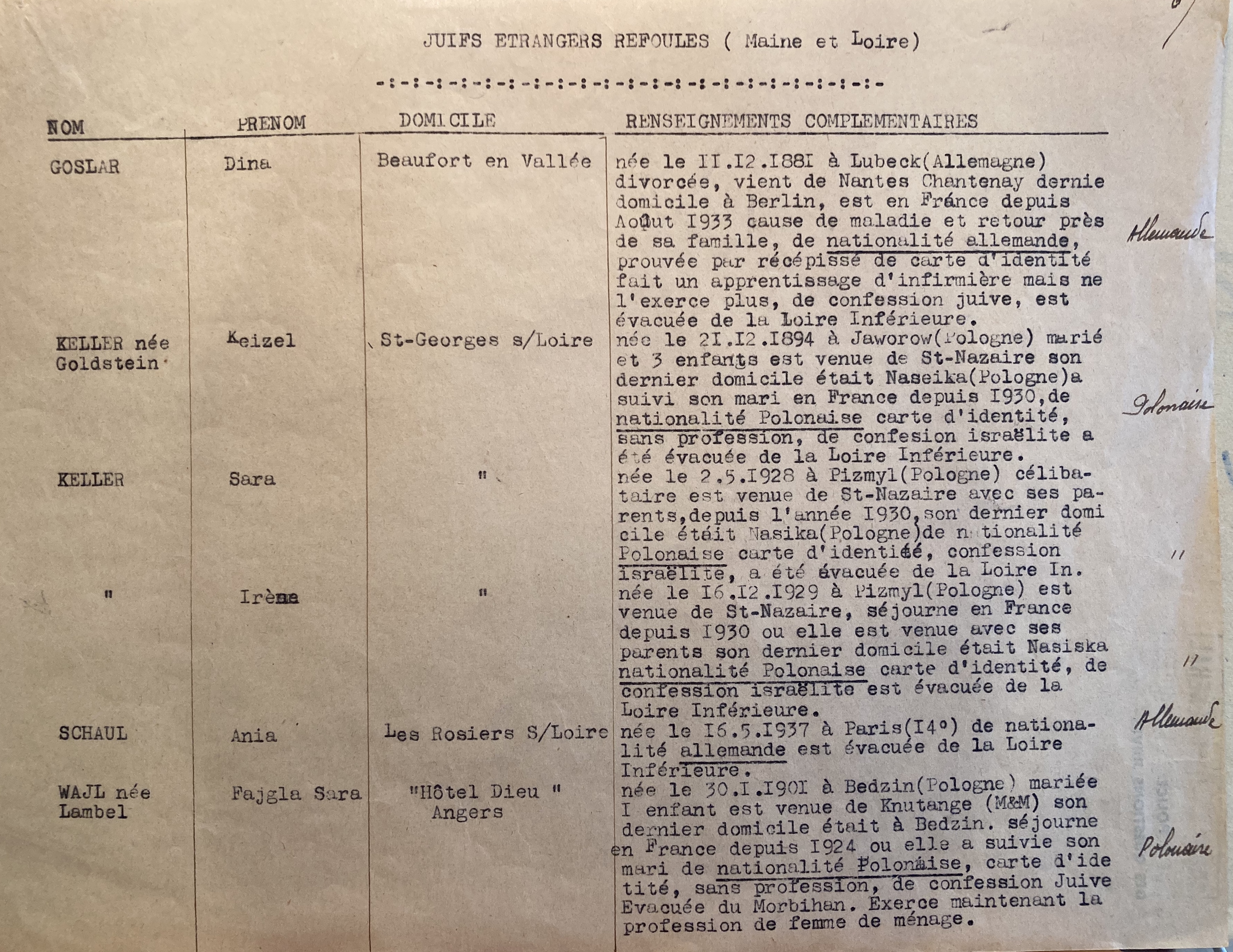 Suite à l’ordonnance allemande qui impose un deuxième recensement en juin 1941, elle se déclare avec sa fille auprès de la mairie des Rosiers-sur-Loire qui transmet à la sous-préfecture de Saumur.