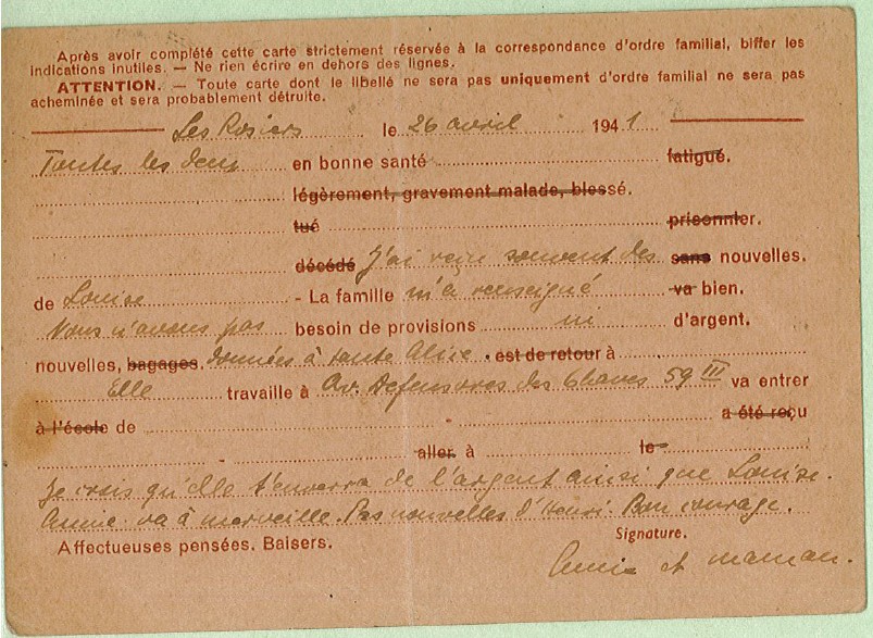 [Note sur la carte du 26 avril 1941 : Louise = Louise POLLNOW ; la famille = amis communistes ; tante Alice = la tante de Ruth, Alice ROSENBERG née REWALD ; Annie = Anja ; Henri = Heinrich RAU].