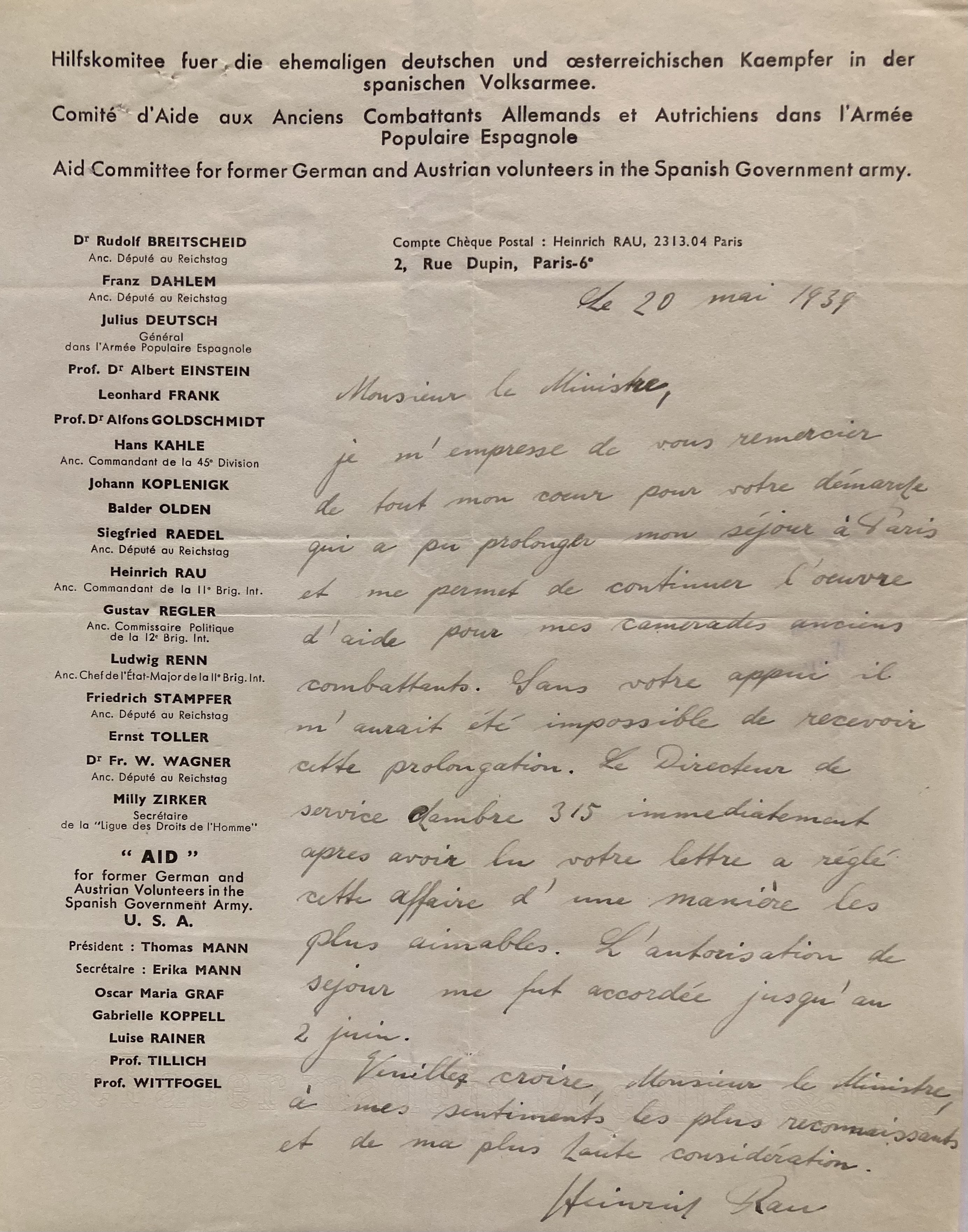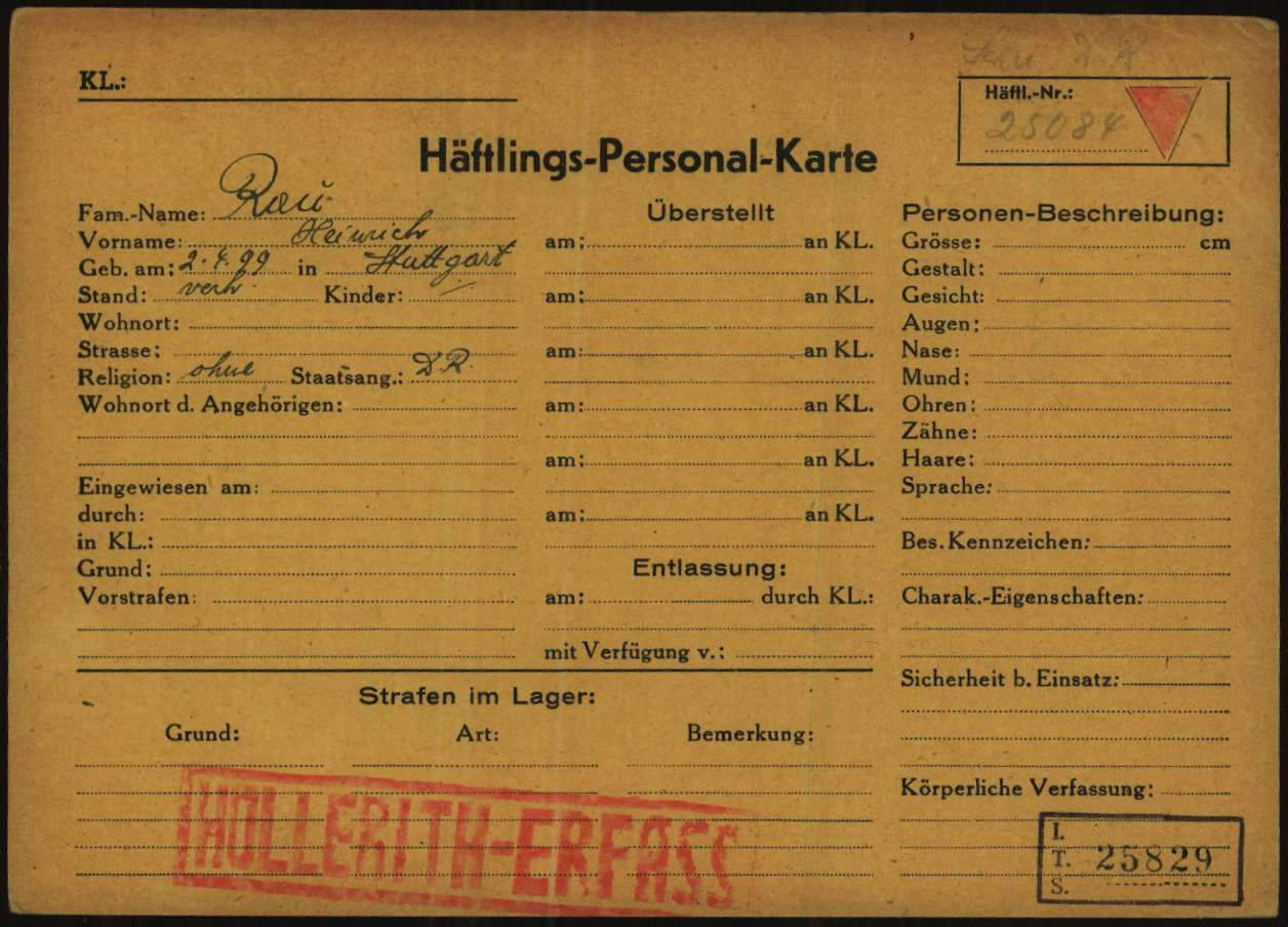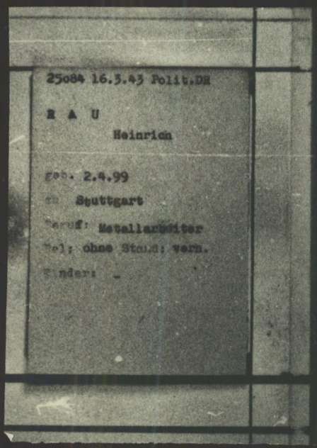 Ancien membre de la Diète de Prusse, arrêté à Francfort-sur-le-Main le 23 mai 1933 et condamné le 13 décembre 1934 par le Tribunal du Peuple (Tribunal Populaire) aux travaux forcés pour « préparation de haure trahison ». Relaché le 13 juin 1935, il vit à Berlin où i l se cache. A quitté l’Allemagne le 15 juillet 1936 (ou 1er août 1936) , se rend en Espagne, enrôlé dans les Brigades Internationales, a combattu jusqu’au 10 mars 1938. Blessé par balle à la cuisse droite, rentre en France le 18 mai 1938 à pied par le poste de Cerbère pour se faire soigner. Réside à Paris le 20 décembre 1938 où il fait une demande de carte d’identité d’étranger. Il est secouru en 1938 par le Comité National de Secours aux Réfugiés Politiques 33, rue d’Hauteville puis par le Secours Populaire qui lui verse un pécule pour vivre et réside à la même date 2, rue Dupin dans le 6ème arrondissement à Paris. Menacé d’expulsion le 11 janvier 1939, il est soutenu par Paul PERRRIN, ancien député de Paris et ancien sous-secrétaire d’Etat et par Maurice VIOLETTE, ancien ministre. L’intervention de ces deux personnalités porte ses fruits et Heinrich RAU envoie une lettre de remerciements à ces bienfaiteurs.