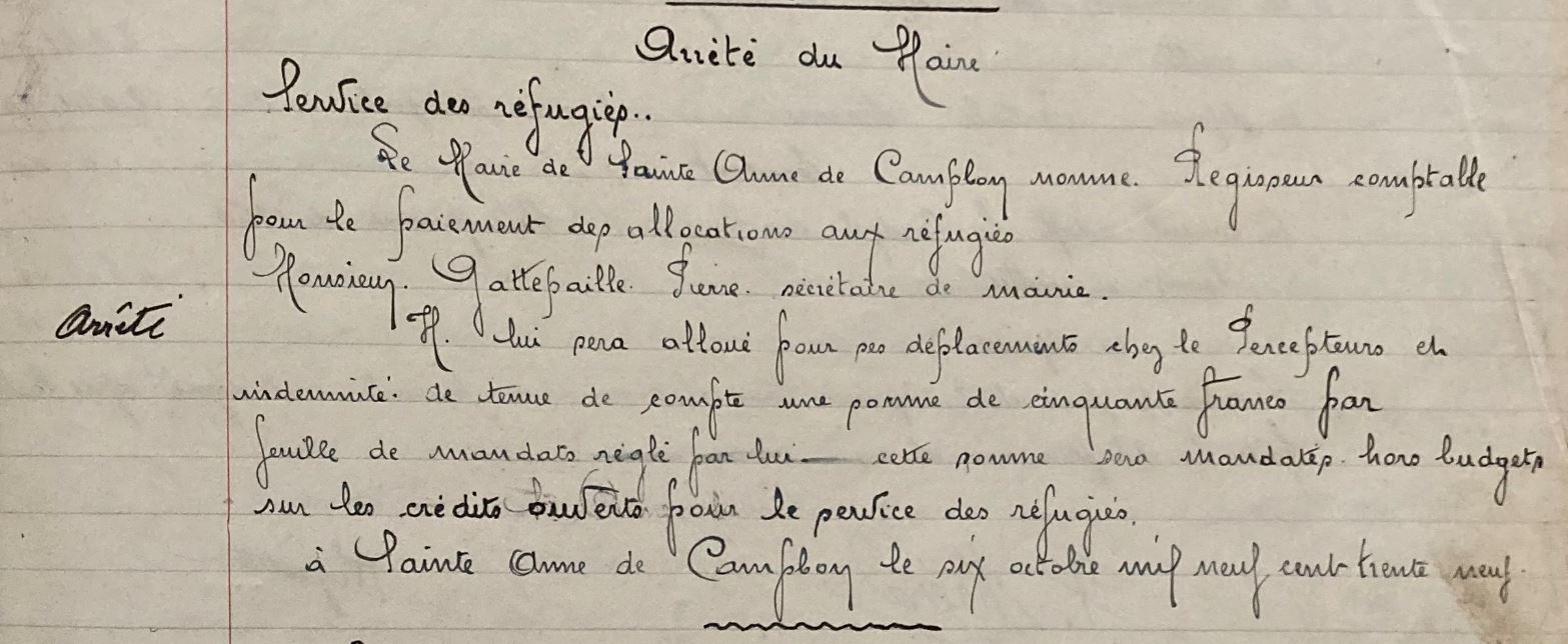 Le 06 octobre 1939, un arrêté du maire de Sainte-Anne-de-Campbon, François BARDOUL, fixe la création d’un service des réfugiés géré par le secrétaire de mairie de l’époque, Pierre GATTEPAILLE. Ce service d’aide aux réfugiés est chargé de verser les indemnités fixées à 10 francs par jour par personne adulte + 6 francs par jour par enfant de moins de 15 ans pour les régugiés présents dans la commune. Ruth touchera cette allocation à Sainte-Anne-de-Campbon, à Saint-Etienne de Montluc et aux Rosiers-sur-Loire. [Courrier du 11 octobre 1941 de Ruth à Hans SCHAUL]