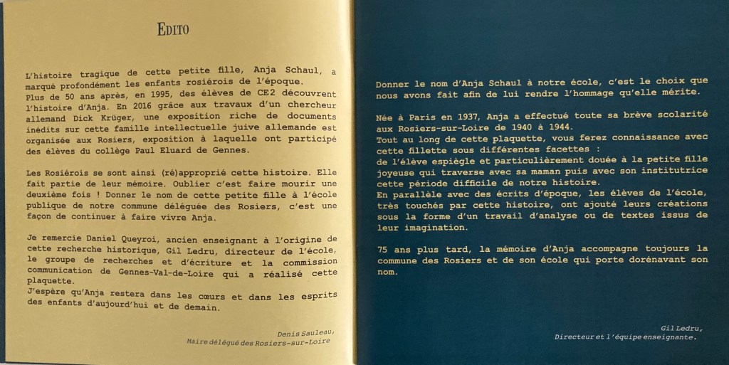 Le Conseil Municipal des Rosiers-sur-Loire ( Maire : Jean-Yves FULNEAU), lors de sa séance du 22 mai 2018, a décidé de donner le nom «école Anja Schaul» à l’école des Rosiers-sur-Loire.