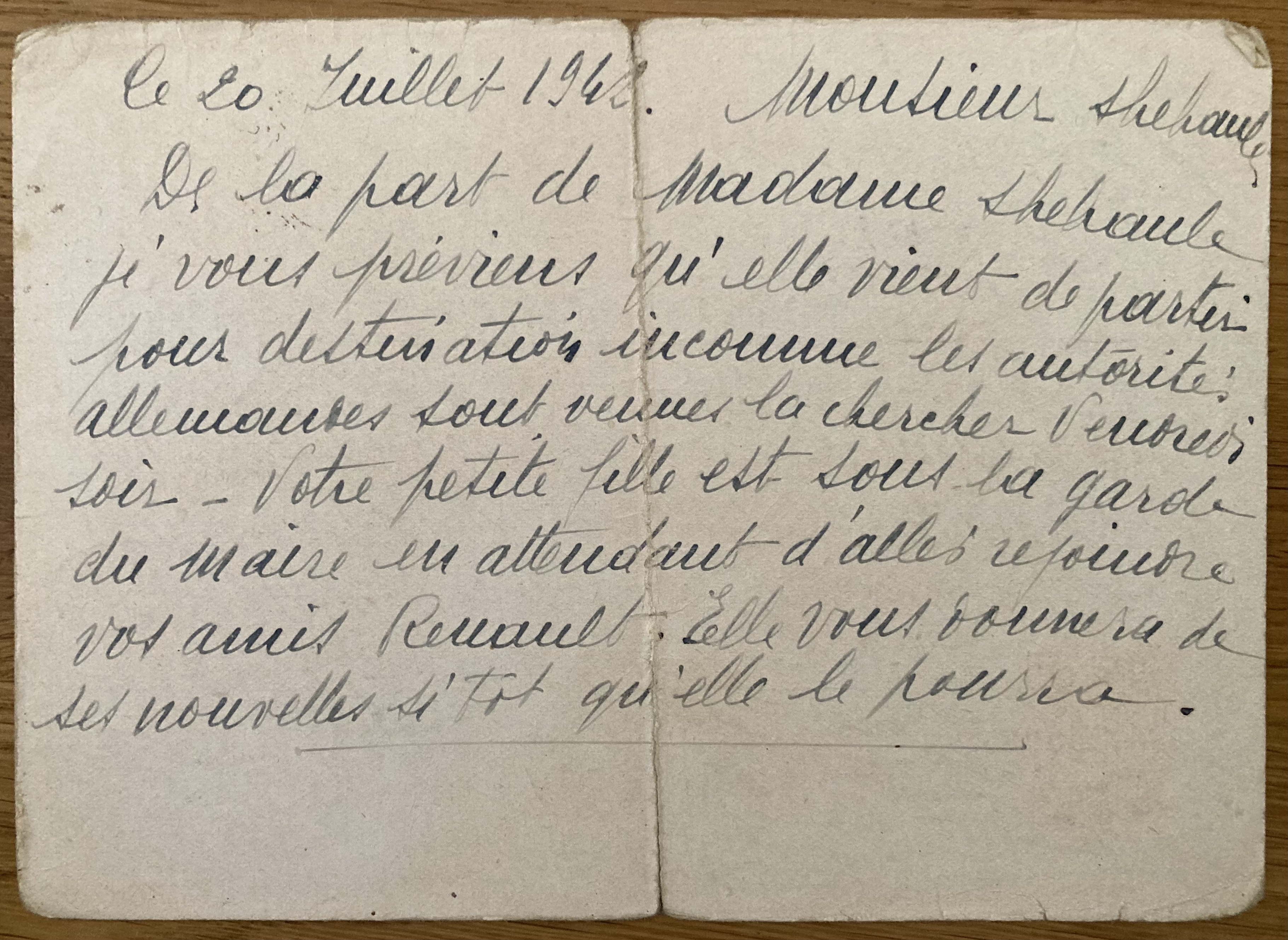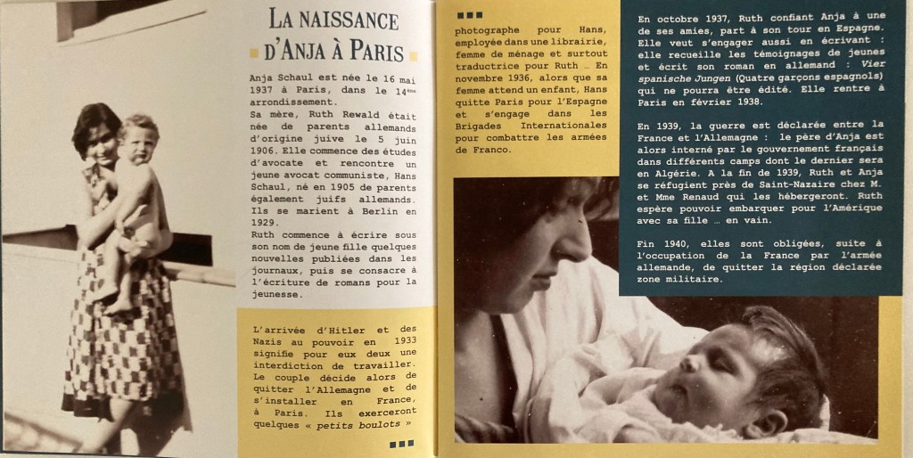 C’est en menant des recherches en vue d’établir son arbre généalogique qu’Alexandra Mazé, la petite-nièce du couple Renaud, a réussi à établir un lien entre sa famille et Ruth Schaul, une écrivaine allemande fuyant son pays dès 1933 en compagnie de son mari, Hans, né en Pologne. Leur fille Anja, elle, est née en 1937, à Paris, où ils résidaient et changeaient fréquemment d’adresse par peur d’être repérés.
