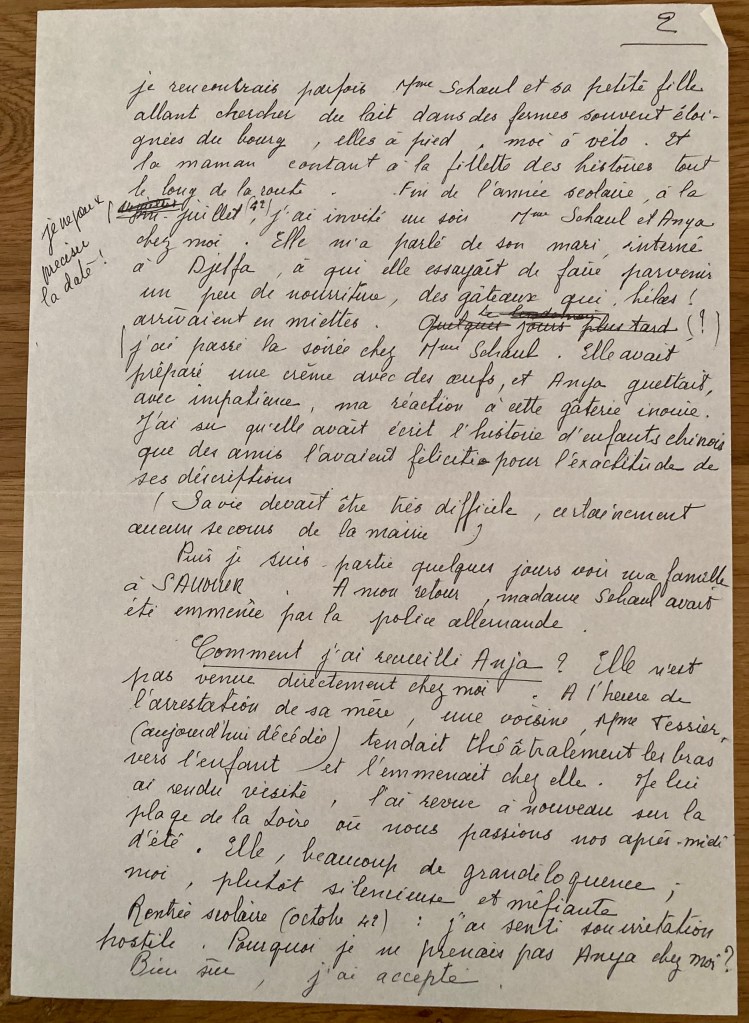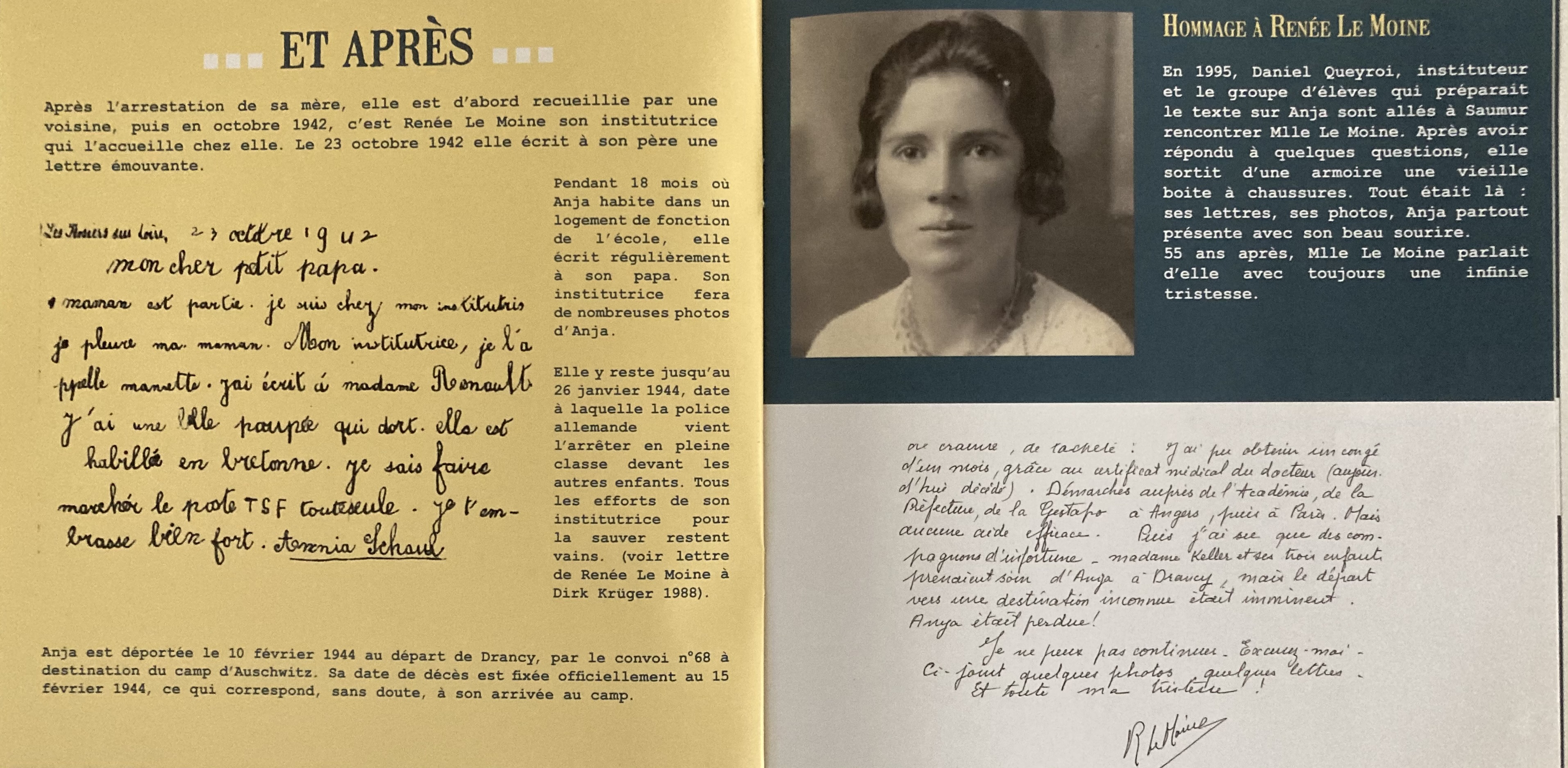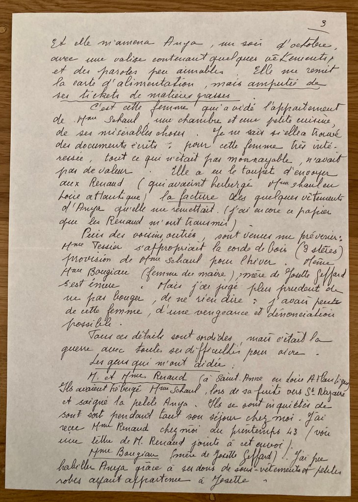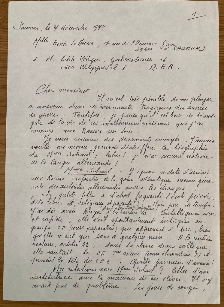 Cher Monsieur, Il m’est très pénible de me plonger à nouveau dans ces évènements tragiques des années de guerre. Toutefois, je pense qu’il est bon de témoigner de la vie de ces malheureuses victimes que j’ai connues aux Rosiers-sur-Loire. Je vous remercie des documents envoyés. J’aurais voulu au moins pouvoir déchiffrer la biographie de Mme Schaul ; hélas ! je n’ai aucune notion de la langue allemande. Mme Schaul : J’ignore sa date d’arrivée aux Rosiers, refoulée de la zone atlantique, mesure générale des autorités allemandes envers les étrangers. Sa petite fille a d’abord fréquenté l’école privée, (dite libre, religieuse et payante) Mais peu de temps. J’ai dû avoir Anja à la rentrée 1941 (dans ma classe enfantine). Intelligente, vive et rapide, elle s’est spontanément intégrée au groupe C.P. (cours préparatoire) qui apprenait à lire, bien qu’elle n’eût que 4 ans et quelques mois. A la rentrée scolaire, octobre 1942, dans la classe de ma collègue, elle sautait le CE 1ère année (cours élémentaire 1) et prenait la tête du CE2. Quelle promesse d’avenir ! Mes relations avec Mme Schaul ? Celles d’une institutrice avec la maman de ses élèves. Il n’y a avait pas de problème. Les jours de congé, je rencontrais parfois Mme Schaul et sa petite fille allant chercher du lait dans des fermes souvent éloignées du bourg, elles à pied, moi à vélo. Et la maman contant à la fillette des histoires tout le long de la route. Fin de l’année scolaire, à la mi-juillet (42) je ne peux préciser la date !, j’ai invité un soir Mme Schaul etAnja chez moi. Elle m’a parlé de son mari, interné à Djelfa, à qui elle essayait de faire parvenir un peu de nourriture, des gâteaux qui, hélas !, arrivaient en miettes. Le lendemain, j’ai passé la soirée chez Mme Schaul. Elle avait préparé une crème avec des oeufs et Anja guettait avec impatience ma réaction à cette gâterie inouïe. J’ai su qu’elle avait écrit l’histoire d’enfants chinois que des amis l’avaient félicité pour l’exactitude des descriptions. (Sa vie devait être très difficile, certainement aucun recours de la mairie). Puis je suis partie quelques jours voir ma famille à Saumur. A mon retour, madame Schaul avait été emmenée par la police allemande. Comment j’ai recueilli Anja ? Elle n’est pas venue directement chez moi. A l’heure de l’arrestation de sa mère, une voisine, Mme TESSIER (aujourd’hui décdédée) tendait théâtralement les bras vers l’enfant et l’emmenait chez elle. Je lui ai rendu visite, l’ai revue à nouveau sur la plage de la Loire où nous passions nos après-midis d’été. Elle, beaucoup de grandiloquence ; moi, plutôt siliencieuse et méfiante. Rentrée scolaire (octobre 42) : j’ai senti son irritation hostile. Pourquoi je ne prenais pas Anja chez moi. Bien sûr, j’ai accepté. Et elle m’amena Anja, un soir d’octobre, avec une valise contenant quelques vêtements et des paroles peu aimables. Elle me remit la carte d’alimentation, mais amputée de ses tickets de matières grasses. C’est cette feme qui a vidé l’appartement de Mme Schaul, une chambre et une petite cuisine, de ses misérables choses. Je ne sais si elle a trouvé des documents écrits, pour cette femme très intéressée, tout ce qui n’était pas monayable, n’avait pas de valeur. Elle a eu le toupet d’envoyer aux Renaud (qui avaient hébergé Mme Schaul en Loire-Atlantique) la facture des quelques vêtements d’Anja qu’elle me remettait (j’ai encore ce papier que les Renaud m’ont transmis). Püis des voisins outrés sont venus me prévenir : Mme Tessier s’appropriait la corde de bois (3 stères, provision de Mme Schaul pour l’hiver). Même Mme Bougiau (femme du maire), mère de Josette Gerrard, s’est émue. Mias j’ai jugé plus prudent de ne pas bouger, de ne rien dire : j’avais peur de cette femme, d’une vengeance et dénonciation possible. Tous ces détails sont sordides, mais c’était la guerre avec toutes ses difficultés pour vivre. Les gens qui m’ont aidée : M et Mme RENAUD (à Sainte-Anne en Loire-Atlantique). Ils avaient hébergé Mme Schaul lors de sa fuite vers Saint-Nazaire et soigné la petite Anja. Ils se sont inquiétés de son sort pendant tout son séjour chez moi. J’ai reçu Mme RENAUD chez moi au printemps 43 (voir une lettre de RENAUD jointe à cet envoi). Mme Bougiau (mère de Josette GEFFARD). J’ai pu habiller Anja grâce à ses dons de sous-vêtemnts et petites robes ayant appartenu à Josette. De la mairie : j’ai eu droit gratuitement au médecin et à la cantine scolaire (repas de midi), mais aucun secours financier. Ce sont des résistants, mobilisés par le S.T.O. (service de travail obligatoire) qui dans les ateliers allemands de La Rochelle, lui ont construit son lit d’enfant et des petits meubles jouets de poupée. Des résistants de Saumur qui lui ont procuré (gratuitement) son tricycle, son petit vélo bleu. Enfin, Mme POLLNOW , amie des Schaul et de H. Rau. Réfugiée dans le Gers à Le Houga (proximité de la frontière espagnole) avec son mari, médecin/ Elle s’est constamment inquiétée du sort d’Anja, de sa santé, de ses besoins. Elle nous parlait longuement de son petit garçon, Dany. C’est elle qui m’a révélé que H. Rau (aryen et militant communiste très actif) était le véritable père d’Anja, ceci après l’arrestation de la fillette. Mais ce renseignement ne pouvait être d’aucun secours (voir lettre ci-jointe de Mme POLLNOW). Au printemps 45, Mme POLLNOW a retrouvé Paris, son appartement (12, rue Roli Paris XIVe) et la magnifique bibliothèque de son mari interné. Elle m’a invitée à passer les vacances de Pentecôte chez elle. J’y suis allée, avec du ravitailement naturelement. Bien reçu, mais beaucoup de choses dans ses bavardages m’ont choquée. Nous avons continué à échanger quelques lettres, nouvelles et voeux