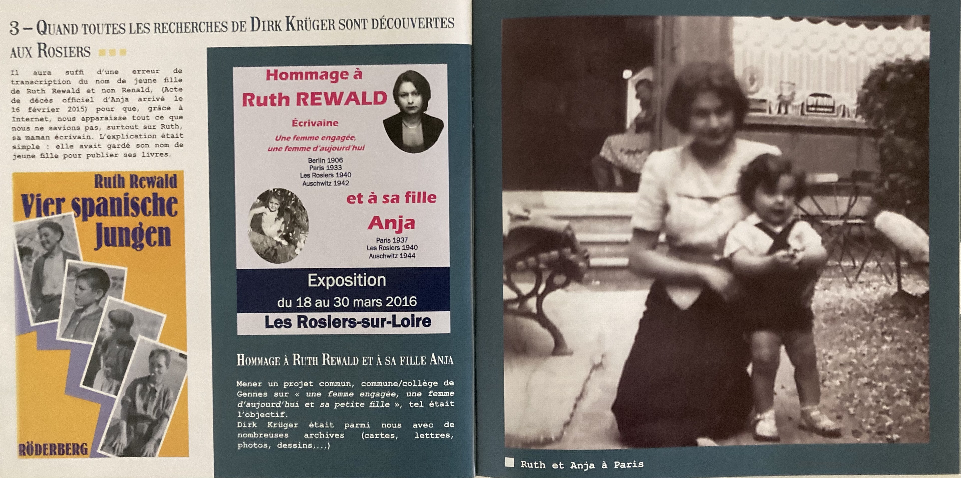A peu près dans le même temps, Dirk KRÜGER a retrouvé les documents pillés à Paris dans les Archives Allemandes et réédité le livre « Vier Spanische Jungen ». Il sera l’auteur d’une thèse : « Die deutsch-jüdische Kinder- und Jugendbuchautorin Ruth Rewald und die Kinder- und Jugendliteratur im Exil, Jugend und Medien, dipa-Verlag Frankfurt-am-Main, 1990. »