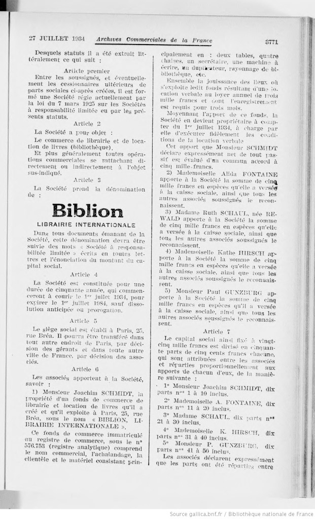 En juillet 1934, Ruth s’accocie dans la librairie Biblion au 25, rue de Bréa (là où avait été livré nombre des affaires personnelles du couple en juillet 1933) avec Joachim SCHMIDT qui exploitait déjà la librairie), Alida FONTAINE, Kathe HIRSCH et Paul GUNZBURG. La Librairie Biblion, librairie internationale, prend donc un nouvel essor dans la vente de livres. Elle a par ailleurs également une fonction de bibliothèque.