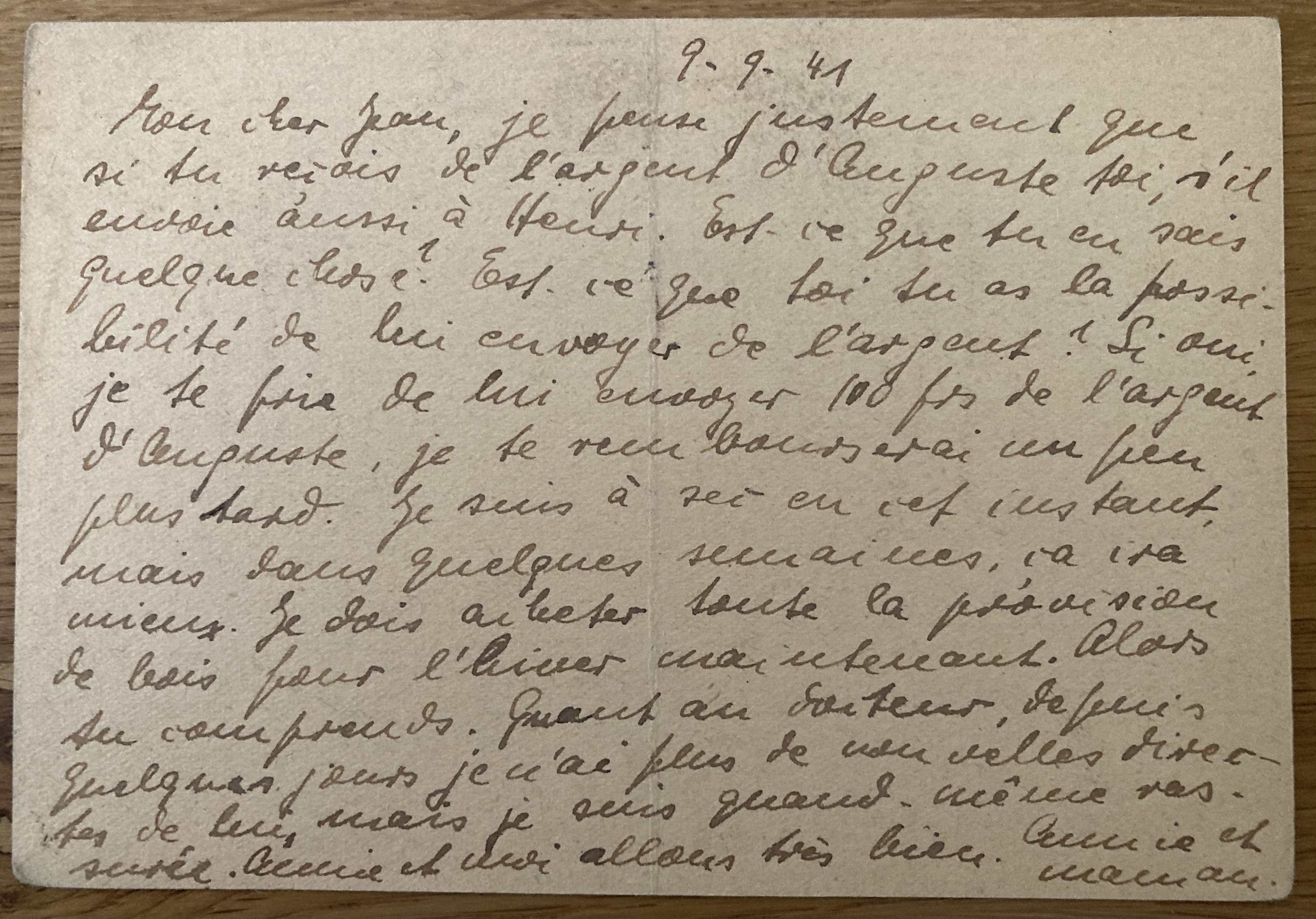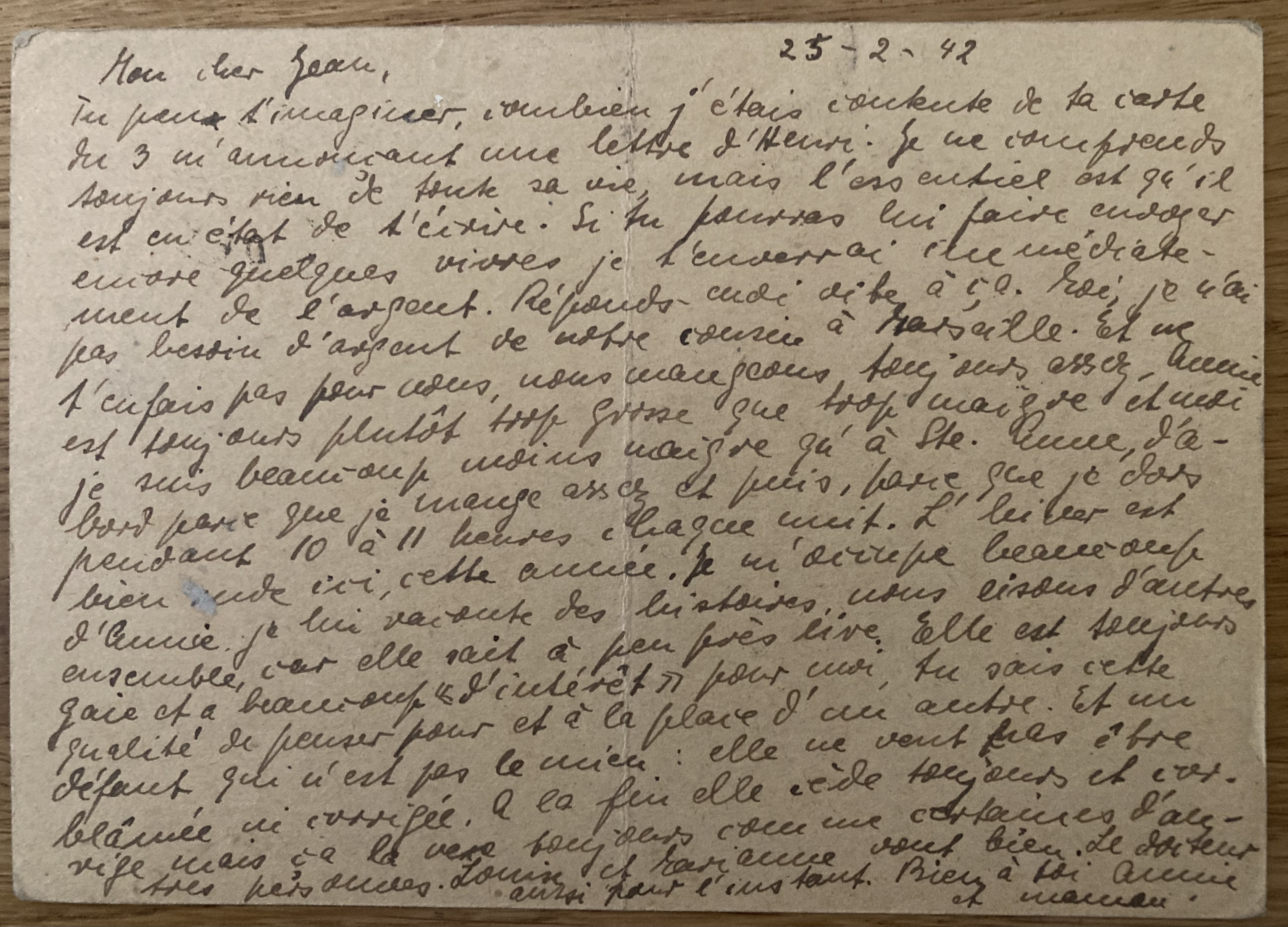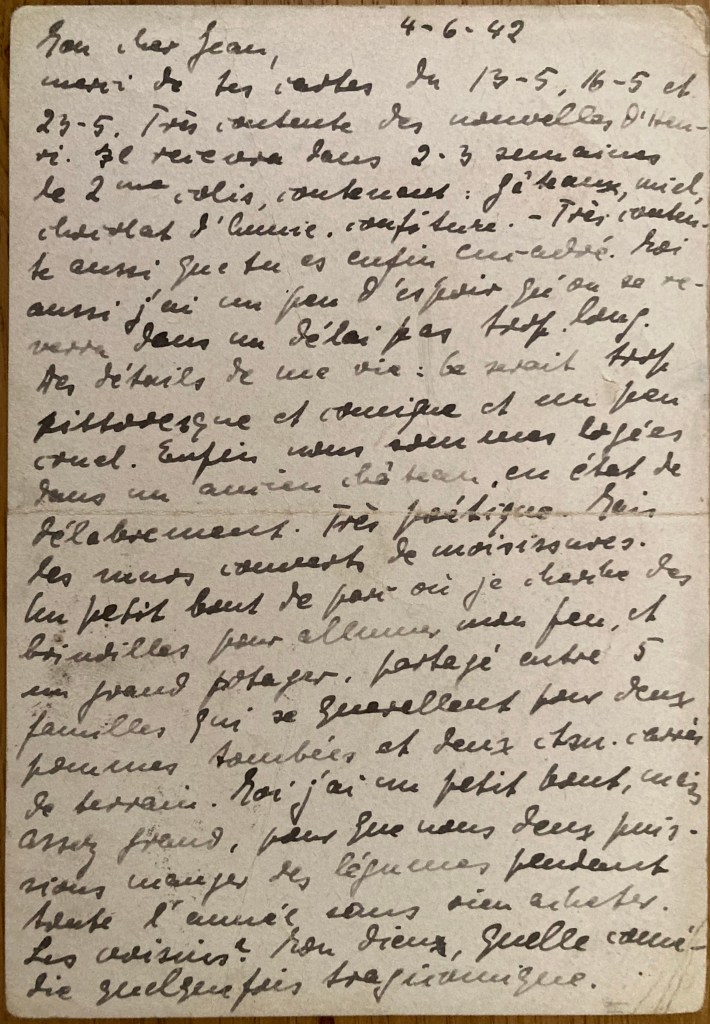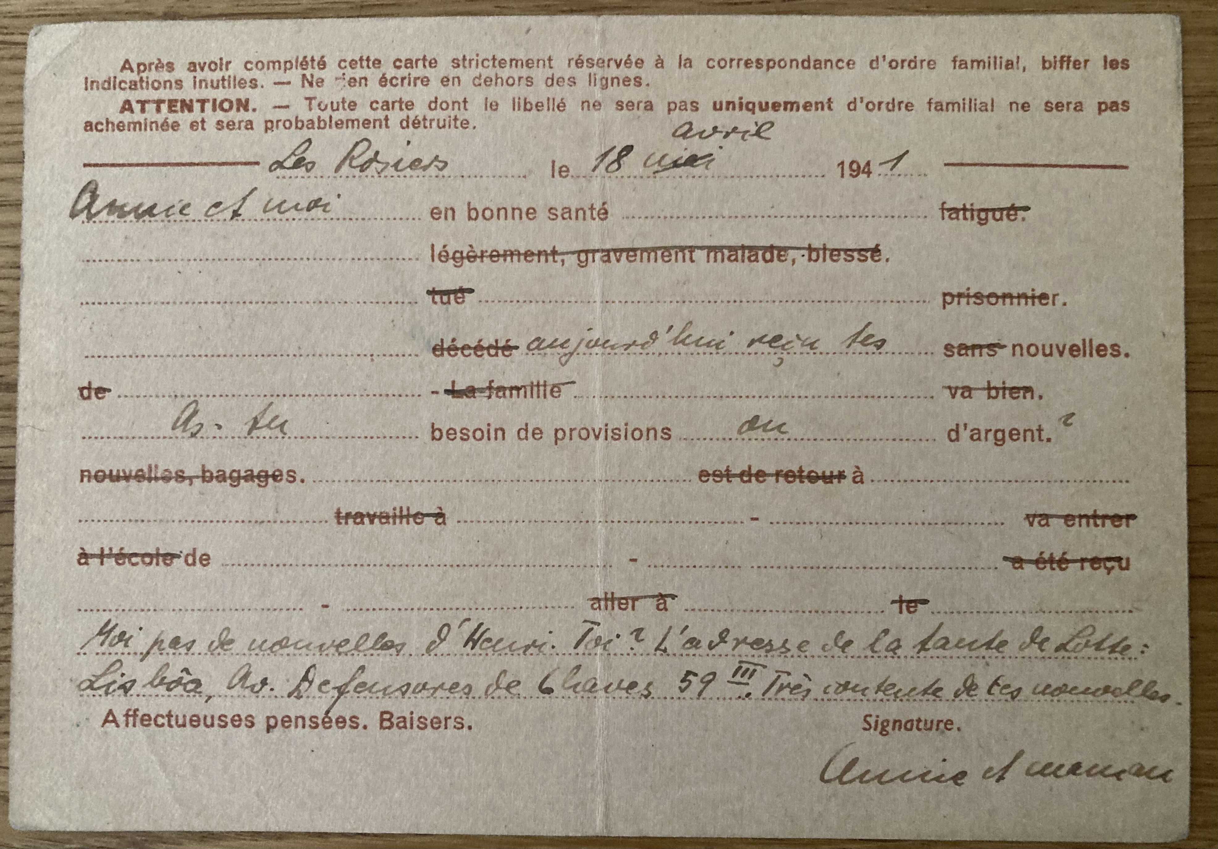Les Rosiers, le 18 avril 1941 Annie et moi en bonne santé. Aujourd’hui reçu tes nouvelles. As-tu besoin de provisions ou d’argent ? Moi, pas de nouvelles d’Henri. Triste (?). L’adresse de la tante de Lotte : Lisboa, av. Defensores de Chaves, 59 III. Très contente de tes nouvelles. Annie et maman.