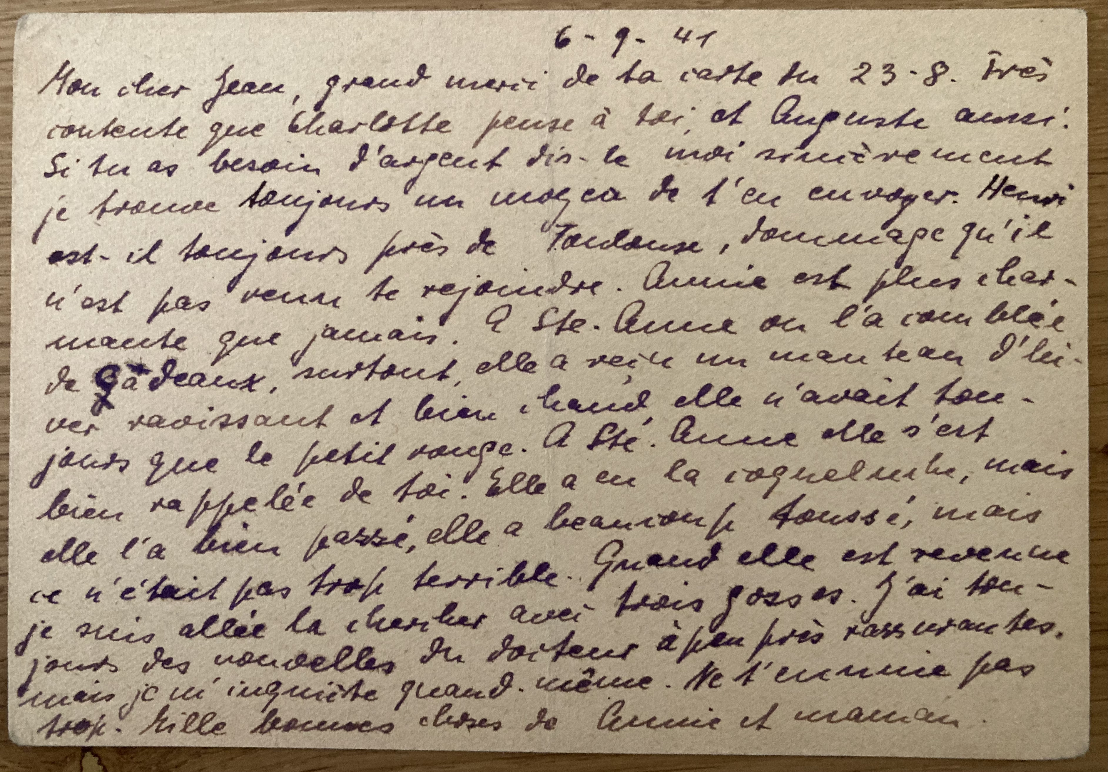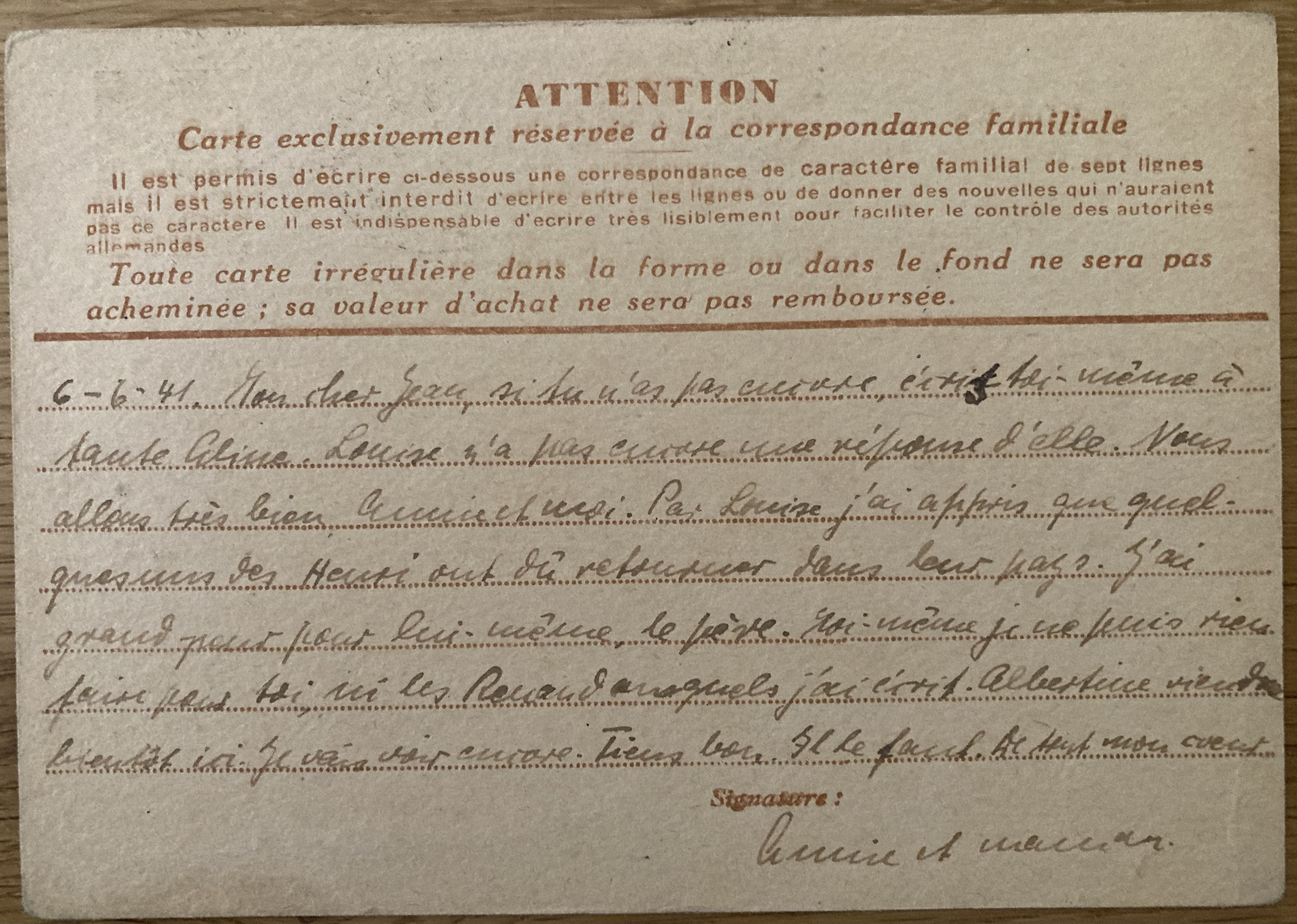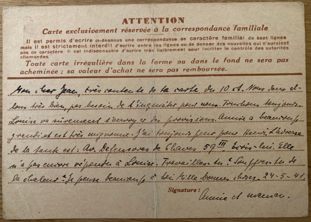 [Note sur la carte-lettre du 7 mai 1941 : Louise = Louise POLLNOW ; RENAUD = Louis et Albertine RENAUD de Sainte-Anne-de-Campbon ; Henri = Heinrich RAU ; Annie = Anja]