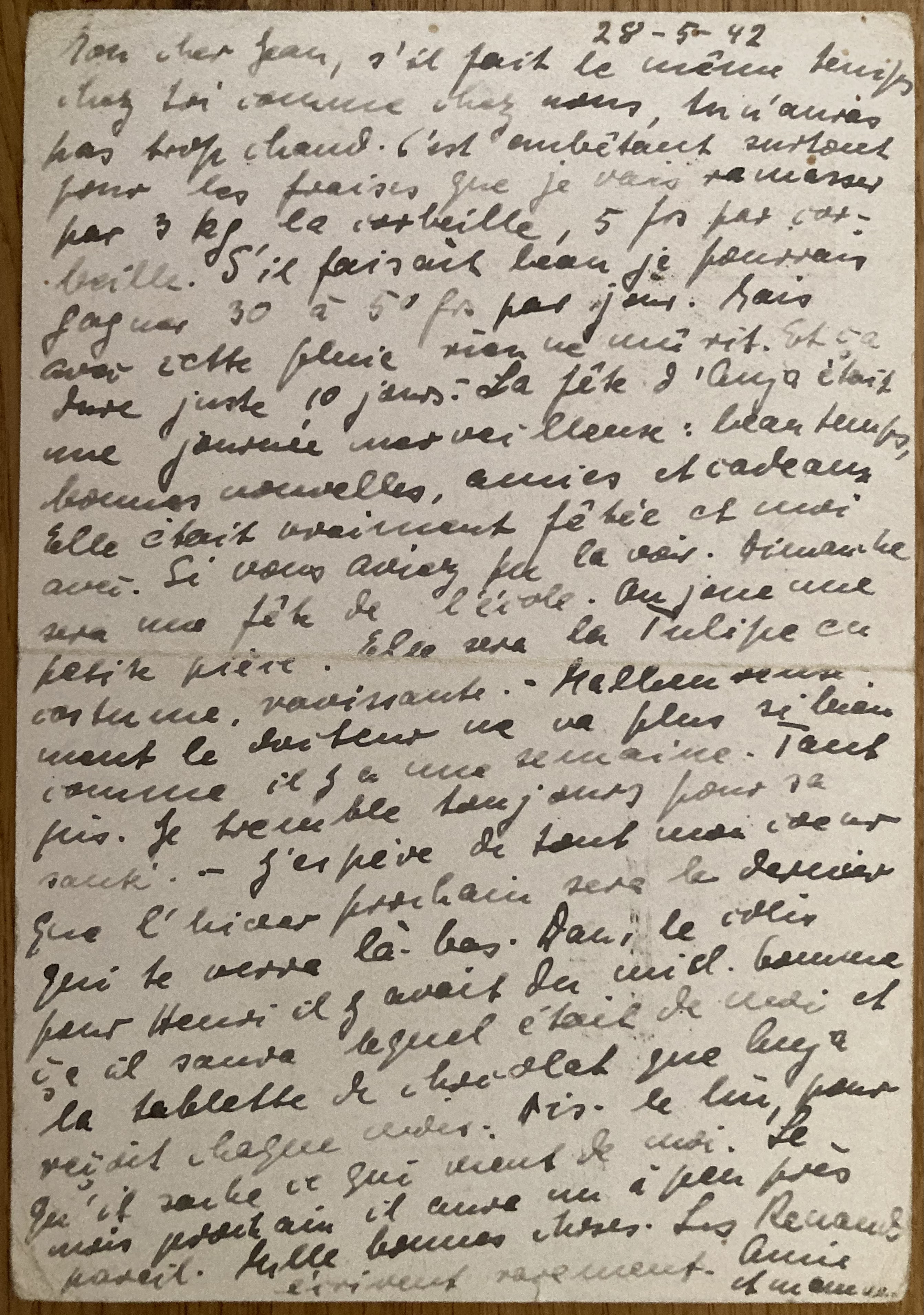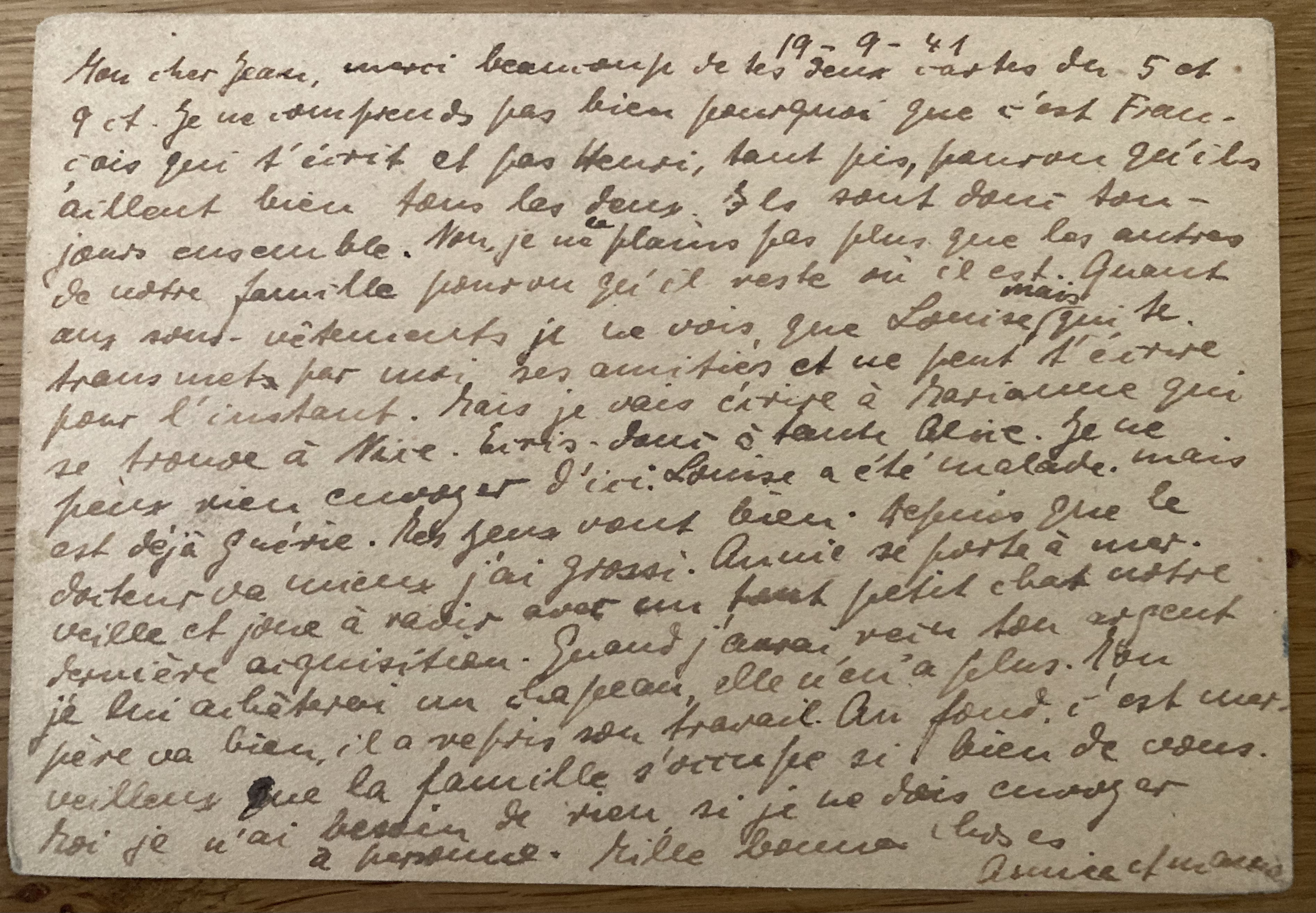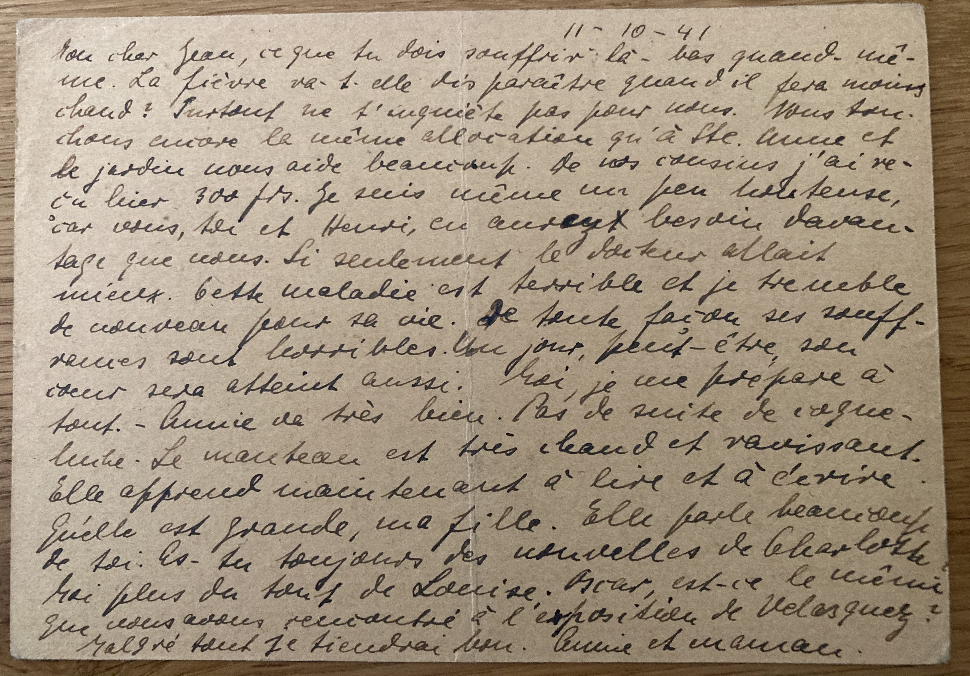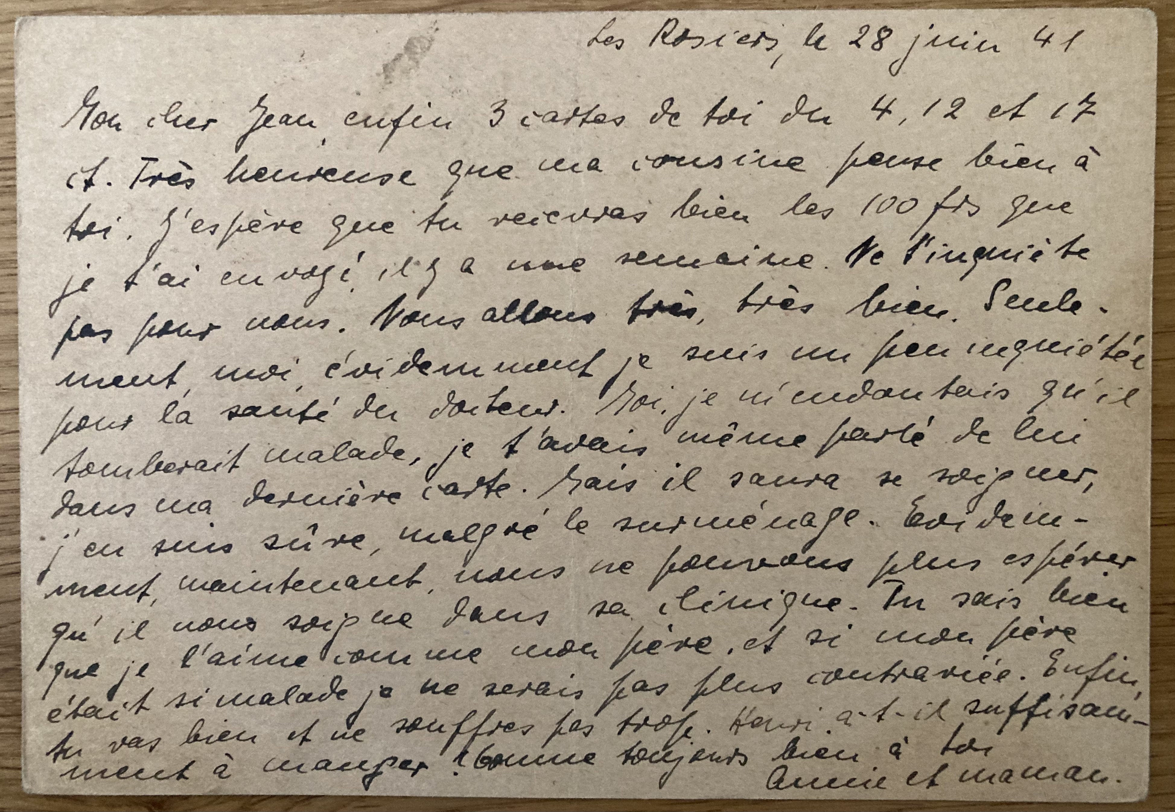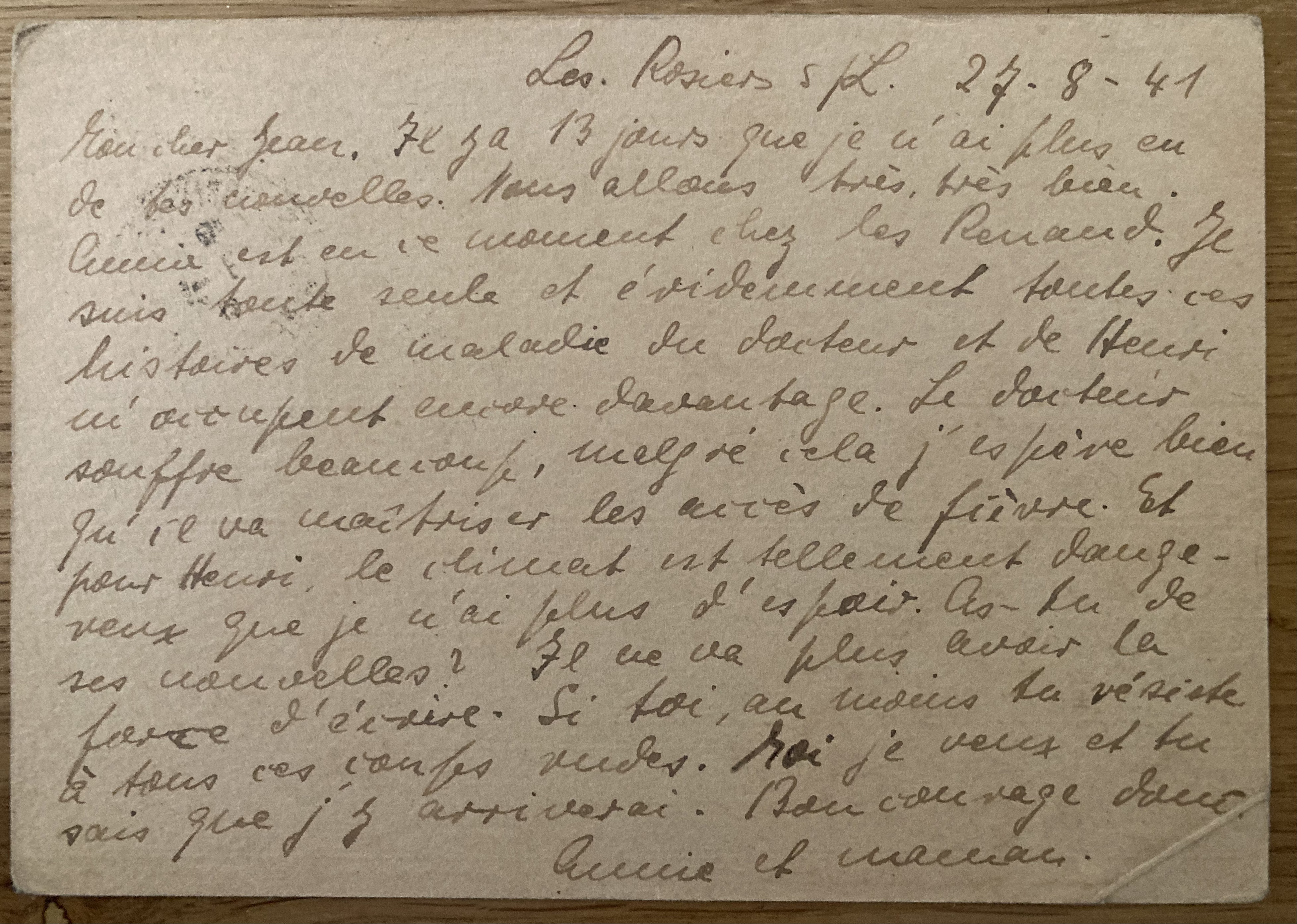 Les Rosiers le 7 mai 1941 Toutes les deux en bonne santé. De Louise et Renaud des nouvelles. De Henri que par toi. quant à l’argent, nouvelles sont données partout. Annie travaille à l’école et apprend déjà. Pour Henri, existe-t-il de grand danger pour sa santé ? Et son voyage ? J’en suis toujours inquiète. Es-tu bien là-bas ? Annie et maman