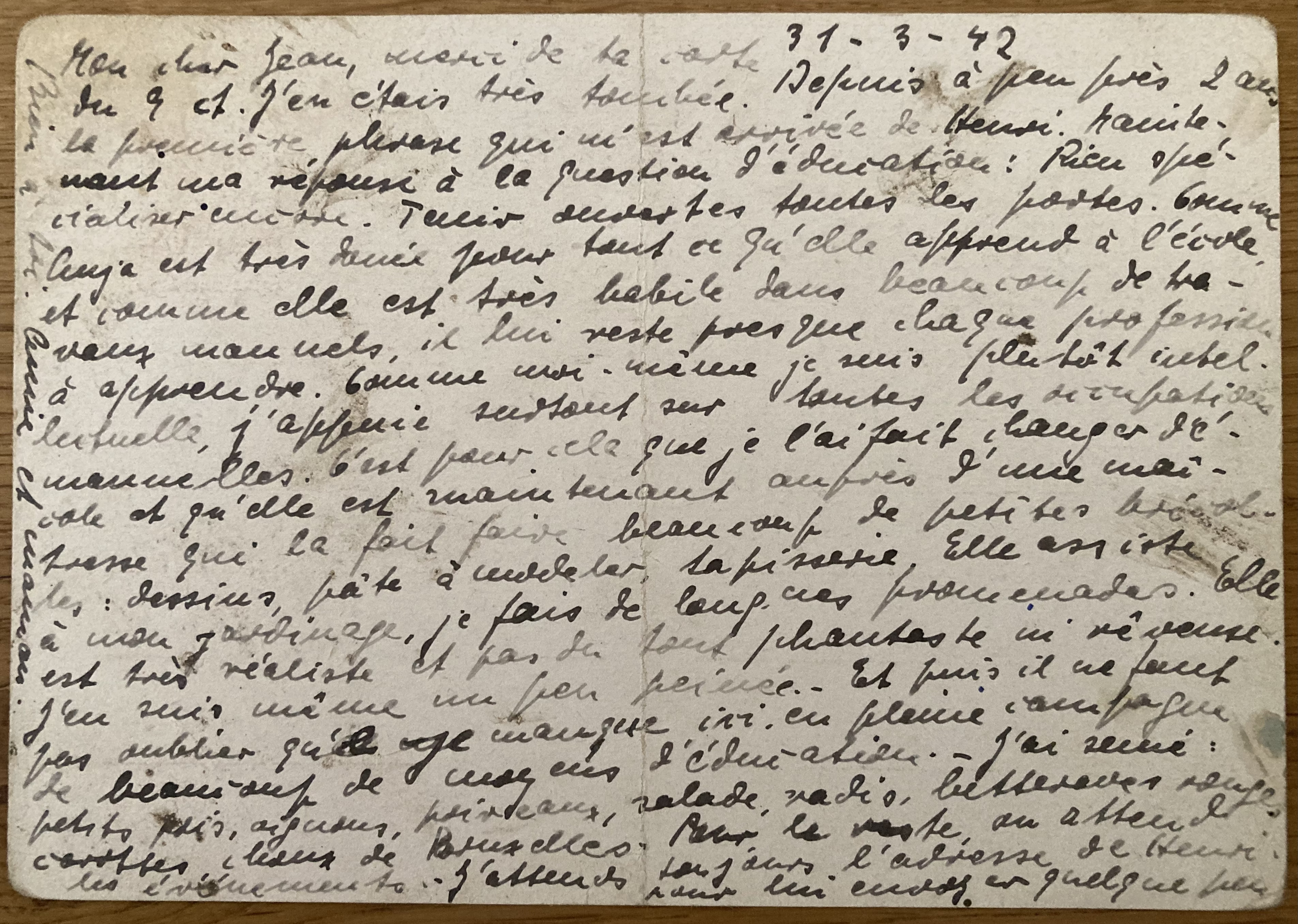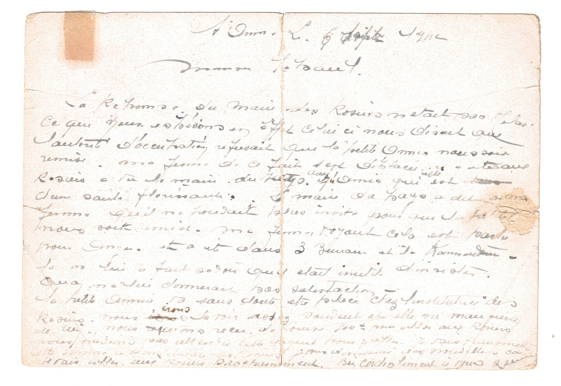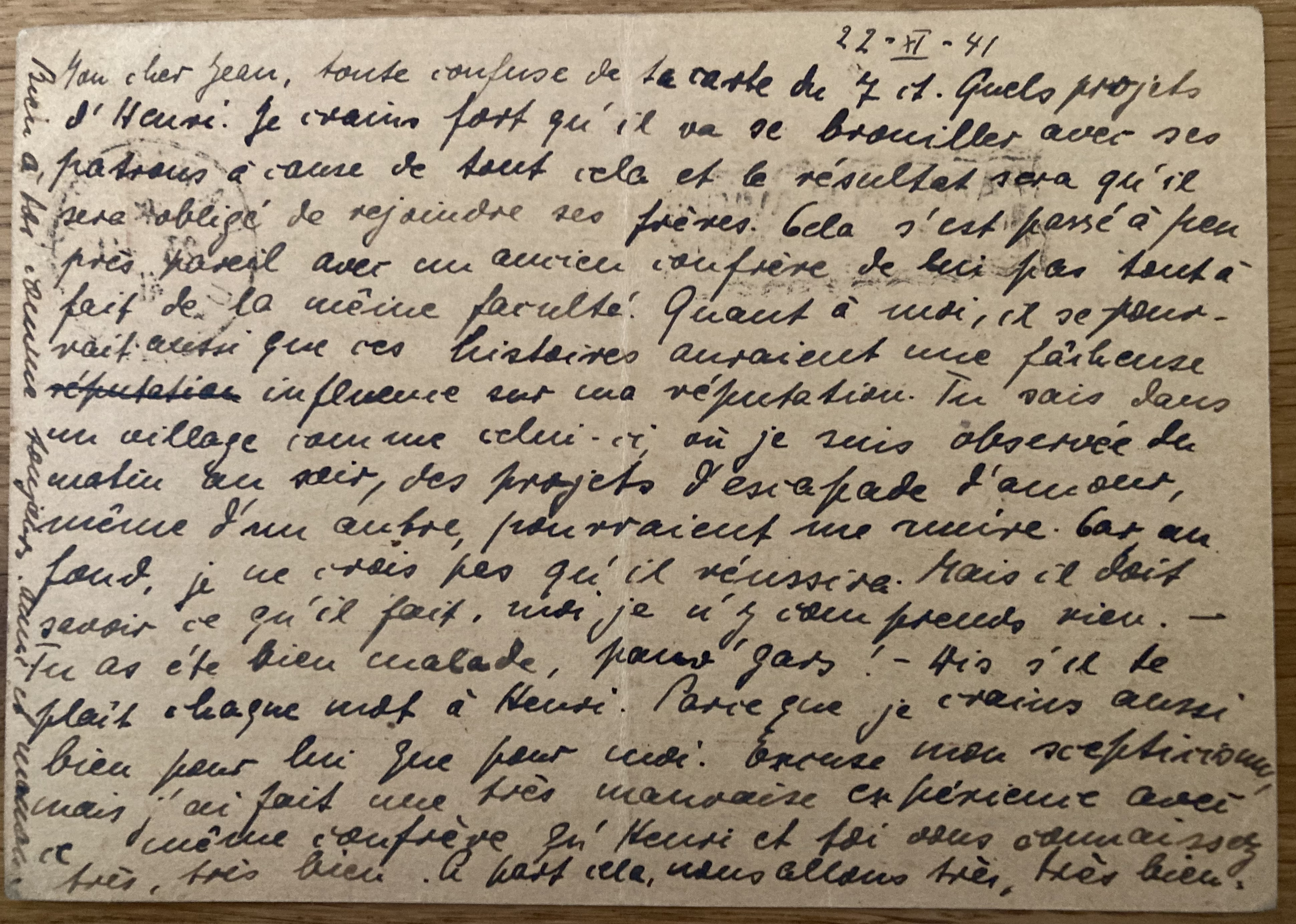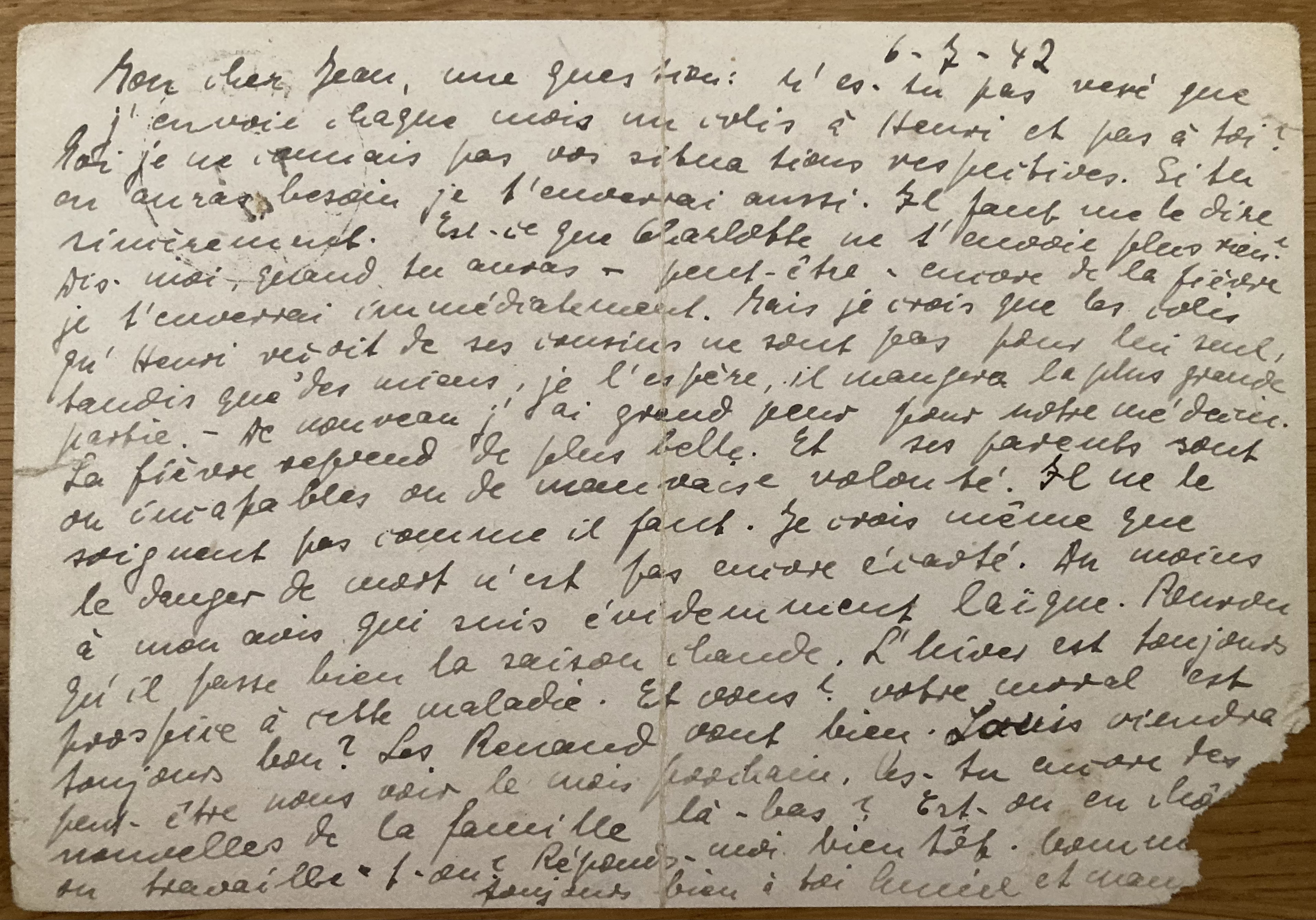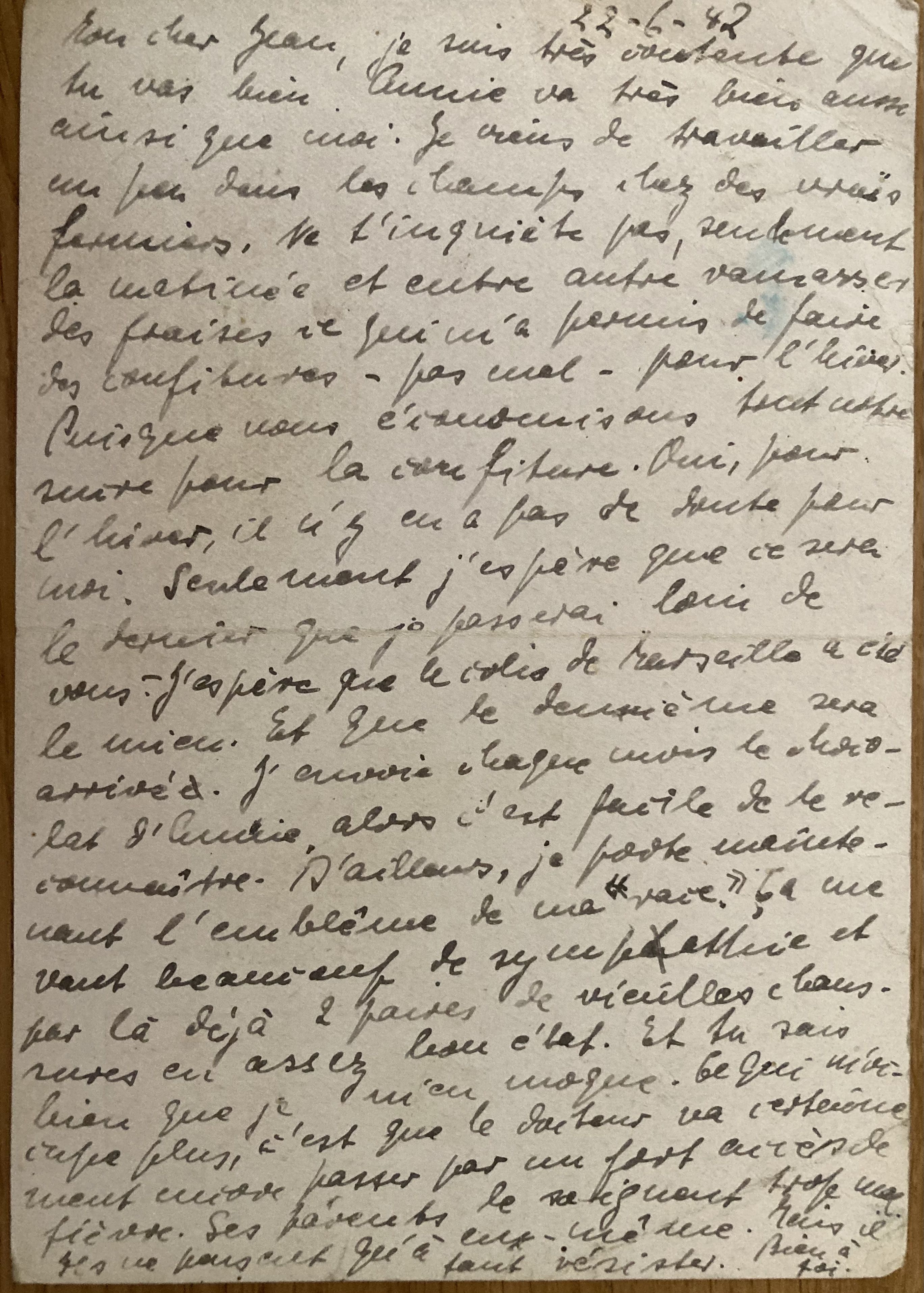 Les Rosiers le 7 mai 1941 Toutes les deux en bonne santé. De Louise et Renaud des nouvelles. De Henri que par toi. quant à l’argent, nouvelles sont données partout. Annie travaille à l’école et apprend déjà. Pour Henri, existe-t-il de grand danger pour sa santé ? Et son voyage ? J’en suis toujours inquiète. Es-tu bien là-bas ? Annie et maman