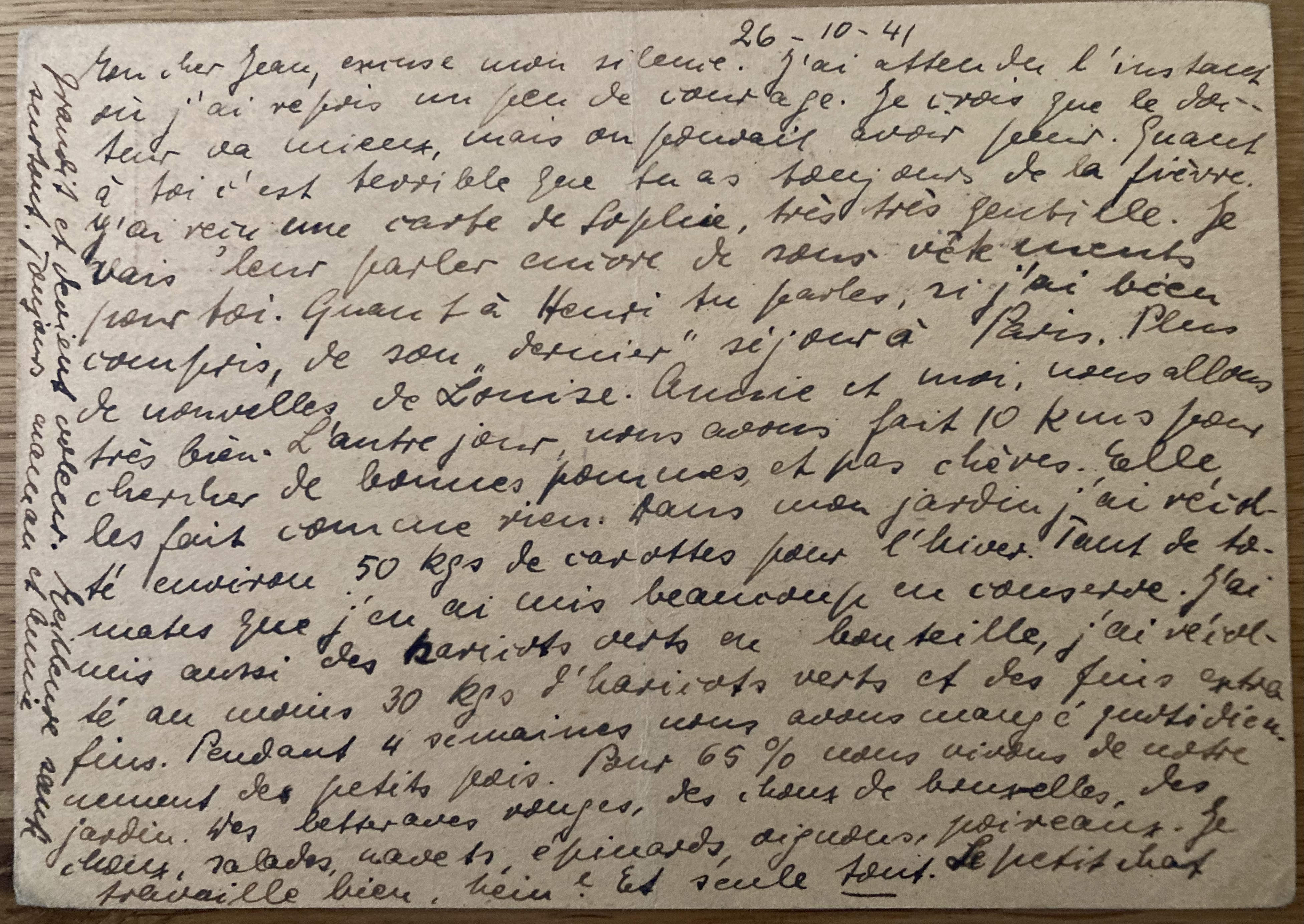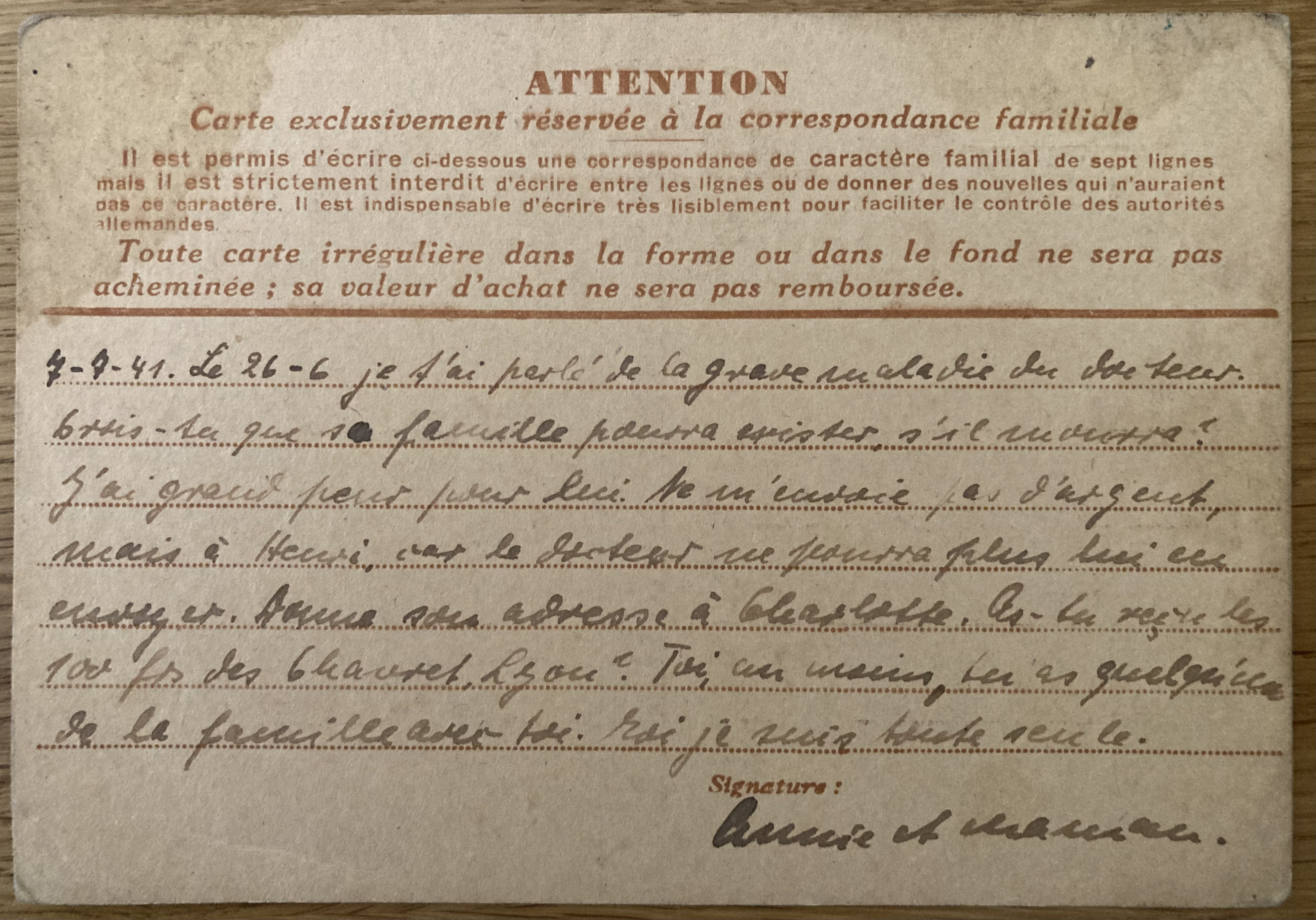 Les Rosiers le 26 avril 1941 Toutes les deux en bonne santé. J’ai reçu souvent des nouvelles de Louise. La famille m’a renseigné bien. Nous n’avons pas besoin de provisions ni d’argent. Nouvelles données à tante Alice. Elle travaille à A. Defensores des Chaves 59III. Je crois qu’elle t’enverra de l’argent ainsi que Louise. Annie va à merveille. Pas de nouvelles d’Henri. Bon courage. Annie et maman.