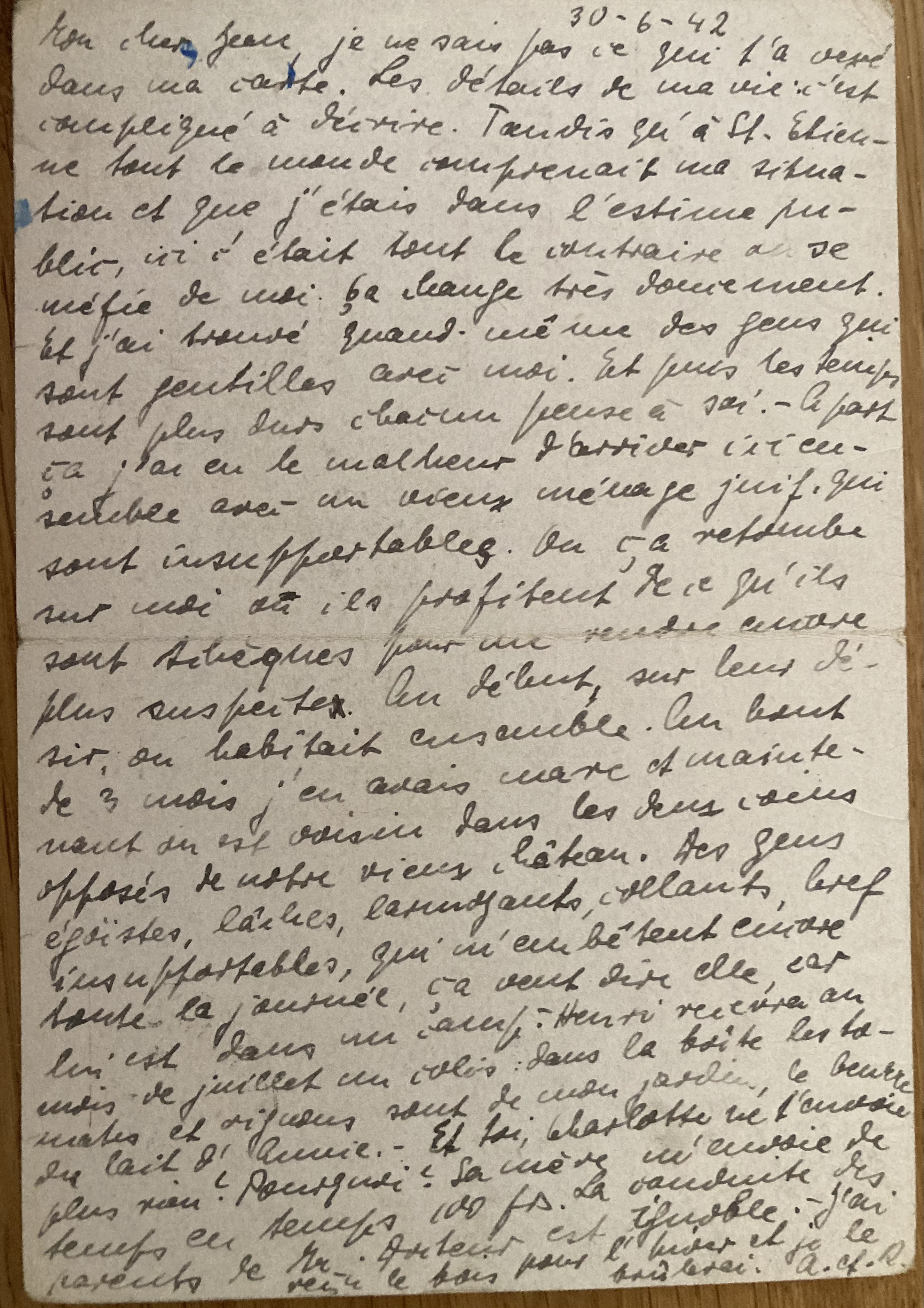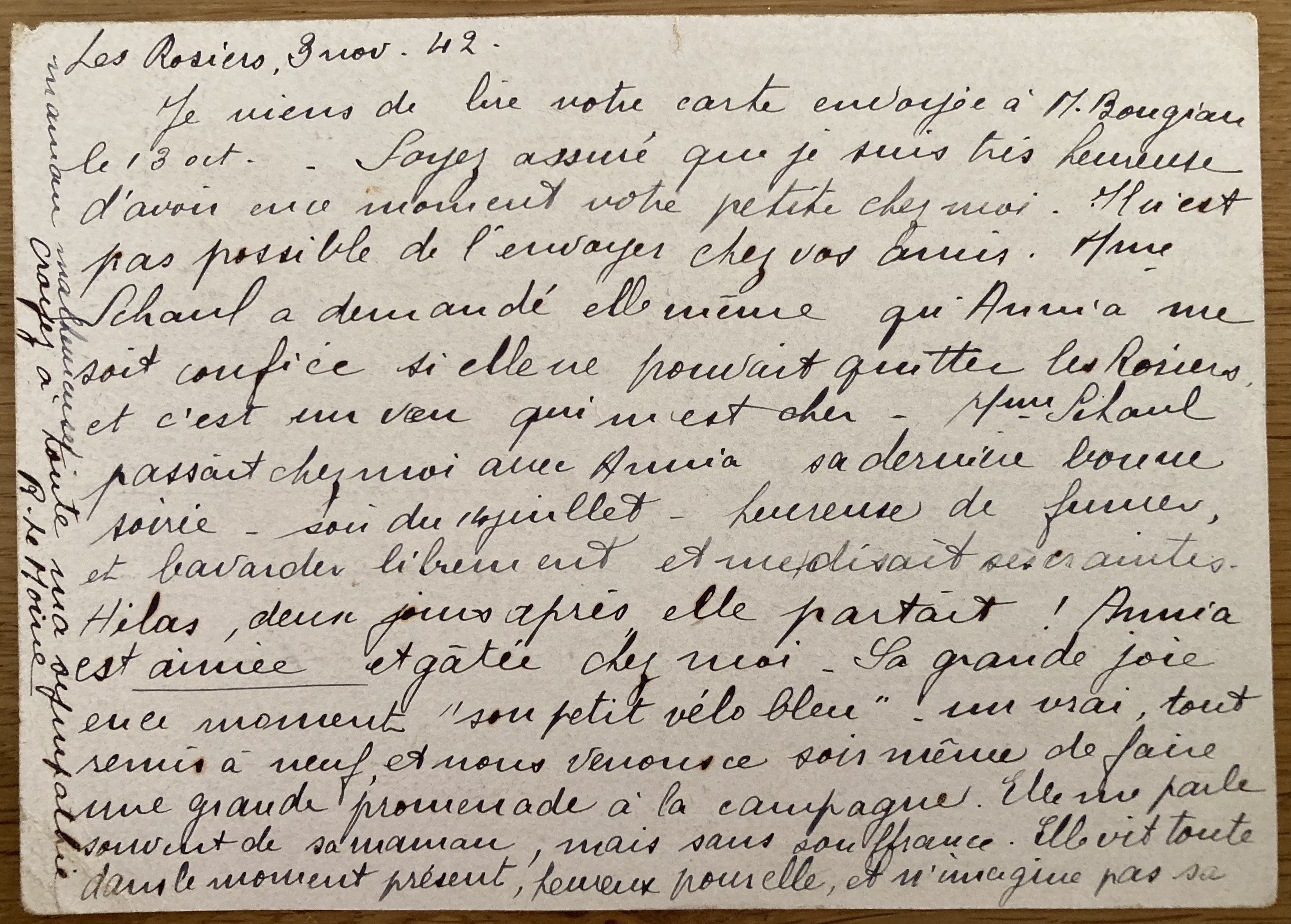 Les Rosiers, 3 nov. 42 Je viens de lire votre carte envoyée à M. Bougiau le 13 oct. Soyez assuré que je suis très heureuse d’avoir un moment votre petite chez moi. Il n’est pas possible de l’envoyer chez vos amis. Mme Schaul a demandé elle-même qu’Annia me soit confiée si elle ne pouvait quitter les Rosiers et c’est un voeu qui m’est cher. Mme Schaul passait chez moi avec Annia sa dernière bonne soirée, soir du 14 juillet, heureuse de fumer et bavarder librement et me disant ses craintes. Hélas, deux jours après elle partait ! Annia est aimée et gâtée chez moi. Sa grande joie en ce moment « son petit vélo bleu », un vrai, tout remis à neuf et nous venons ce soir même de faire une grande promenade à la campagne. Elle me parle souvent de sa maman, mais sans souffrance. Elle vit toute (NDLR : tout) dans le moment présent, heureuse pour elle, et n’imagine pas sa maman malheureuse. Croyez à toute ma sympathie. R. Le Moine