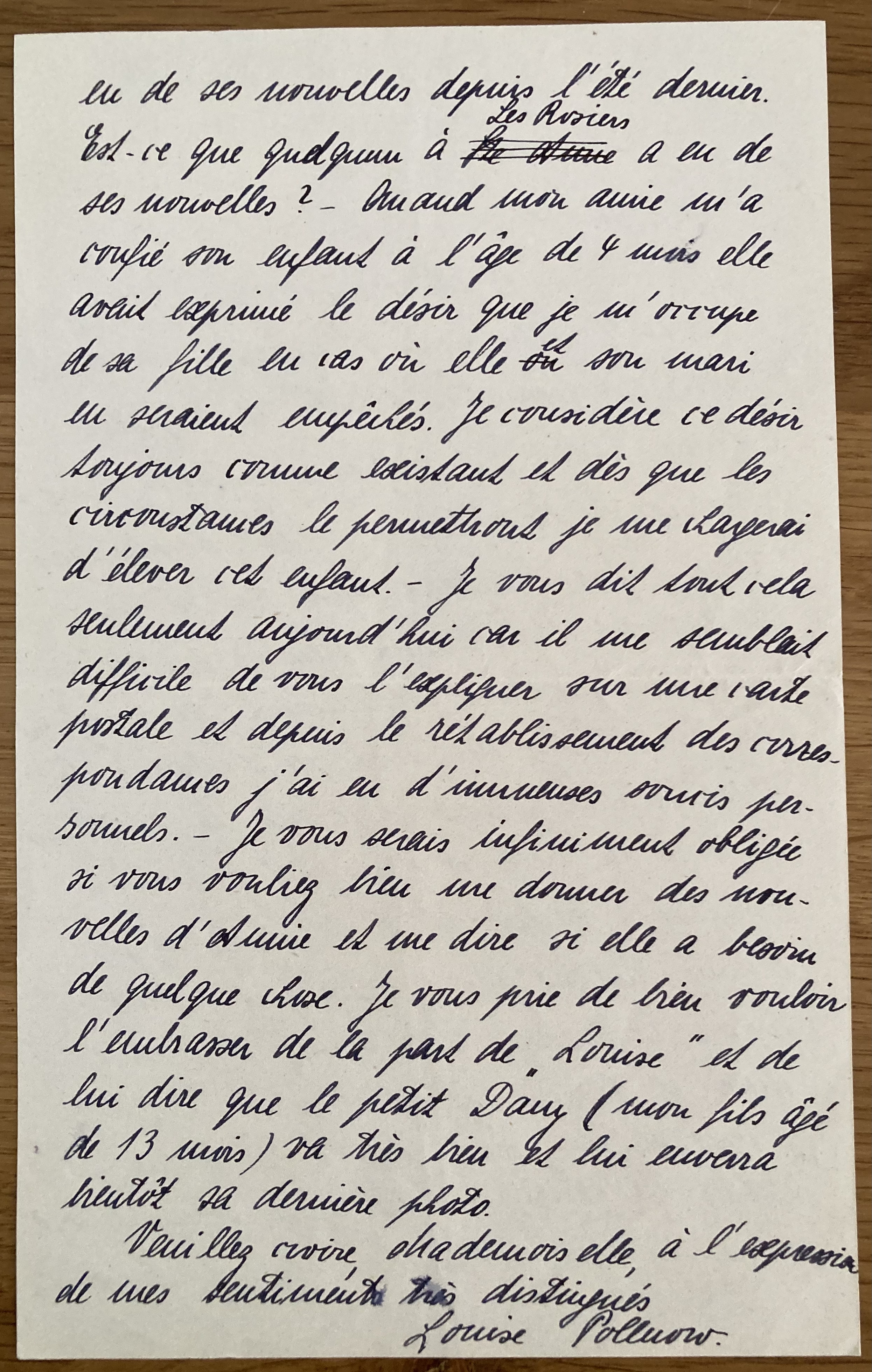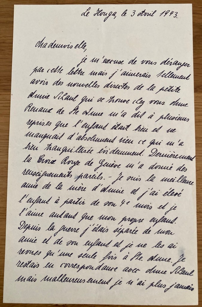 Le Houga, le 03 avril 1943 Mademoiselle, Je m’excuse de vous déranger par cette lettre mais j’aimerais tellement avoir des nouvelles directes de la petite Annie SCHAUL qui se trouve chez vous. Mme RENAUD de Sainte-Anne m’a dit à plusieurs reprises que l’enfant était bien et ne manquait d’absolument rien ce qui m’a bien tranquilisé évidemment. Dernièrement la Croix Rouge de Genève m’a donné des renseignements partiels. Je suis la meilleure amie de la mère d’Annie et j’ai élevé l’enfant à partir de son 4ème mois et je l’aime autant que mon propre enfant. Depuis la guerre, j’étais séparée de mon amie et de son enfant et je ne les ai revues qu’une seule fois à Sainte-Anne. Je restais en correspondance avec Mme SCHAUL mais malheureusement je n’ai plus jamais eu de ses nouvelles depuis l’été dernier. Est-ce quelqu’un aux Rosiers a eu de ses nouvelles ? Quand mon amie m’a confié son enfant à l’âge de 4 mois, elle avait exprimé le désir que je m’occupe de sa fille au cas où elle et son mari en seraient empêchés. Je considère ce désir toujours comme existant et dès que les circonstances le permettront, je me chargerai d’élever cet enfant. Je vous dit tout cela seulement aujourd’hui car il me semblait difficile de vous l’expliquer sur une carte postale et depuis le rétablissement des correspondances, j’ai eu d’immenses soucis personnels. Je vous serais infiniment obligée si vous vouliez bien me dire si elle a besoin de quelque chose. Je vous prie de bien vouloir l’embrasser de la part de « Louise » et de lui dire que le petit Dany (mon fils âgé de 13 mois) va très bien et lui enverra bientôt sa dernière photo. Veuillez croire, Mademoiselle, à l’expression de mes sentiments très distingués. Louise POLLNOW