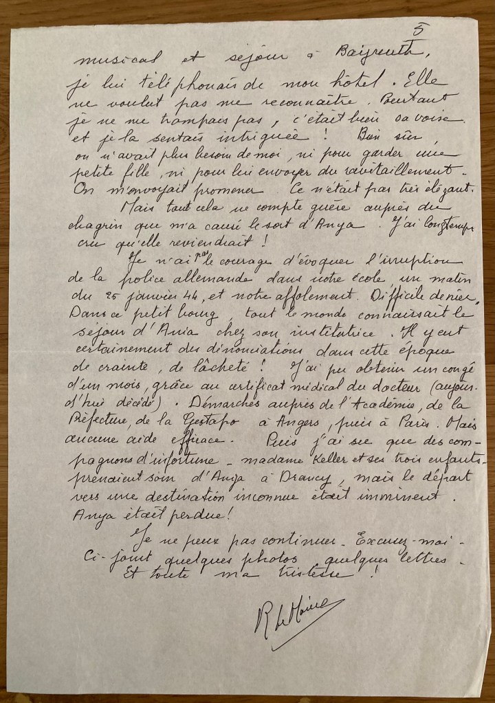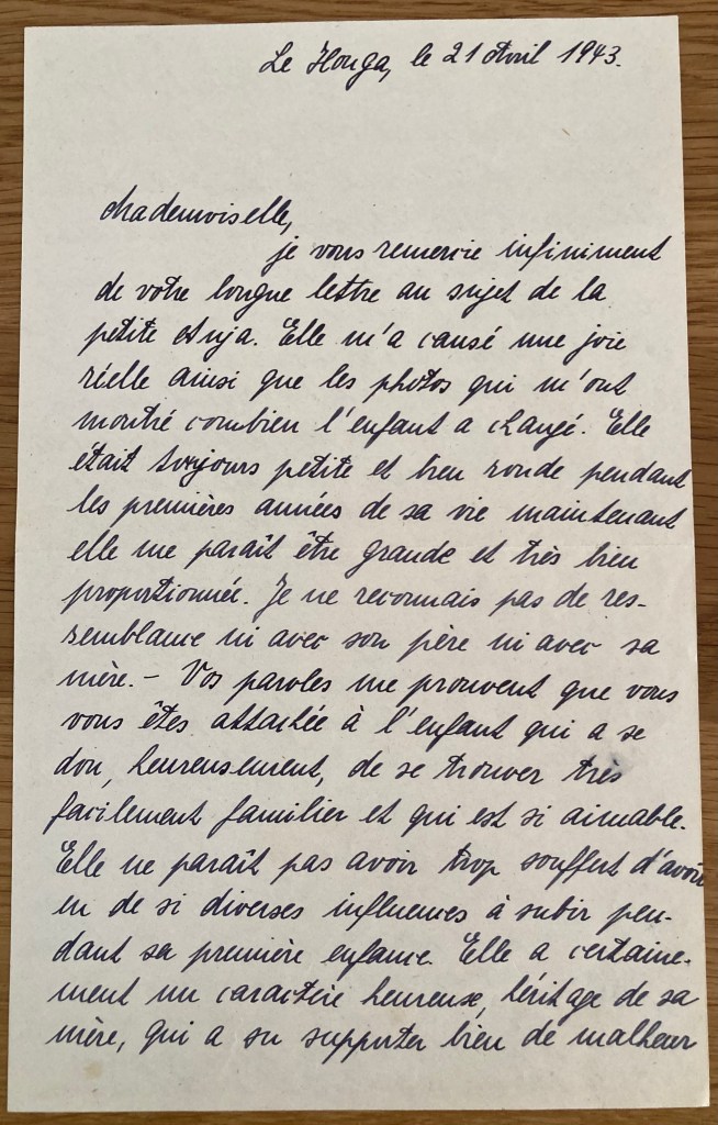 En avril 1943, Louise POLLNOW, la grande amie de Ruth et qui avait pris en charge Anja lorsque Ruth était en Espagne écrit à Mademoiselle LE MOINE pour voir des nouvelles d’Anja :