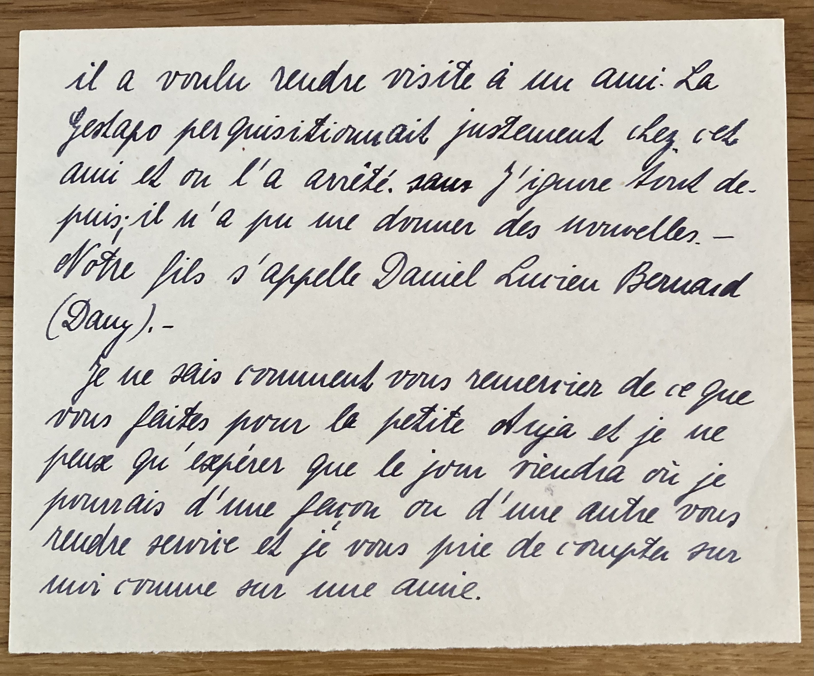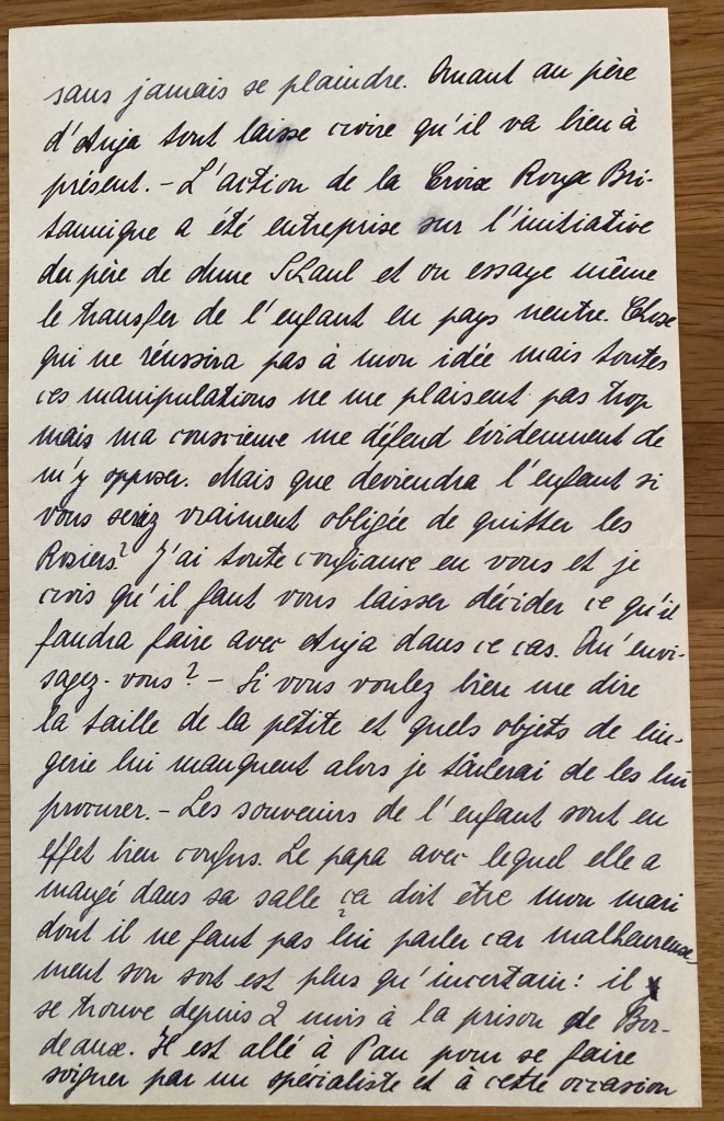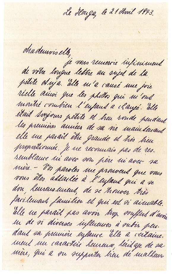 Le Houga, le 21 avril 1943 je vous remercie infiniment de votre longue lettre au sujet de la petite Anja. Elle m’a causé une joie réelle ainsi que les photos qui m’ont montré combien l’enfant a changé. Elle était toujours petite et bien ronde pendant les premières années de sa vie, maintenant elle me paraît être grande et très bien proportionnée. Je ne reconnais pas de ressemblance ni avec son père ni avec sa mère. Vos paroles me prouvent que vous êtes attachée à l’enfant qui a ce don, heureusement, de se trouver très facilement familier et qui est si aimable. Elle ne paraît pas avoir trop souffert d’avoir eu de si diverses influences à subir pendant sa première enfance. Elle a certainement un caractère heureux, héritage de sa mère, qui a su supporter bien du malheur sans jamais se plaindre. Quant au père d’Anja, tout laisse croire qu’il va bien à présent. L’action de la Croix Rouge Britannique a été entreprise sur l’initiative du père de Mme Schaul et on essaye même le transfert de l’enfant en pays neutre. Chose qui ne réussira pas à mon idée mais toutes ces manipulations ne me plaisent pas trop mais ma conscience me défend évidemment de m’y opposer. Mais que deviendra l’enfant si vous seriez vraiment obligée de quitter les Rosiers ? J’ai toute confiance en vous et je crois qu’il faut vous laisser décider ce qu’il faudra faire avec Anja dans ce cas. Qu’envisagez-vous ? Si vous voulez bien me dire la taille de la petite et quels objets de lingerie lui manquent, alors je tâcherai de les lui procurer. Les souvenirs de l’enfant sont en effet bien confus. Le papa avec lequel elle a mangé dans sa salle, ça doit être mon mari dont il ne faut pas lui parler car malheureusement, son sort est plus qu’incertain : il se trouve depuis 2 mois à la prison de Bordeaux. Il est allé à Pau pour se faire soigner par un spécialiste et à cette occasion, il a voulu rendre visite à un ami. La Gestapo perquisitionnait justement chez cet ami et on l’a arrêté. J’ignore tout depuis ; il n’a pu donner des nouvelles. Notre fils s’appelle Daniel Lucien Bernard (Dany). Je ne sais comment vous remercier de ce que vous faites pour la petite Anja et je ne peux qu’espérer que le jour viendra où je pourrais d’une façon ou d’une autre vous rendre service et je vous prie de compter sur moi comme sur une amie. Je vous prie de croire, Mademoiselle, à l’assurance de mes sentiments les meilleurs. L. Pollnow