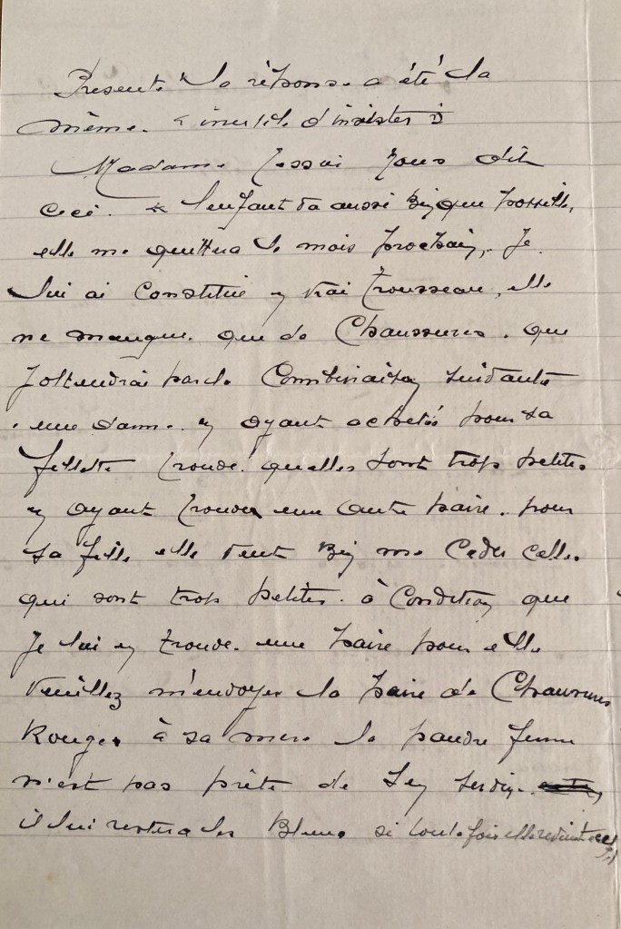 J’ai été bien contente de mes meuble (meubles). Mamette les sa (a) peints an (en) rose et des petites fleurs bleues. J’ai écrit au père Noël. J’ai demandé de la vaisselle six fourchettes six cuillères une cuisinière. une cocotte. Je sais faire des problèmes. Viens donc dimanche. Je t’embrasse bien fort.