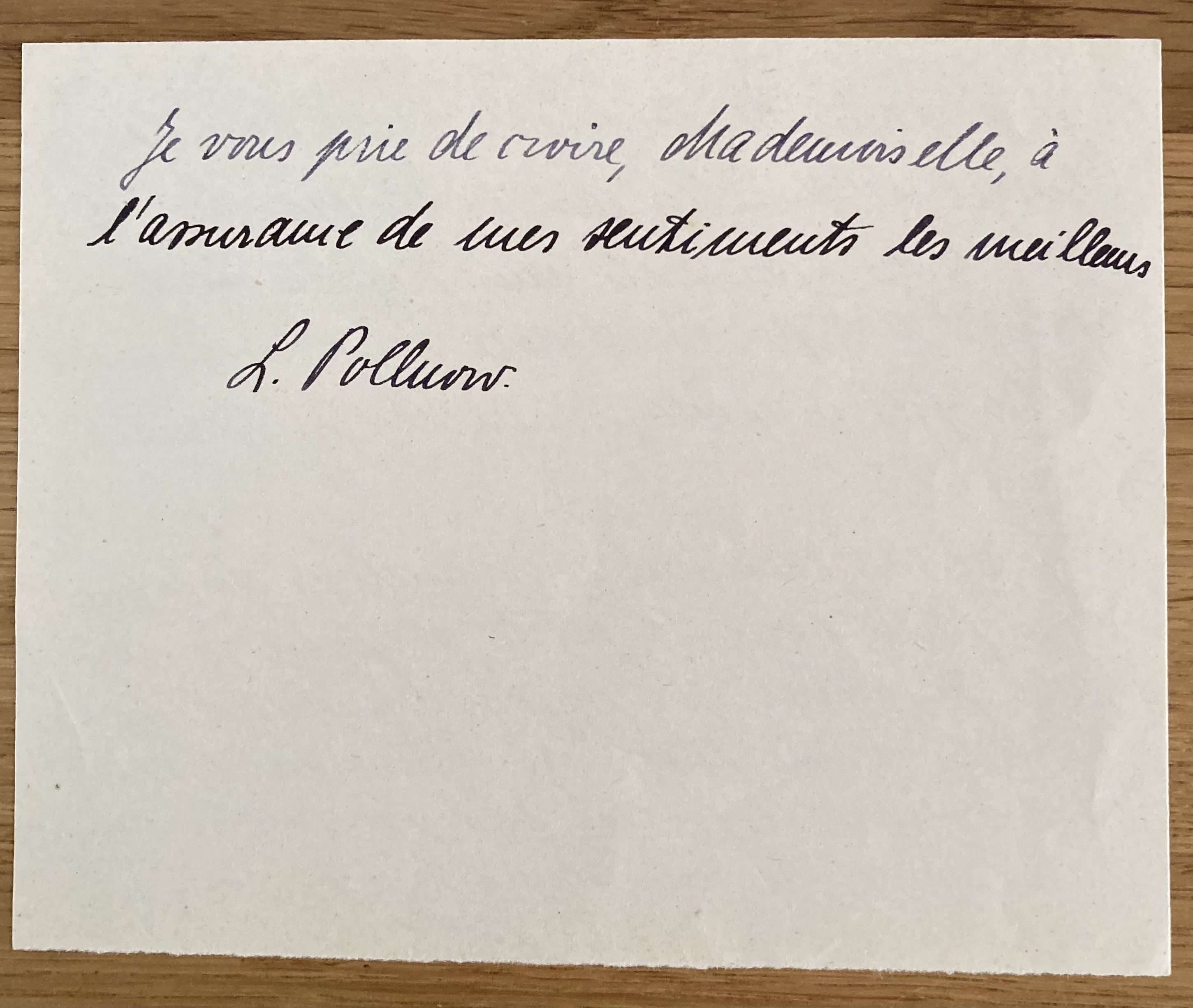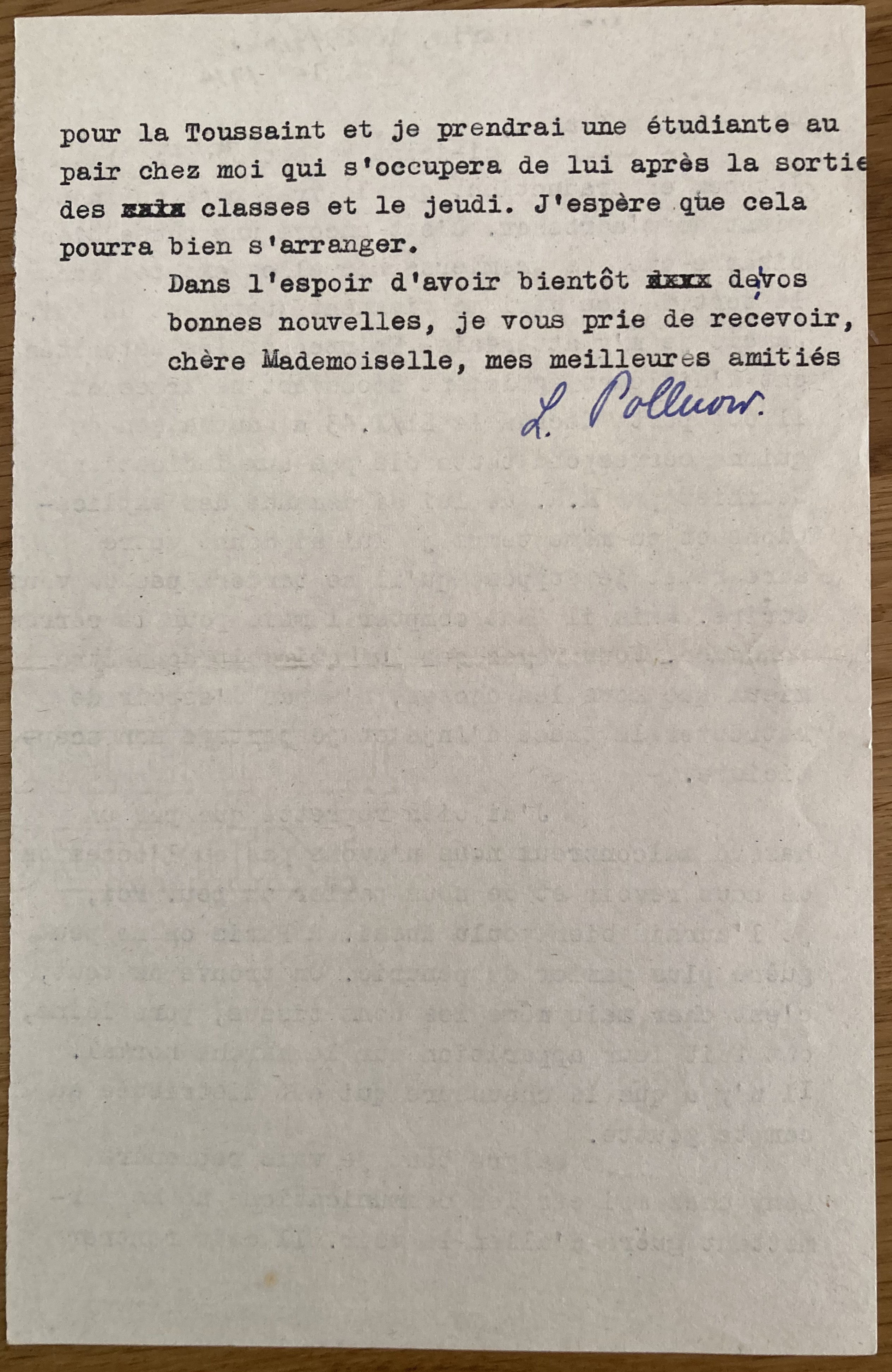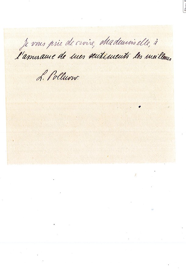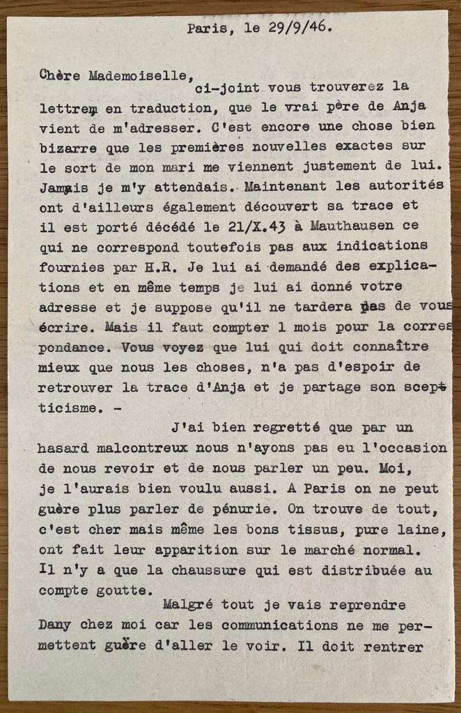 Paris, le 29/9/46 Chère Mademoiselle, ci-joint vous trouverez la lettre en traduction que le vrai père de Anja vient de l’adresser. C’est encore une chose bien bizarre que les premières nouvelles exactes sur le sort de mon mari me viennent justement de lui. Jamais je m’y attendais. Maintenant les autorités ont d’ailleurs également découvert sa trace et il est porté décédé le 21X43 à Mauthausen ce qui ne correspond toutefois pas aux indications fournies par H.R. Je lui ai demandé des explications en même temps que je lui ai donné votre adresse et je suppose qu’il ne tardera pas de vous écrire. Mais il faut compter 1 mois pour la correspondance. Vous voyez que lui qui doit connaître mieux que nous les choses, n’a pas d’espoir de retrouver la trace d’Anja et je partage son scepticisme. J’ai bien regretté que par un hasard malencontreux nous n’ayons pas eu l’occasion de nous revoir et de nous parler un peu. Moi, je l’aurais bien voulu aussi. A Paris on ne peut plus guère parler de pénurie. On trouve de tout, c’est cher mais même les bons tissus, pure laine, ont fait leur apparition sur le marché normal. Il n’y a que la chaussure qui est distribuée au compte goutte. Malgré tout je vais reprendre Dany chez moi car les communications ne me permettent guère d’aller le voir. Il doit rentrer pour la Toussaint et je prendrai une étudiante au pair chez moi qui s’occupera de lui après la sortie des classes et le jeudi. J’espère que cela pourra s’arranger. Dans l’espoir d’avoir bientôt de vos bonnes nouvelles, je vous prie de recevoir, chère Mademoiselle, mes meilleres amitiés. L. Pollnow