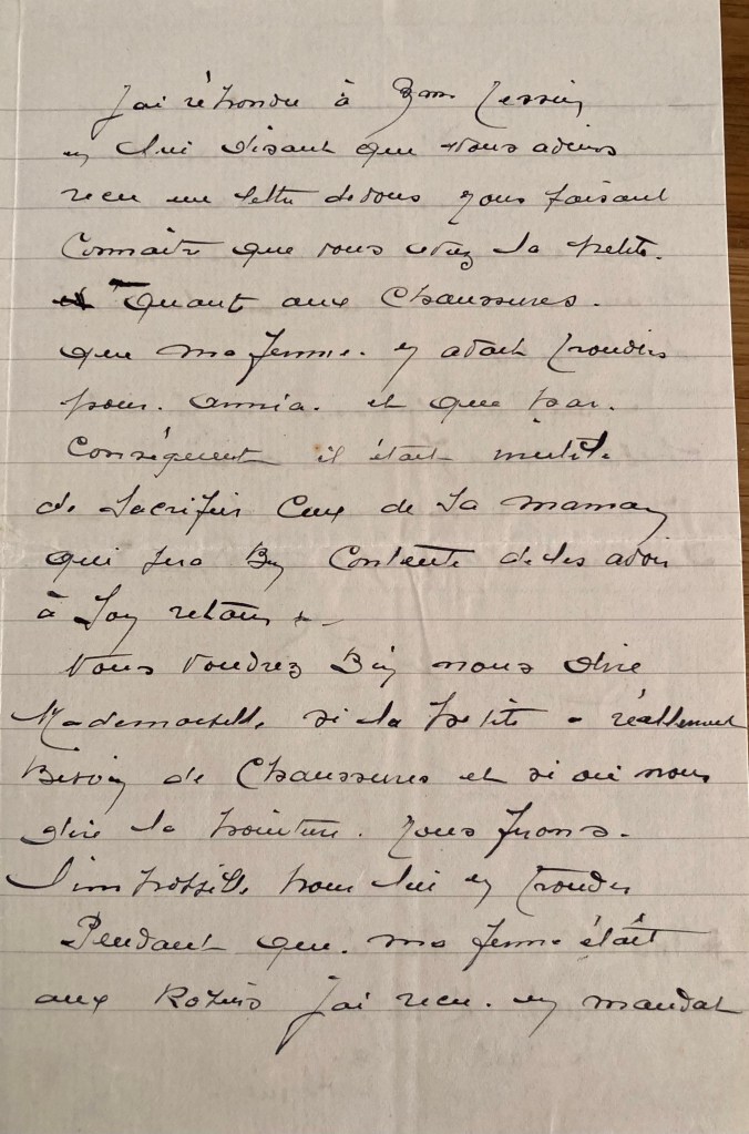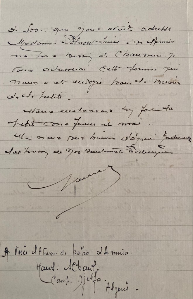 J’au eu votre belle petite fille à la rentrée d’octobre. Elle habite maintenant chez moi et fait ma joie. Je souhaite vous la garder. Bien qu’elle lise couramment, je la garde encore cette anée dans ma petite classe maternelle où le travail reste encore libre et joyeux. Elle vous écrira régulièrement. Annie m’a dit : « Maintenant que je suis chez vous, vous enverrez des colis à mon papa… » et bien d’autres choses. Ne la privez pas de cette joie et donnez-nous les indications nécessaires pour qu’elle vous envoie de temps en temps un colis. Je ne manque ni de farine, ni de pain. Mme BOUGIAU, la femme du maire, s’intéresse beaucoup à Annia et a complété généreusement son trousseau d’hiver, trousseau chaud et coquet qui enchante Annia. Soyez tranquillisé sur le sort de votre chère petite fille et recevez l’expression de mes sentiments distingués.