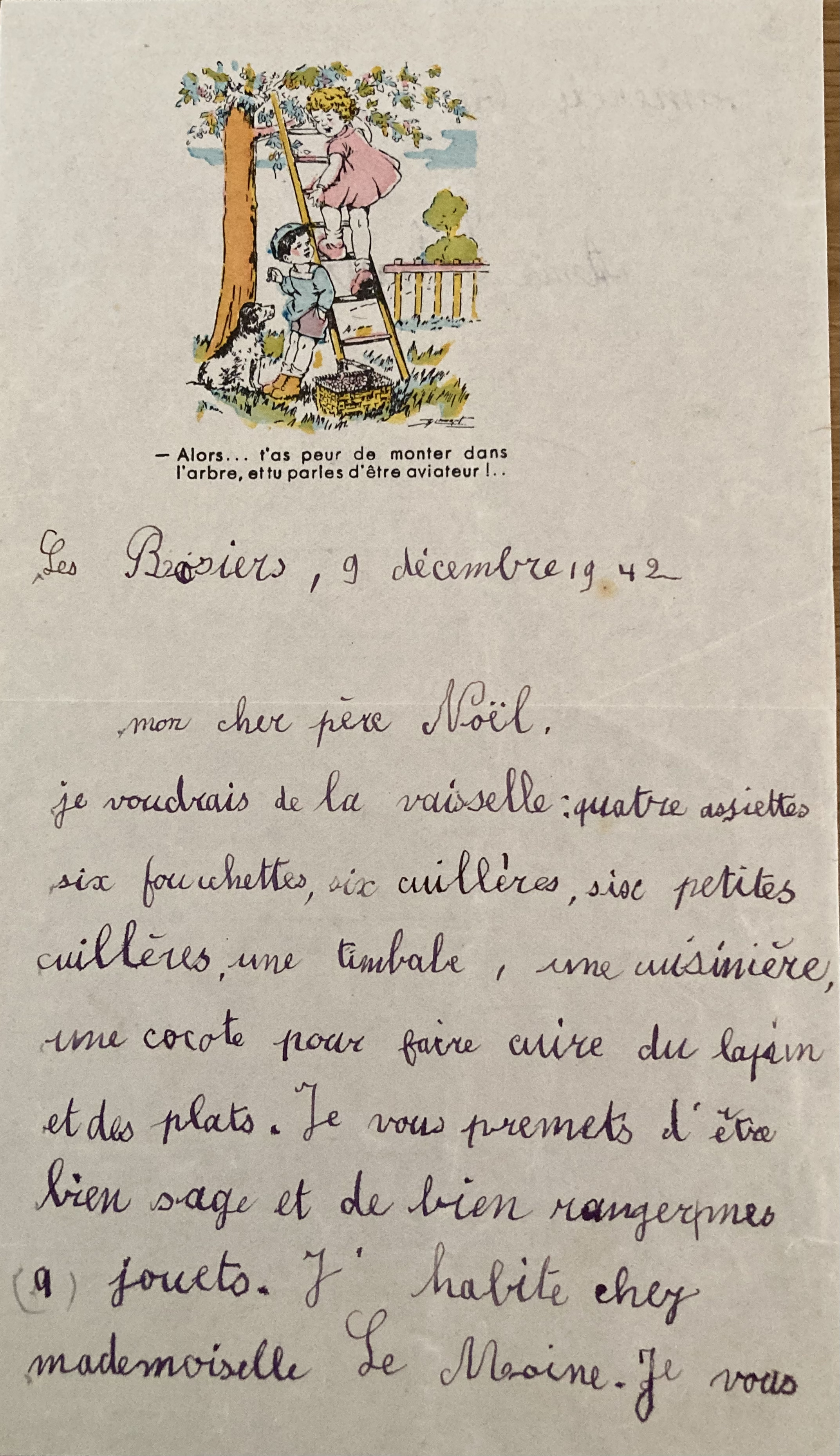 je voudrais de la vaisselle : quatre assiettes, six fourchettes, six cuillères, une timbale, une cuisinière, une cocotte pour faire cuire du lapin et des plats. Je vous premets (promets) d’être bien sage et de bien ranger mes jouets. J’habite chez mademoiselle Le Moine. Je vous remercie bien.
