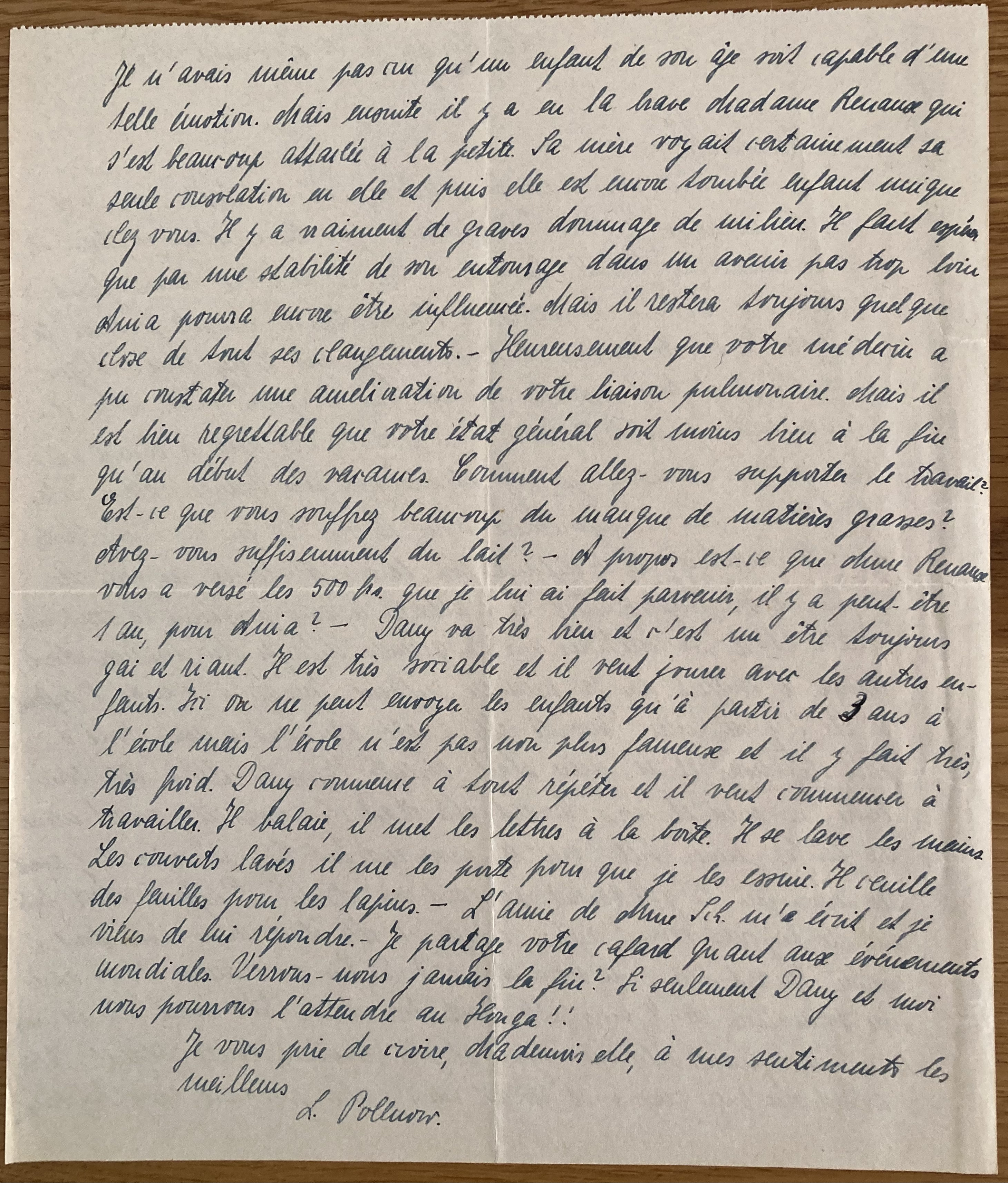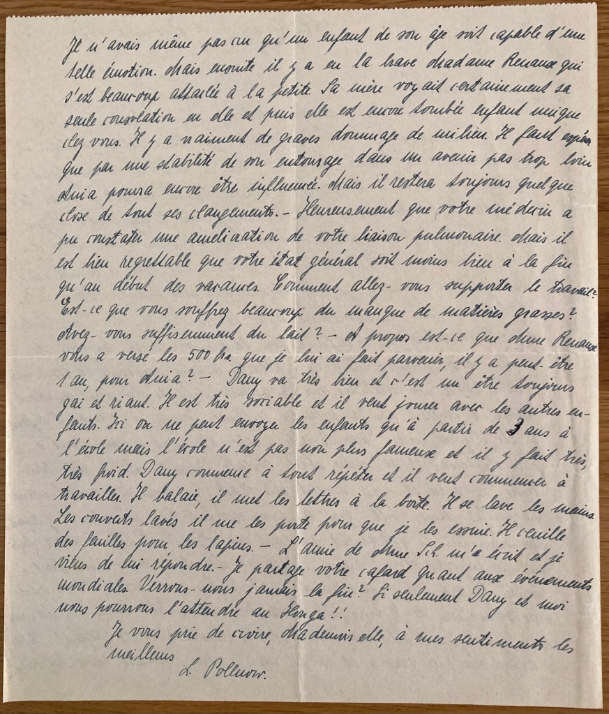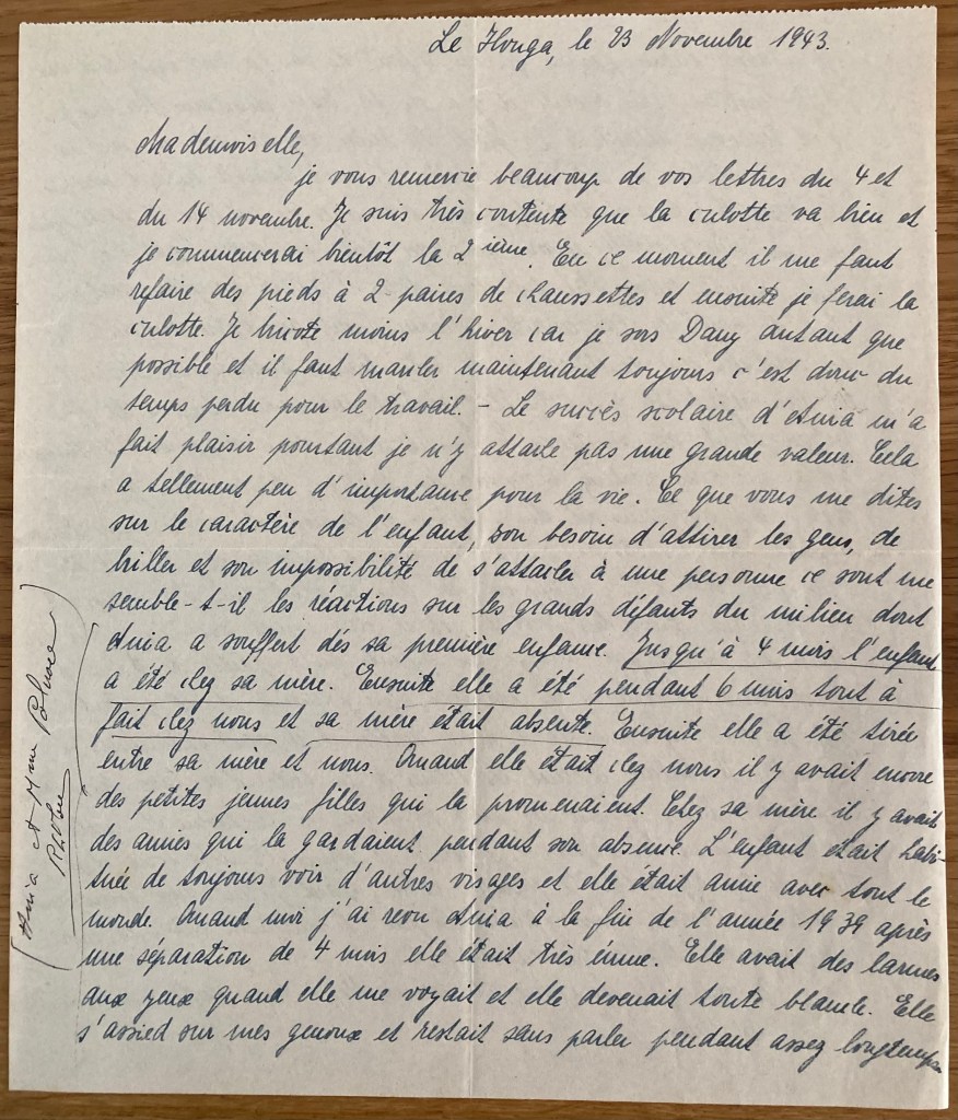 Le Houga, le 23 Novembre 1943 Mademoiselle, je vous remercie beaucoup de vos lettres du 04 et du 14 novembre. Je suis très contente que la culotte va bien et je commencerai bientôt la 2ème. En ce moment, il me faut refaire des pieds à 2 paires de chaussettes et ensuite je ferai la culotte. Je tricote moins l’hiver car je sors Dany autant que possible et il faut marcher maintenant toujours, c’est donc du temps perdu pour le travail. Le succès scolaire d’Ania m’a fait plaisir pourtant je n’y attache pas une grande valeur. Cela a tellement peu d’importance pour la vie. Ce que vous me dites sur le caractère de l’enfant, son besoin d’attirer les gens, de briller et son impossibilité de s’attacher à une personne, ce sont me semble-t-il les réactions sur les grands défauts du milieu dont Ania a souffert dès sa première enfance. Jusqu’à 4 mois, l’enfant a été chez sa mère. Ensuite, elle a été pendant 6 mois tout à fait fait chez nous et sa mère était absente. Ensuite, elle a été entre sa mère et nous. Quand elle était chez nous, il y avait encore des petites jeunes filles qui la promenaient. Chez sa mère, il y a avait des amies qui la gardaient pendant son absence. l’enfant était habituée de toujours voir d’autres visages et elle était amie avec tout le monde. Quand moi j’ai revu Anja à la fin de l’année 1939 après une séparation de 4 mois, elle était très émue. Elle avait des larmes aux yeux quand elle me voyait et elle devenait toute blanche. Elle s’assied sur mes genoux et restait sans parler pendant assez longtemps. Je n’avais même pas cru qu’un enfant de son âge soit capable d’une telle émotion. Mais ensuite, il y a eu la brave Madame Renaud qui s’est beaucoup attachée à la petite. Sa mère voyait certainement sa seule consolation en elle et puis elle est encore tombée enfant unique chez vous. Il y a vraiment de graves dommages de milieu. Il faut espérer que par une stabilité de son entourage dans un avenir pas trop loin, Ania pourra encore être influencée. Mais il restera toujours quelque chose de tous ces changements. Heureusement que votre médecin a pu constater une amélioration de votre liaison pulmonaire. Mais il est bien regrettable que votre état général soit moins bien à la fin qu’au début des vacances. Comment allez-vous supporter le travail ? Est-ce que vous souffrez beaucoup du manque de matières grasses ? Avez-vous suffisemment de lait ? A propos, est-ce que Madame Renaud vous a versé les 500 frs que je lui ai fait parvenir il y a à peu près 1 an pour Anja ? Dany va très bien et c’est un être toujours gai et riant. Il est très sociable et il veut jouer avec les autres enfants. Ici, on ne peut envoyer les enfants qu’à partir de 3 ans à l’école mais l’école n’est pas non plus fameuse et il y fait très très froid. Dany commence à tout répéter et il veut commencer à travailler. Il balaie, il met les lettres à la boîte. Il se lave les mains. Les couverts lavés, il me les porte pour que le les essuie. Il cueille des feuilles pour les lapins. L’amie de Mme Schaul m’a écrit et je viens de lui répondre. Je partage votre cafard quand aux évènements mondiales. Verrons-nous jamais la fin ? Si seulement Dany et moi, nous pourrons l’attendre au Houga !! Je vous prie de croire, Mademoiselle, à mes sentiments les meilleurs L. Pollnow