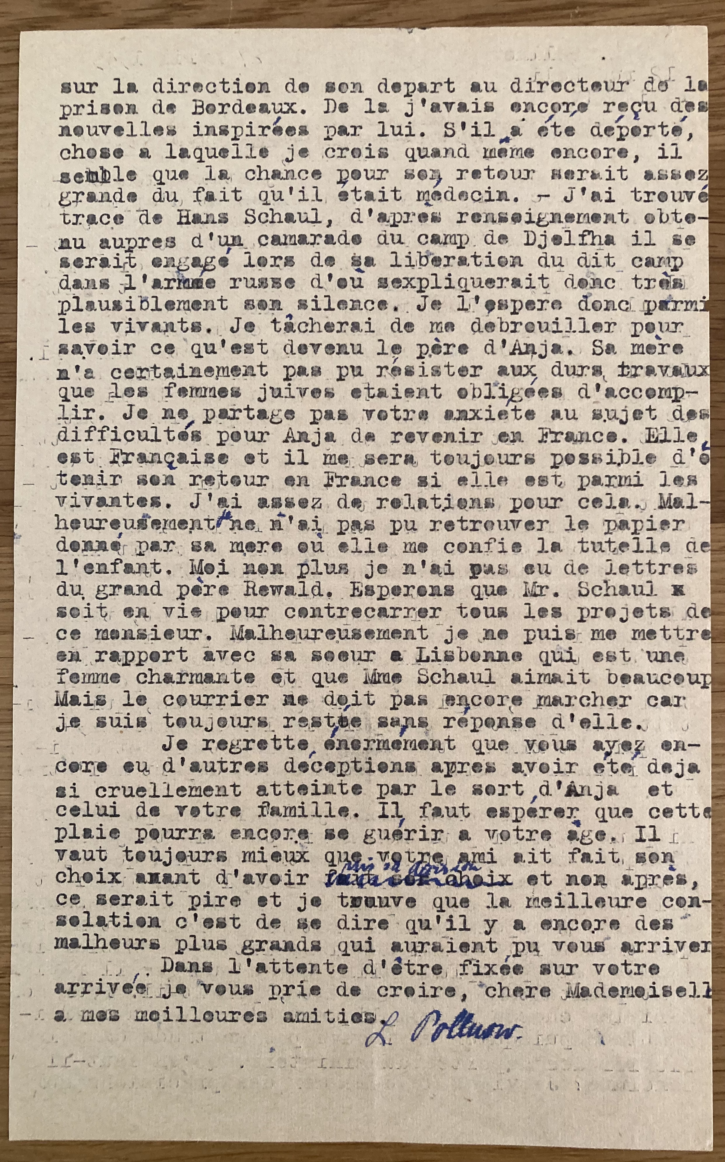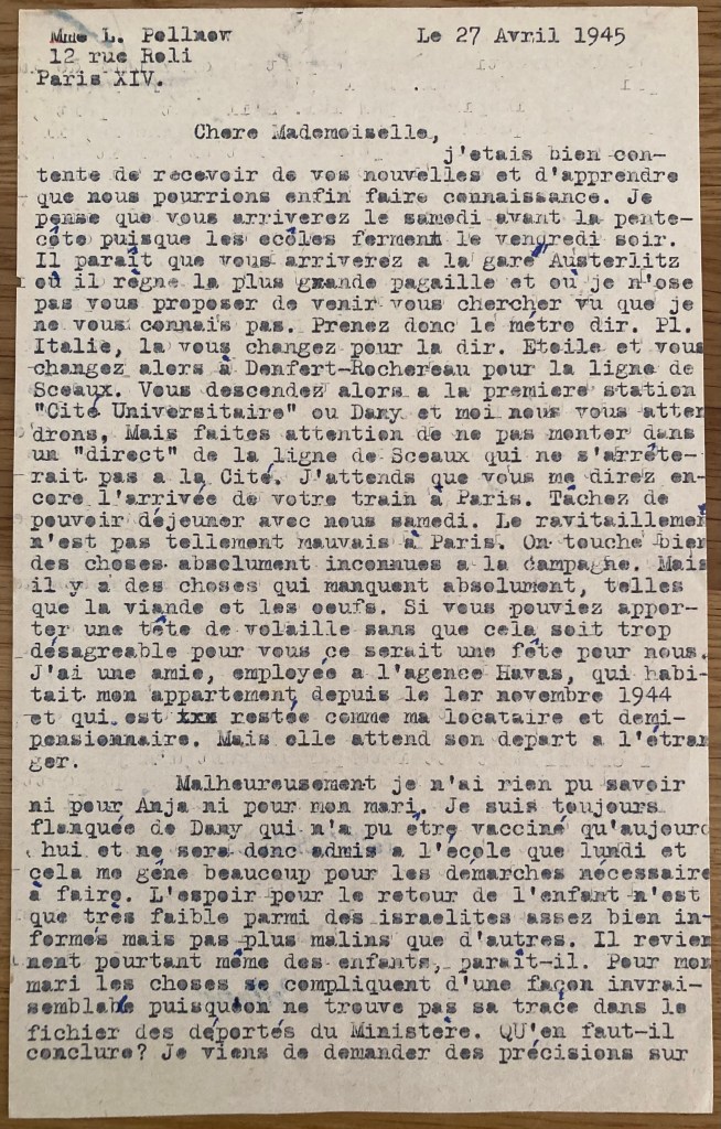 Le 27 Avril 1945 Mme L. Pollnow 12, Rue Roli Paris XIV. Chère Mademoiselle, j’étais bien contente de recevoir de vos nouvelles et d’apprendre que nous pourrions enfin faire connaissance. Je pense que vous arriverez le samedi avant la pentecôte puisque les écoles ferment le vendredi soir. Il paraît que vous arriverez à la gare d’Austerlitz où il règne la plus grande pagaille et où je n’ose pas vous proposer de venir vous chercher vu que je ne vous connais pas. Prenez donc le métro dir. Pl. Italie, là vous changez pour la dir. Etoile et vous changez alors à Denfert-Rochereau pour la ligne de Sceaux. Vous descendez alors à la première station « Cité Universitaire » où Dany et moi vous attendrons. Mais faites attention de ne pas monter dans un « direct » de la ligne de Sceaux qui ne s’arrêterait pas à la Cité. J’attends que vous me direz encore l’arrivée de votre train à Paris. Tachez de pouvoir déjeuner avec nous samedi. Le ravitaillement n’est pas tellement mauvais à Paris. On touche bien des choses absolument inconnues à la campagne. Mais il y a des choses qui manquent absolument, telles que la viande et les oeufs. Si vous pouviez apporter une tête de volaille sans que cela soit trop désagréable pour vous, ce serait une fête pour nous. J’ai une amie, employée à l’agence Havas, qui habitait mon appartement depuis le 1er novembre 1944 et qui est restée comme ma locataire et demi-pensionnaire. Mais elle attend son départ à l’étranger. Malheureusement, je n’ai rien pu savoir ni pour Anja ni pour mon mari. Je suis toujours flanquée de Dany qui n’a pu être vacciné qu’aujourd’hui et ne sera donc admis à l’école que lundi et cela me gêne beaucoup pour les démarches nécessaires à faire. L’espoir pour le retour de l’enfant n’est que très faible parmi des israélites assez bien informés mais pas plus malins que les autres. Il revient pourtant même des enfants, parait-il. Pour mon mari, les choses se compliquent d’une façon invraisemblable puisqu’on ne trouve pas sa trace dans le fichier des déportés du Ministère. Qu’en faut-il conclure ? Je viens de demander des précisions sur la direction de son départ au directeur de la prison de Bordeaux. De là j’avais encore reçu des nouvelles inspirées par lui. S’il a été déporté, chose à laquelle je crois quand même encore, il semble que la chance pour son retour serait assez grande du fait qu’il était médecin. J’ai trouvé trace d »Hans Schaul, d’après renseignement obtenu auprès d’un camarade du camp de Djelfa. Il se serait engagé lors de sa libération du dit camp dans l’armée russe d’où expliquerait très plausiblement son silence. Je l’espère donc parmi les vivants. Je tâcherai de me débrouiller pour savoir ce qu’est devenu le père d’Anja. Sa mère n’a certainement pas pu résister aux durs travaux que les femmes juives étaient obligées d’accomplir. Je ne partage pas votre anxiété au sujet des difficultés pour Anja de revenir en France. Elle est Française et il me sera toujours possible d’obtenir son retour en France si elle est parmi les vivantes. J’ai assez de relations pour cela. Malheureusement, je n’ai pas pu retrouver le papier donné par sa mère où elle me confie la tutelle de l’enfant. Moi non plus je n’ai pas eu de lettres du grand-père Rewald. Espérons que Mr. Schaul soit en vie pour contrecarrer tous les projets de ce monsieur. Malheureusement je ne puis me mettre en rapport avec sa soeur à Lisbonne qui est une femme charmante et que Mme Schaul aimait beaucoup. Mais le courrier ne doit pas encore marcher car je suis toujours restée sans réponses d’elle. Je regrette énormément que vous ayez encore eu d’autres déceptions après avoir été déjà si cruellement atteinte par la mort d’Anja et celui de votre famille. Il faut espérer que cette plaie pourra encore se guérir à votre âge. Il vaut toujours mieux que votre ami ait fait son choix avant d’avoir [illisible] et non après, ce serait pire et je trouve que la meilleure consolation c’est de se dire qu’il y a encore des malheurs plus grands qui auraient pu vous arriver. Dans l’attente d’être fixée sur votre arrivée, je vous prie de croire, chère Mademoiselle, à mes meilleures amitiés. L. Pollnow