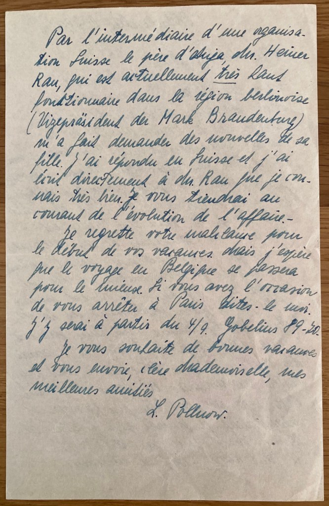 Chère Mademoiselle, Votre lettre m’a suivie en Alsace où nous passons de bonnes vacances dans un beau pays entourés de la bonne amitié de nos anciens camarades d’exil. Malheureusement il ne fait pas bien beau temps. Demain j’irai faire un petit tour à Strasbourg. Dimanche nous irons au Vieil Armand si le temps le permettra. Dany est heureux en compagnie de ses camarades du Houga. Nous rentrerons début septembre à Paris et je commencerai un nouvel emploi le 15/9. La maison est mieux et le poste plus intéressant et la rétribution est également meilleure. Mais il y aura davantage de travail et j’aurai des déplacements à faire. De ce fait, Dany restera en nourrice en Seine-et-Marne. Mais cela ne peut être que passager et certainement je finirai par prendre une bonne. Mais c’est un article rare et il faut avoir assez de méfiance. Par l’intermédiaire d’une organisation suisse, le père d’Anja, dir. Heiner RAU, qui est actuellement très haut fonctionnaire dans la région berlinoise (Vizepräsident der Mark Brandeburg) m’a fait demander des nouvelles de sa fille. J’ai répondu en Suisse et j’ai écrit directement à Mr Rau que je connais très bien. Je vous tiendrai au courant de l’évolution de l’affaire. Je regrette votre malchance pour le début de vos vacances mais j’espère que le voyage en Belgique se passera pour le mieux. Si vous avez l’occasion de vous arrêter à Paris, dites-le moi. J’y serai à partir du 4/9. Gobelins 89-70. Je vous souhaite de bonnes vacances et vous envoie, chère Mademoiselle, mes meilleures amitiés. L. Pollnow