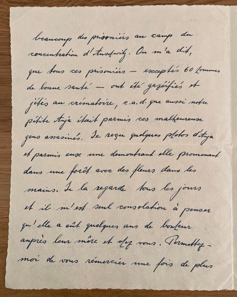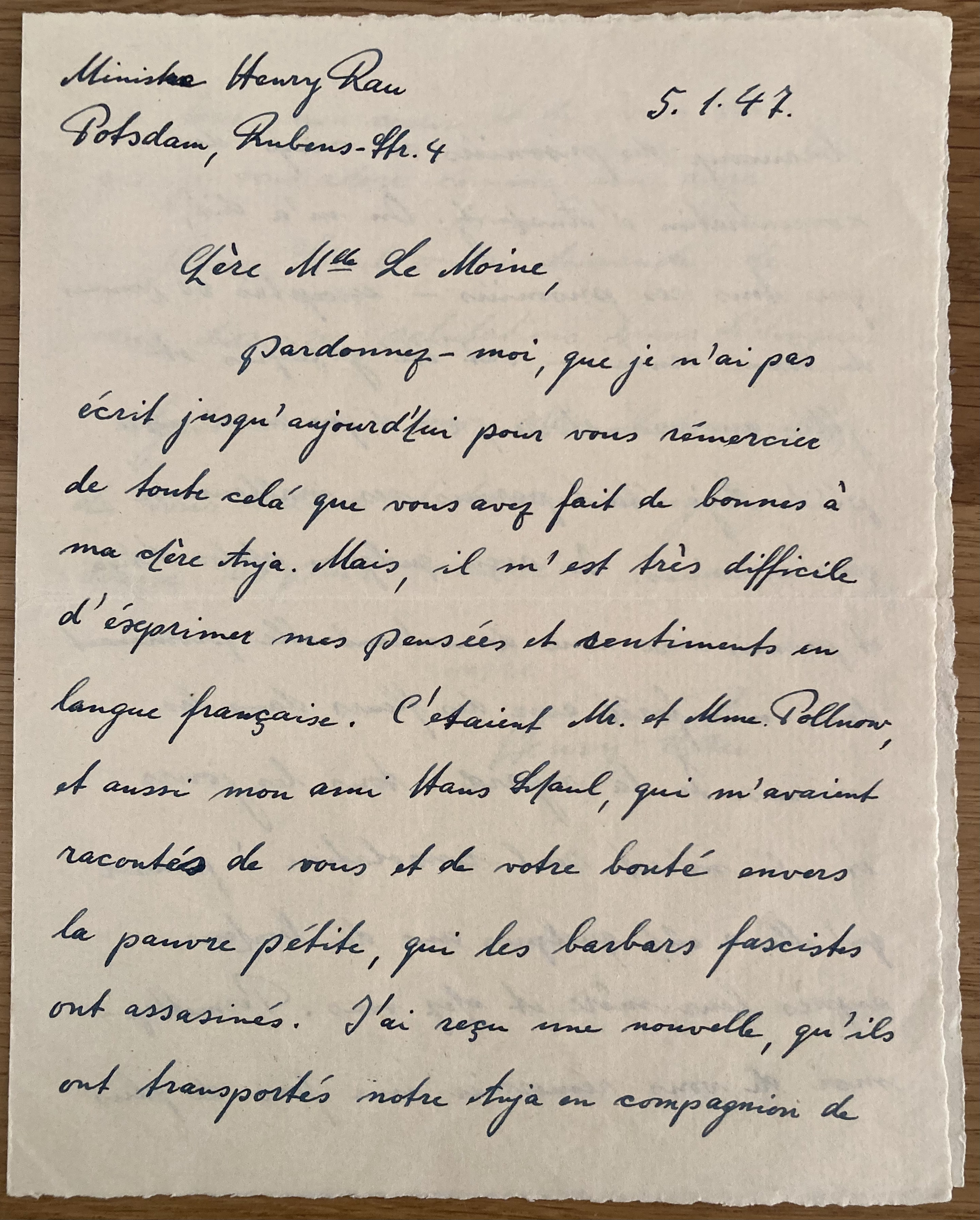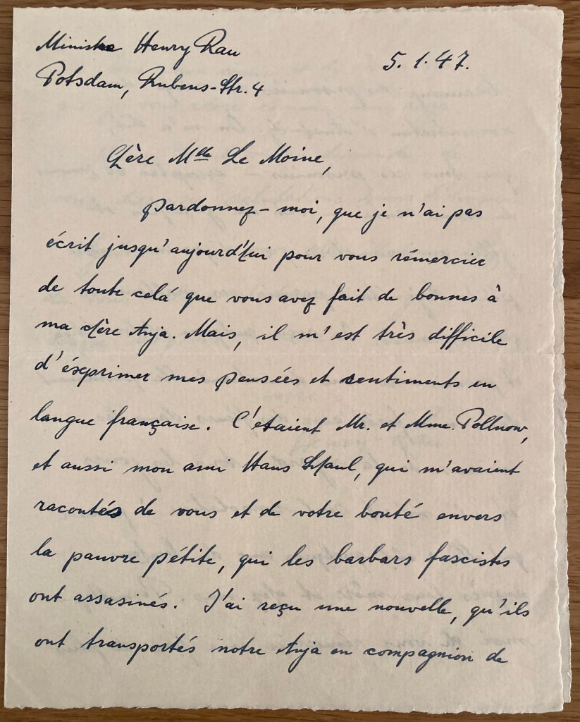 5.1.47 Ministre Henry RAU Postdam, Rubens Strasse 4 Chère Mlle Le Moine, Pardonnez-moi que je n’ai pas écrit jusqu’à aujourd’hui pour vous remercier de tout cela que vous avez fait de bonnes à ma chère Anja. Mais il m’est très difficile d’exprimer mes pensées et sentiments en langue française. C’étaient M et Mme Pollnow, et aussi mon ami Hans Schaul, qui m’avaient racontés de vous et de votre bonté envers la pauvre petite qui les barbares fascistes ont assassinés. J’ai reçu une nouvelle, qu’ils ont transportés notre Anja en compagnion de beaucoup de prisonniers au camp de concentration d’Auschwitz. On m’a dit, que tous ces prisonniers – exceptés 60 hommes en bonne santé – ont été gazéifiés et jetés au crématoire, c.a.d. que aussi notre petite Anja était parmi ces malheureux gens assassinés. J’ai reçu quelques photos d’Anja et parmi eux une démontrant elle promenant dans une forêt avec des fleurs dans les mains. Je la regarde tous les jours et il m’est seul consolation à penser qu’elle a eût quelques ans de bonheur auprès leur mère et chez vous. Permettez-moi de vous remercier une fois de plus de tout mon coeur et de vous dire que je vous adore come un ange. Hans Schaul m’as demandé de vous dire ses salutations bien distingués. Agrée aussi à moi, chère Mademoiselle, de vous saluer et de vous envoyer mes voeux les plus mieux. votre Henry Rau