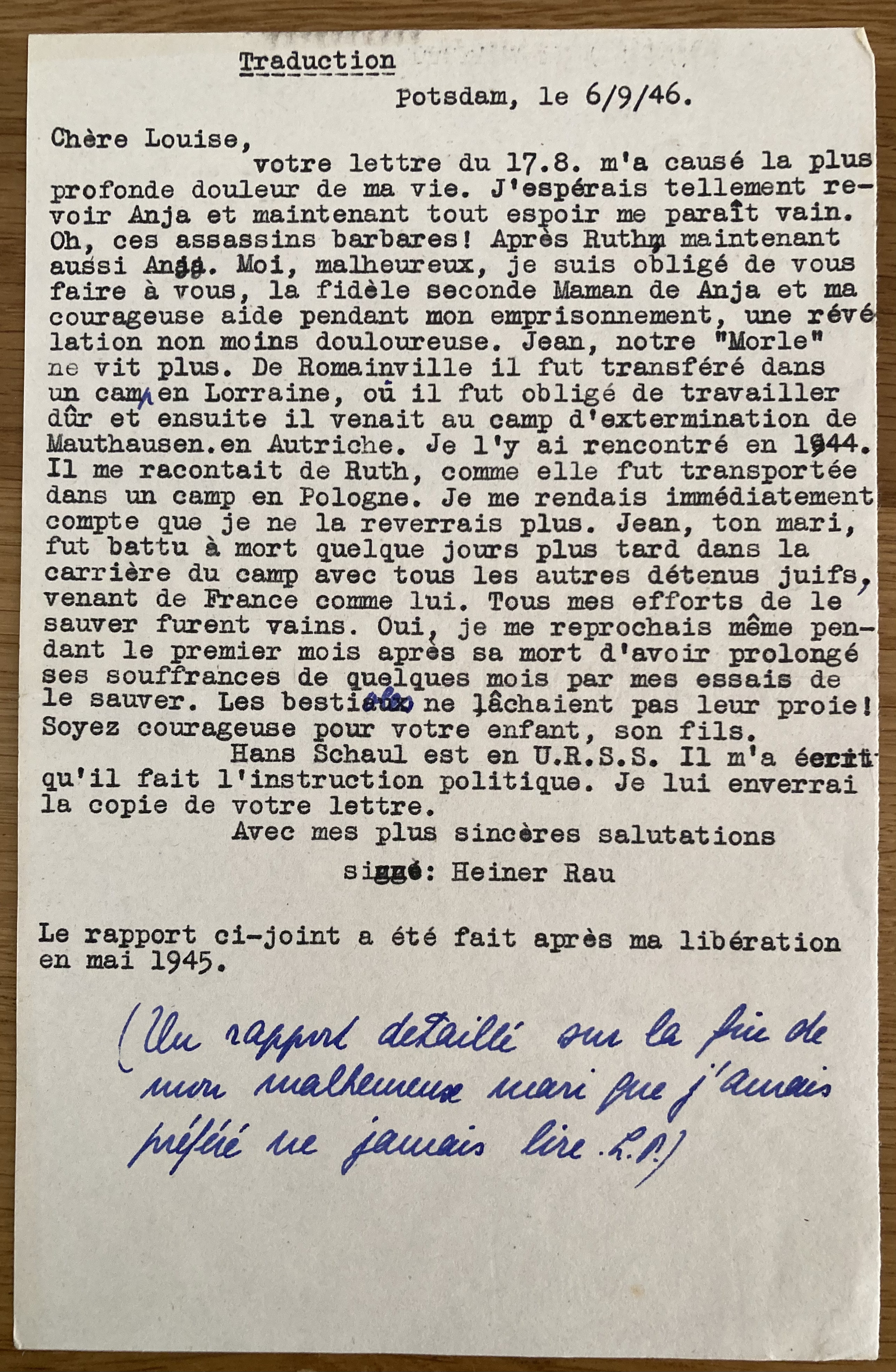 Traduction Postdam, le 6/9/46 Chère Louise votre lettre du 17.8 m’a causé la plus profonde douleur de ma vie. J’espérais tellement revoir Anja et maintenant tout espoir me paraît vain. Oh ces assassins barbares ! Après Ruth maintenant aussi Anja. Moi, malheureux, je suis obligé de vous faire à vous, la fidèle seconde Maman de Anja et ma courageuse aide pendant mon emprisonnement, une révélation non moins douloureuse. Jean, notre « Morle » ne vit plus. De Romainville, il fut transféré dans un camp en Lorraine, où il fut obligé de travailler dur et ensuite il venait au camp d’extermination de Mauthausen en Autriche. Je l’y ai rencontré en 1944. Il me racontait de Ruth, comme elle fut transportée dans un camp en Pologne. Je me rendais immédiatement compte que je ne la reverrais plus. Jean, ton mari, fut battu à mort quelques jours plus tard dans la carrière du camp avec tous les autres détenus juifs, venant de France comme lui. Tous mes efforts de le sauver furent vains. Oui, je me reprochais même pendant le premier mois après sa mort d’avoir prolongé ses souffrances de quelque mois par mes essais de le sauver. Les bestiales ne lâchaient pas leur proie ! Soyez courageuse pour votre enfant, son fils ! Hans Shaul est en U.R.S.S.. Il m’a écrit qu’il fait de l’instruction politique? Je lui enverrai la copie de votre lettre. Avec mes plus sincères salutations signé : Heiner RAU Le rapport ci-joint a été fait après ma libération en mai 1945. (Un rapport détaillé sur la fin de mon malheureux mari que j’aurai préféré ne jamais lire L.P.)