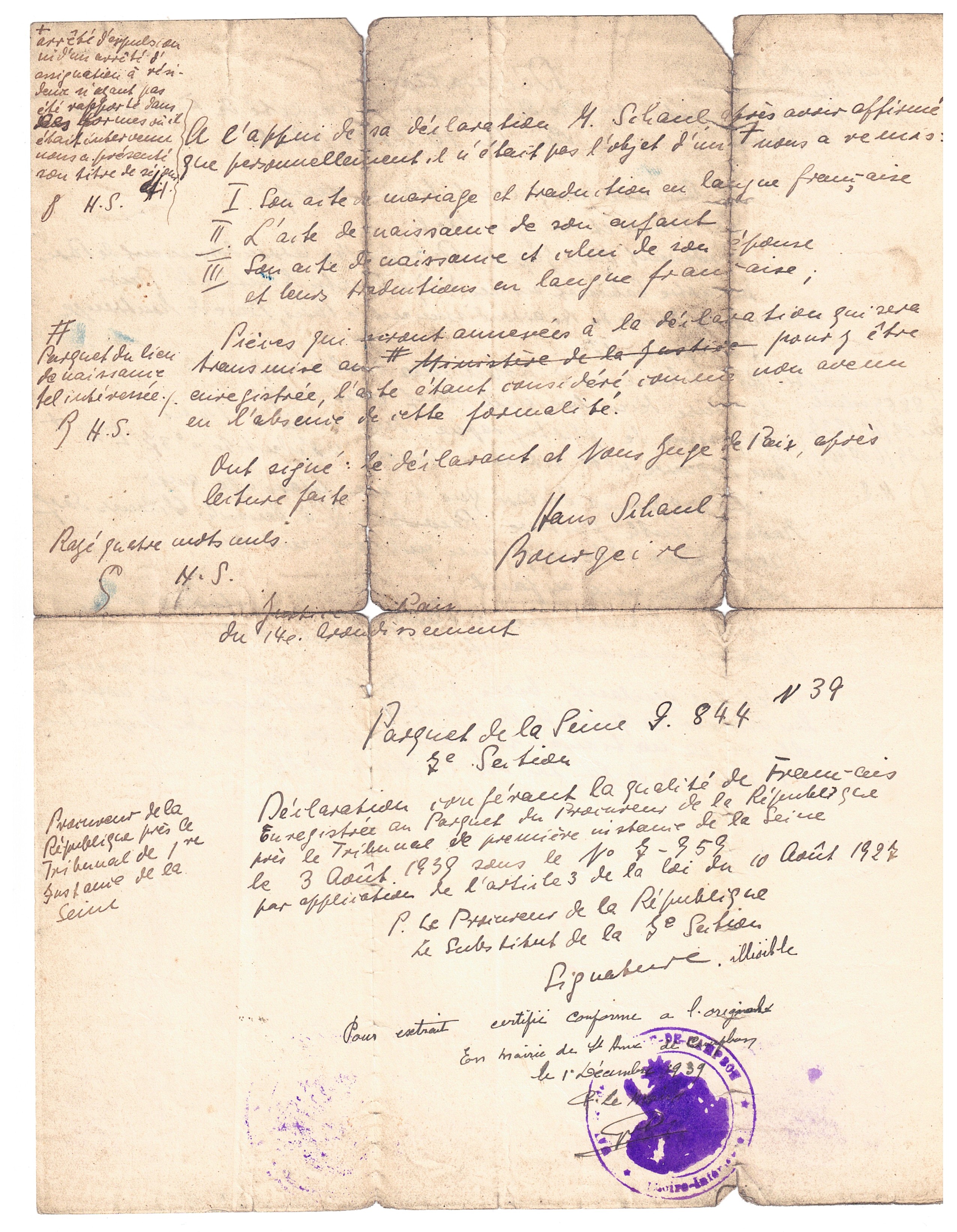 En juin 1939, Hans SCHAUL est replacé dans sa situation administrative d’origine et est donc autorisé à séjourner en France.