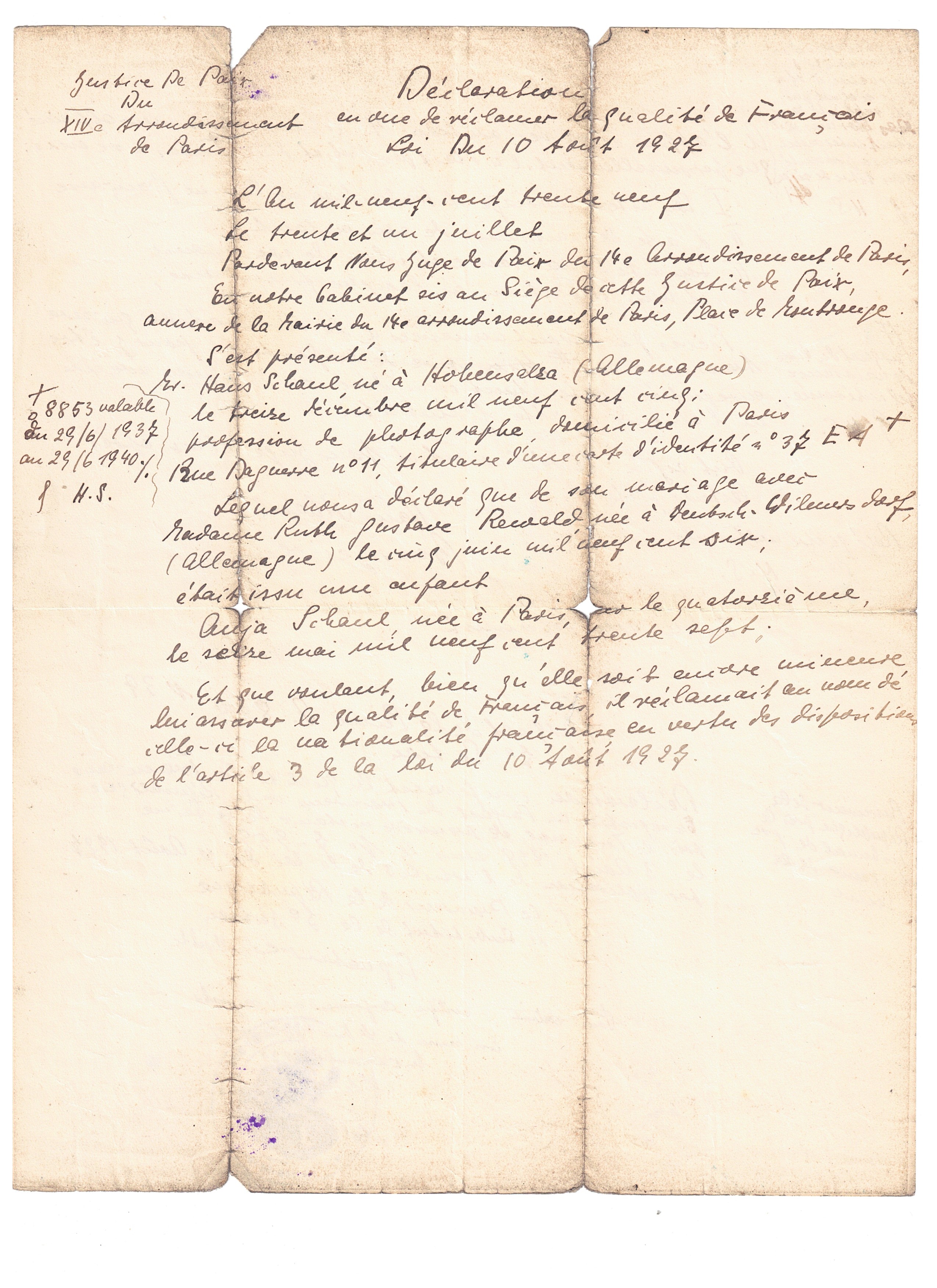 Les deux époux se font faire des cartes d’identité pour étrangers pour régulariser leur situation administrative. Leur fille, Anja SCHAUL naît le 16 mai 1937 à Paris dans le 14ème arrondissement.