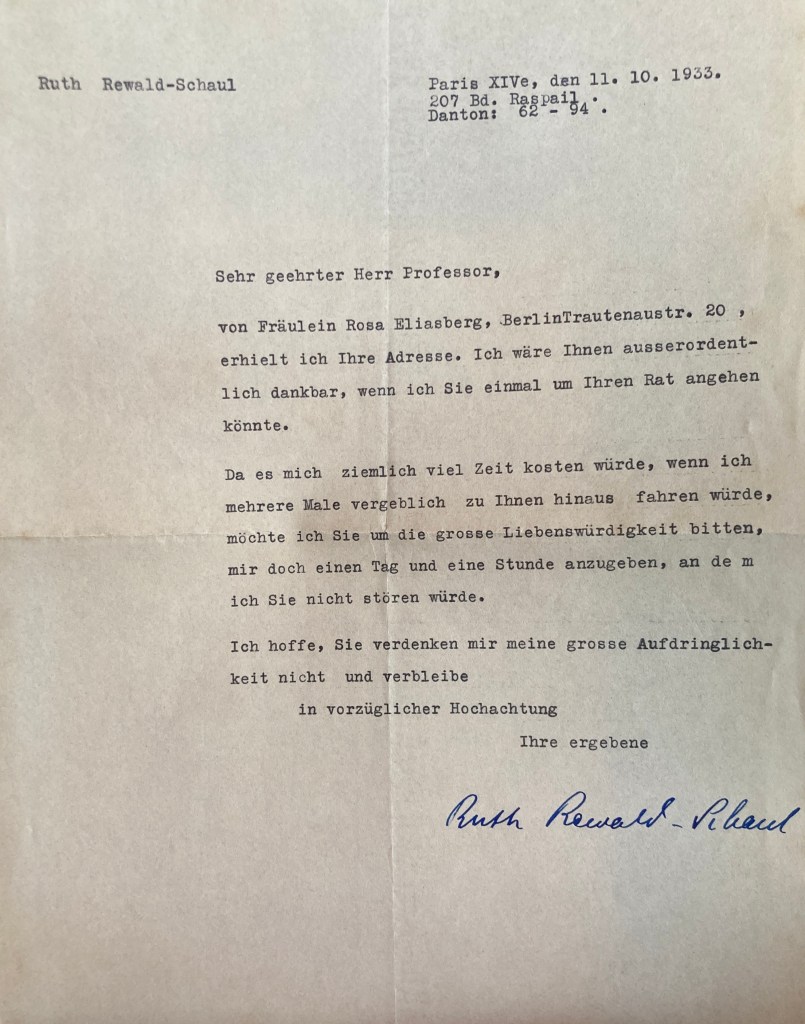 Ruth contacte Ignace MEYERSON à Paris peu de temps après son arrivée en octobre 1933 par l’intermédiaire de Rosa ELIASBERG (cousine d’Ignace MEYERSON) qui lui avait fourni son adresse. Ignace MEYERSON est directeur adjoint et professeur en 1929 à l’Ecole des Hautes Etudes en Sciences Sociales à Paris, Rosa ELIASBERG étant photographe à Berlin. Elle lui demande à cette occasion un rendez-vous.