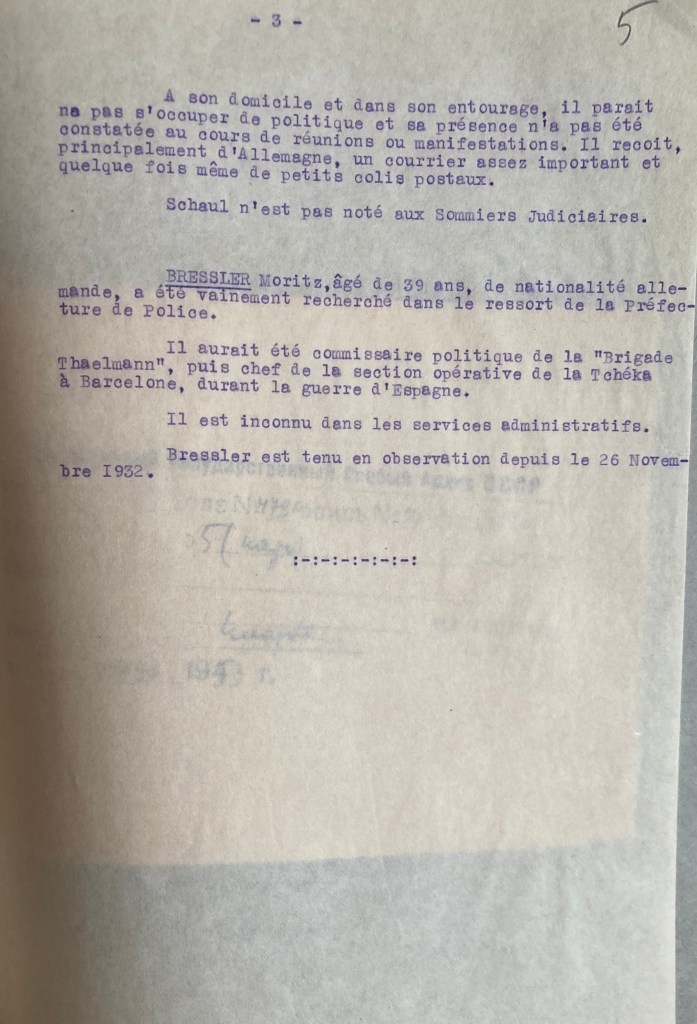 Hans SCHAUL est étroitement surveillé par la Préfecture de police de Paris avec son camarade Heinrich RAU : ancien député communiste au parlement allemand, interné de 1933 à 1936 en Allemagne, il s’évade et rejoint l’Espagne où il devient commandant de la XIème Brigade Internationale. A Paris, il est journaliste et correspondant permanent de l’Argentisches Tageblatt, journal anti-fasciste argentin et écrit également dans le Nueva Espana, organe anti-fascite à Buenos-Aires. Il est également vice-président du Comité d’Assistance aux Anciens Combattants Allemands et Autrichiens où Hans SCHAUL est trésorier. Ils sont suspectés d’être des agents de la GPU (police politique soviétique).