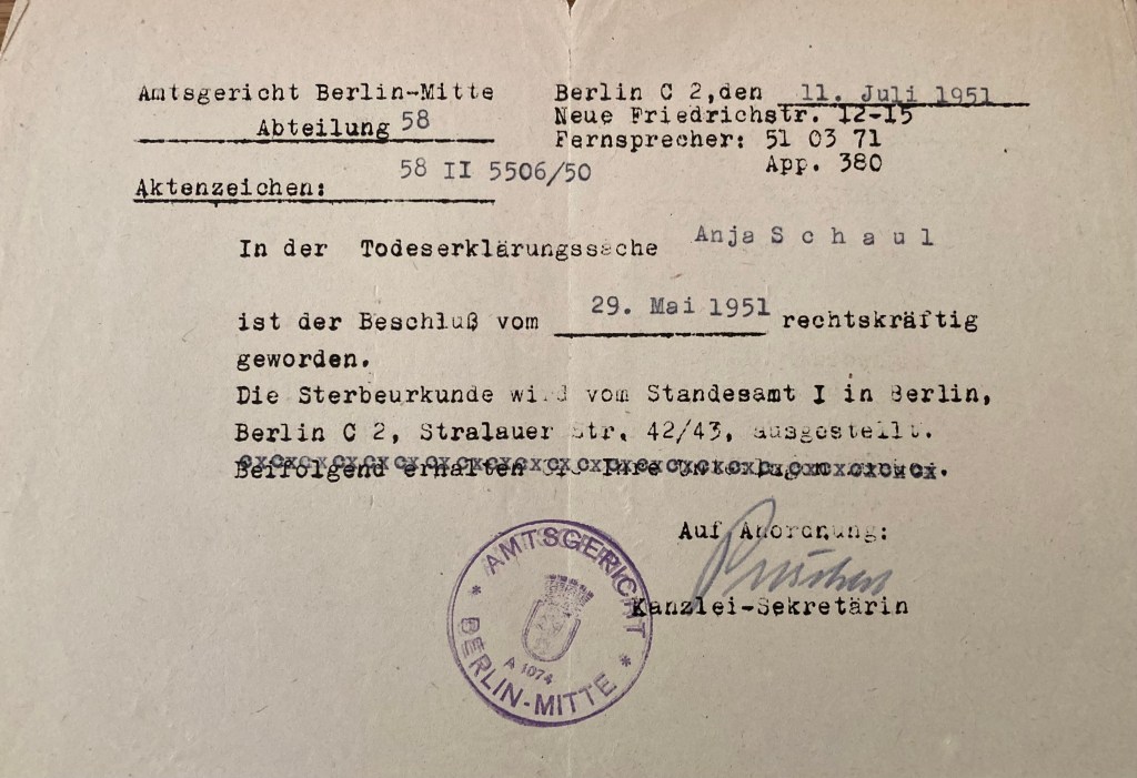 L’acte de décès d’Anja SCHAUL sera retranscrit en 2014. Aucune demande pour obtenir un statut de déporté politique n’a été effectuée auprès du Ministère des Anciens Combattants et Victimes de Guerre.