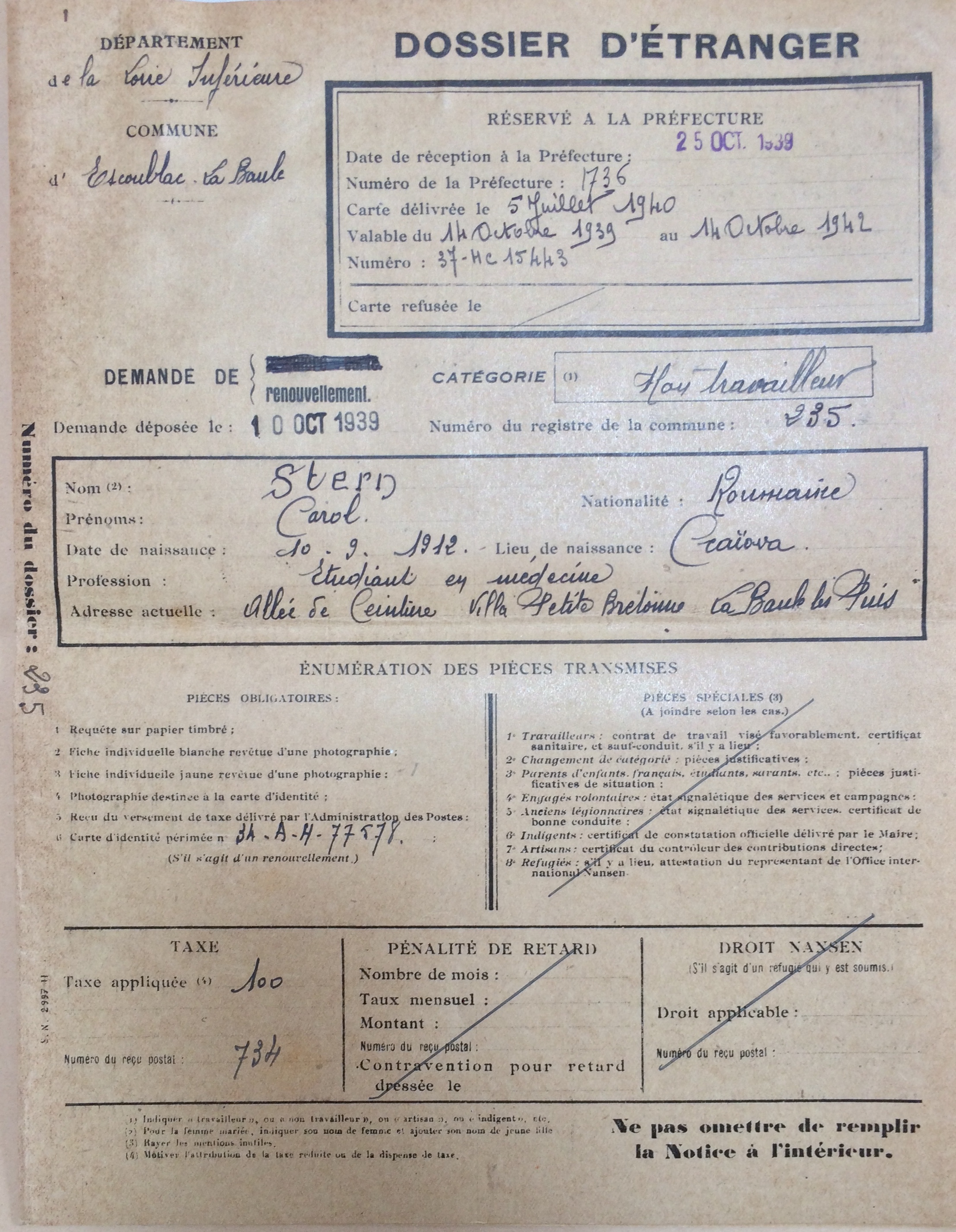 Carol STERN est recensé entre le 27 septembre et le 20 octobre 1940 à la sous-préfecture de Saint-Nazaire sous le numéro 8 et exerce alors la profession de médecin assistant