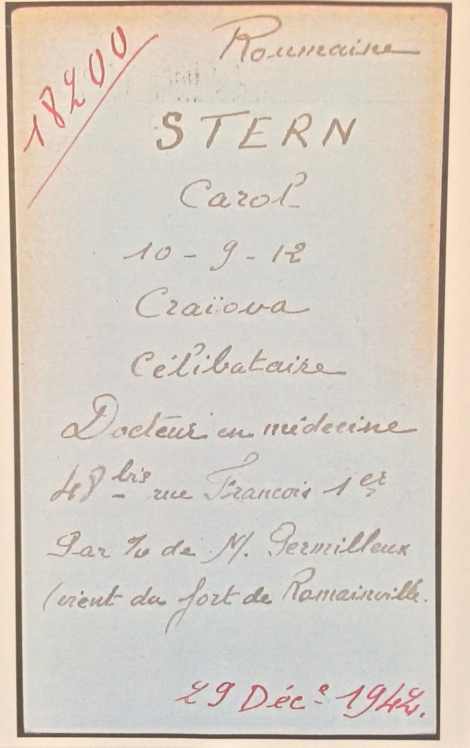 Carol STERN est né le 10 septembre 1912 à Craïova (Roumanie). [Père : Albert STERN et mère : Eva ZWIEBEL]. Il est présent en France depuis le 01 août 1930 et est étudiant en médecine en France à la Faculté de médecine de Paris depuis le 29 octobre 1931. En 1939, il a effectué tous les stages et il ne lui reste plus qu’à soutenir sa thèse pour pouvoir exercer. Il sera psychiatre et travaillera à l’Hôpital Sainte-Anne. Carol STERN est célibataire mais vit en concubinage en 1942 avec Mademoiselle Lise DUPLESSY et est en instance de naturalisation.