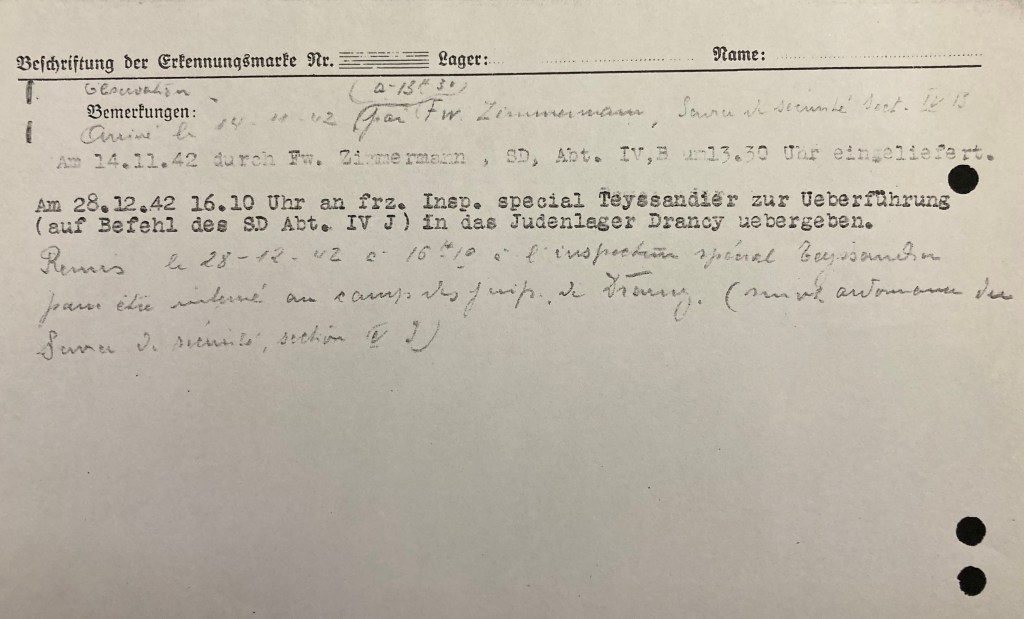 Il est transféré le 29 décembre 1942 sur ordre de Monsieur Permilleux [Commissaire Permilleux, responsable du service des affaires juives à la Préfecture de police de Paris] et remis à l’inspecteur spécial TEYSSANDIER pour être interné au « Camp des Juifs » de Drancy (sur ordonnance du SD, section IV J)