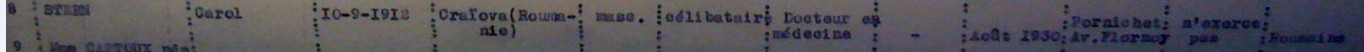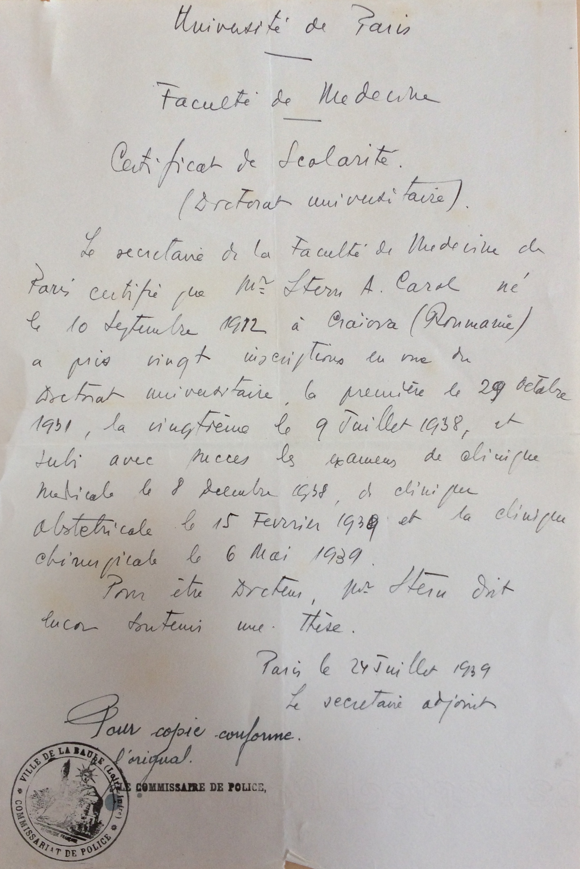 Carol STERN est né le 10 septembre 1912 à Craïova (Roumanie). [Père : Albert STERN et mère : Eva ZWIEBEL]. Il est présent en France depuis le 01 août 1930 et est étudiant en médecine en France à la Faculté de médecine de Paris depuis le 29 octobre 1931. En 1939, il a effectué tous les stages et il ne lui reste plus qu’à soutenir sa thèse pour pouvoir exercer. Il sera psychiatre et travaillera à l’Hôpital Sainte-Anne. Carol STERN est célibataire mais vit en concubinage en 1942 avec Mademoiselle Lise DUPLESSY et est en instance de naturalisation.