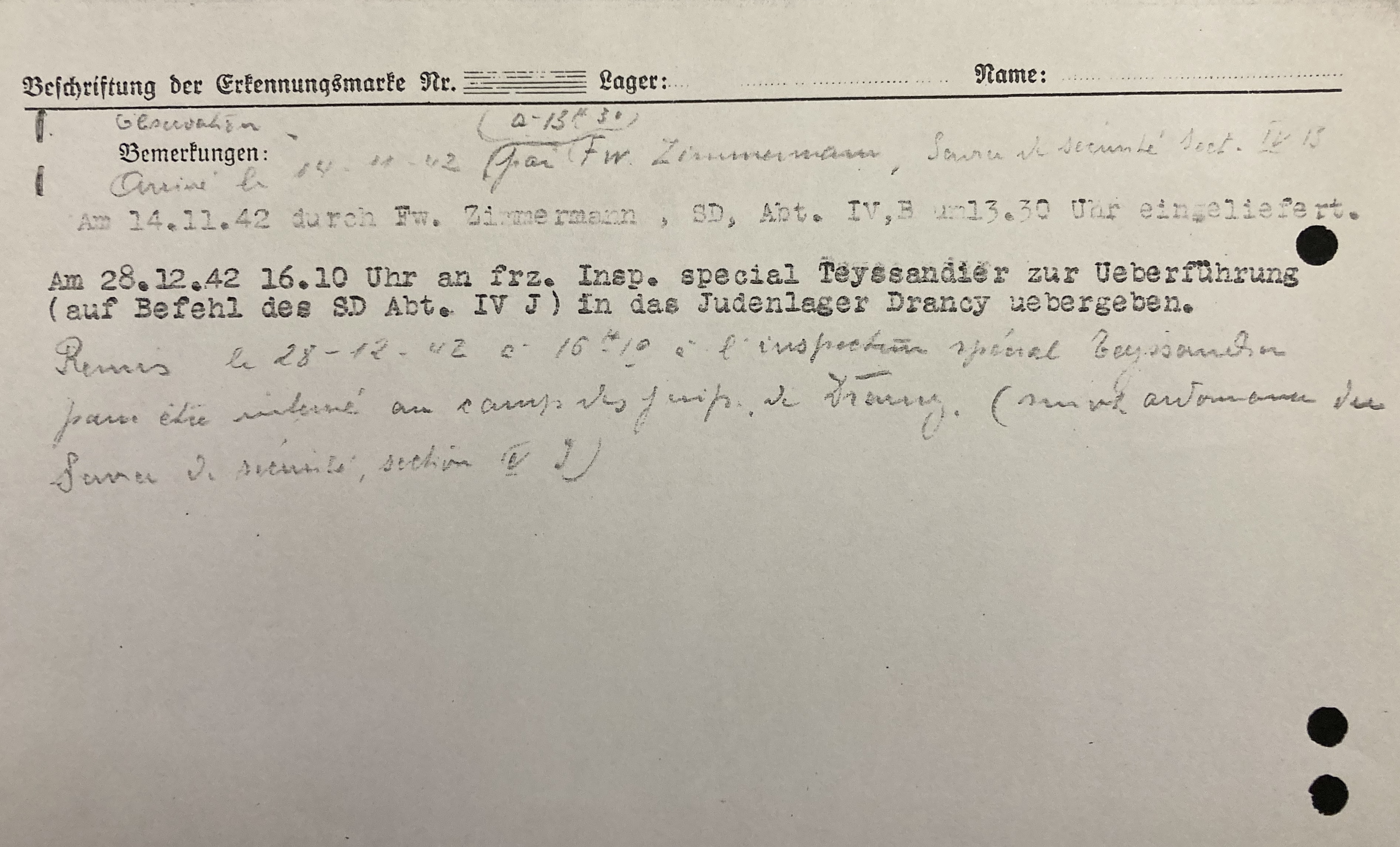 Il est transféré le 29 décembre 1942 sur ordre de Monsieur Permilleux [Commissaire Permilleux, responsable du service des affaires juives à la Préfecture de police de Paris] et remis à l’inspecteur spécial TEYSSANDIER pour être interné au « Camp des Juifs » de Drancy (sur ordonnance du SD, section IV J)