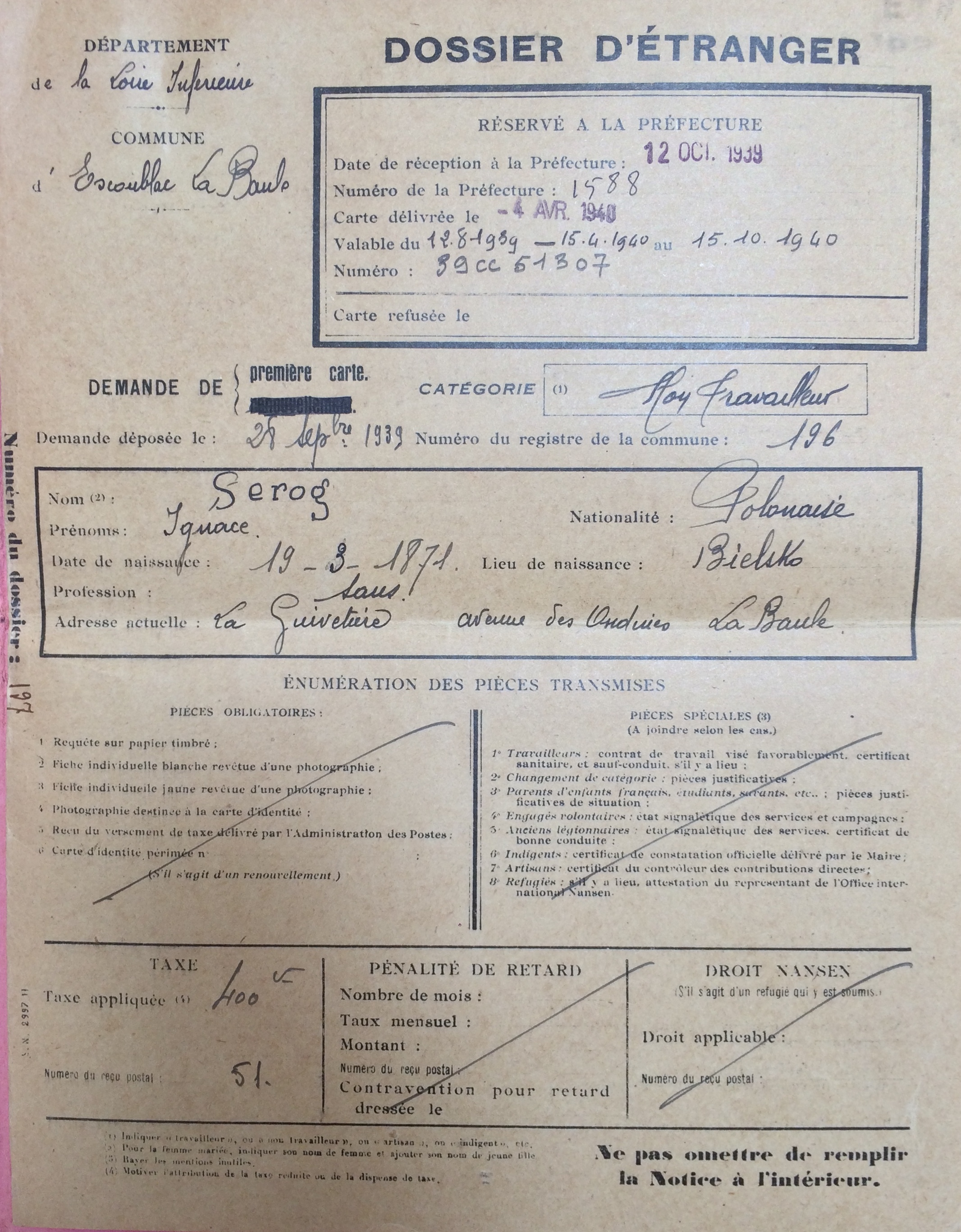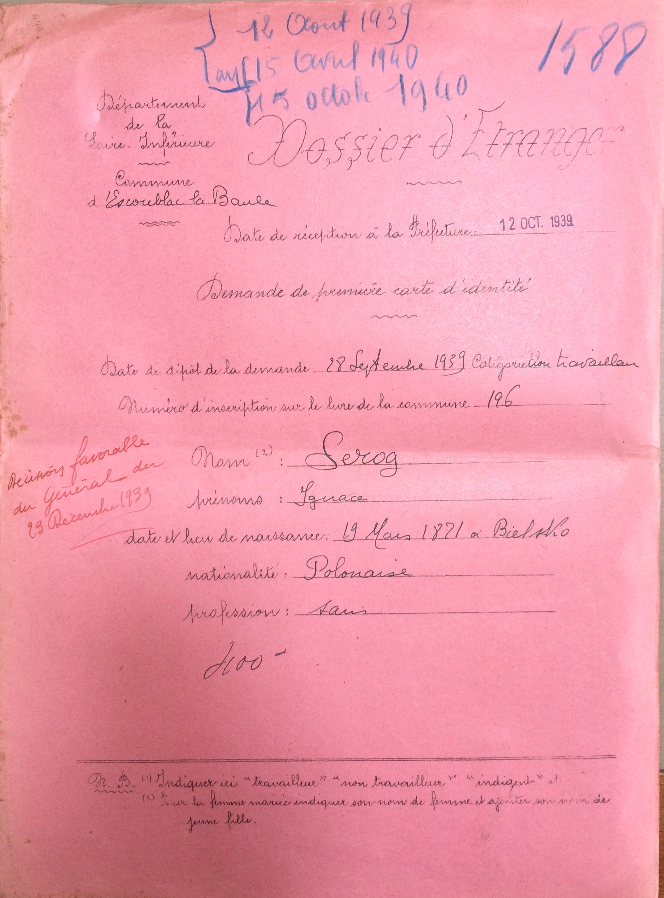 La carte d’identité de SEROG Ignace lui est remise le 22 avril 1940 alors que pour son épouse, celle-ci est toujours en attente au 14 octobre 1940.