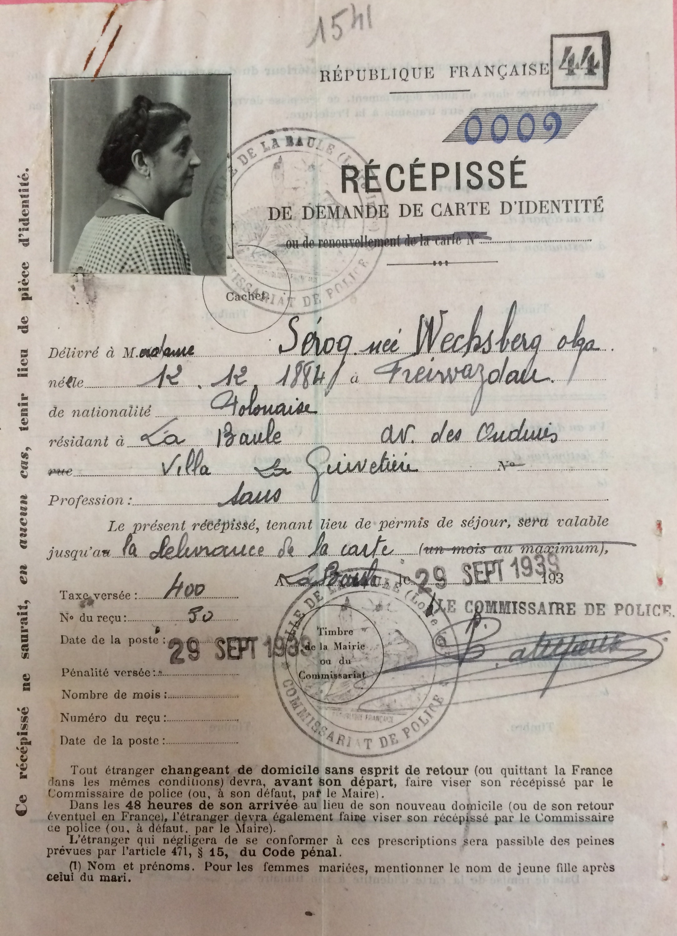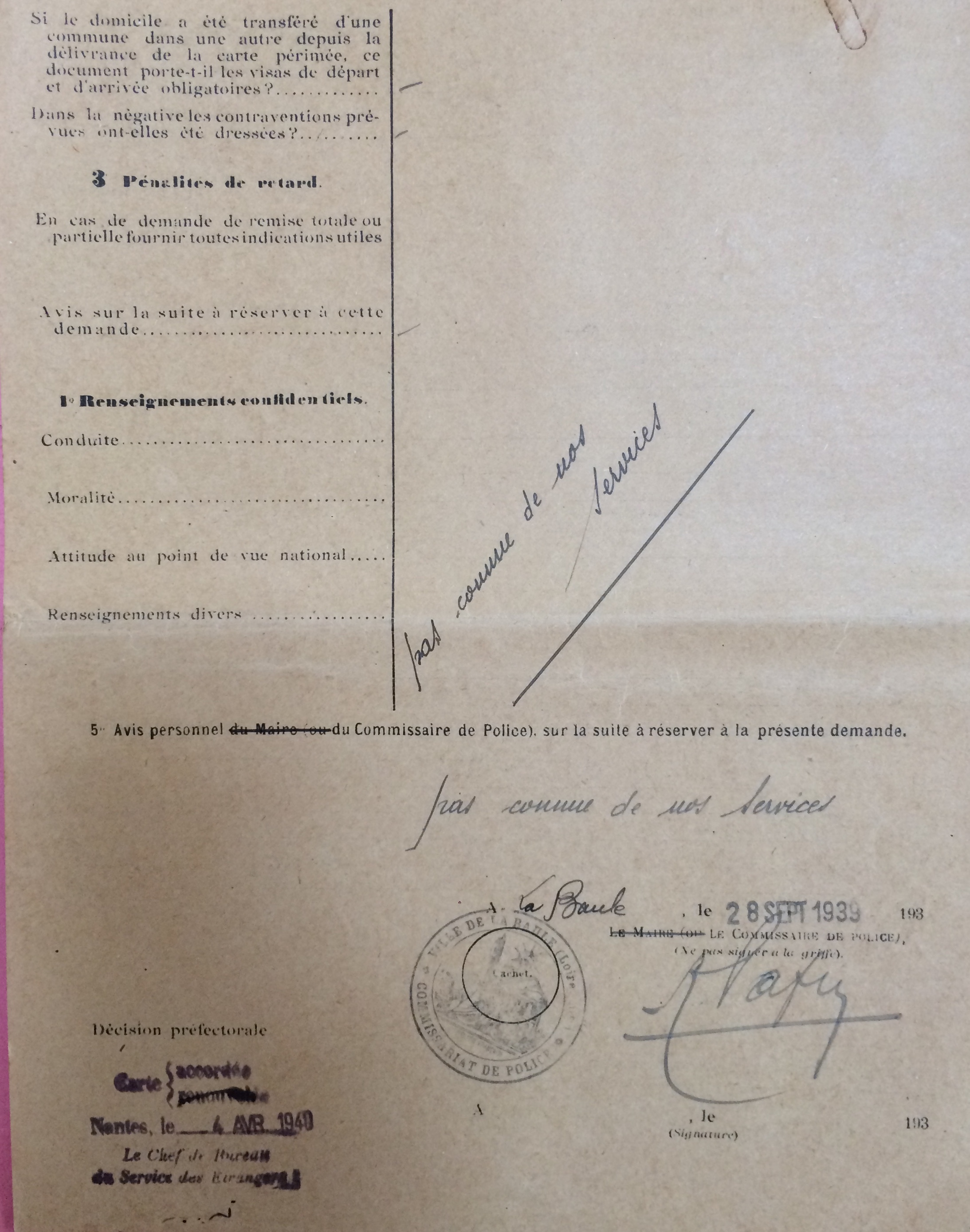 Ils déposent une première demande carte d’identité pour étranger le 28 septembre 1939 déposée au Commissariat de Police de La Baule et transmise à la sous-préfecture. Ils résident alors Villa La Guivetière avenue des Ondines.